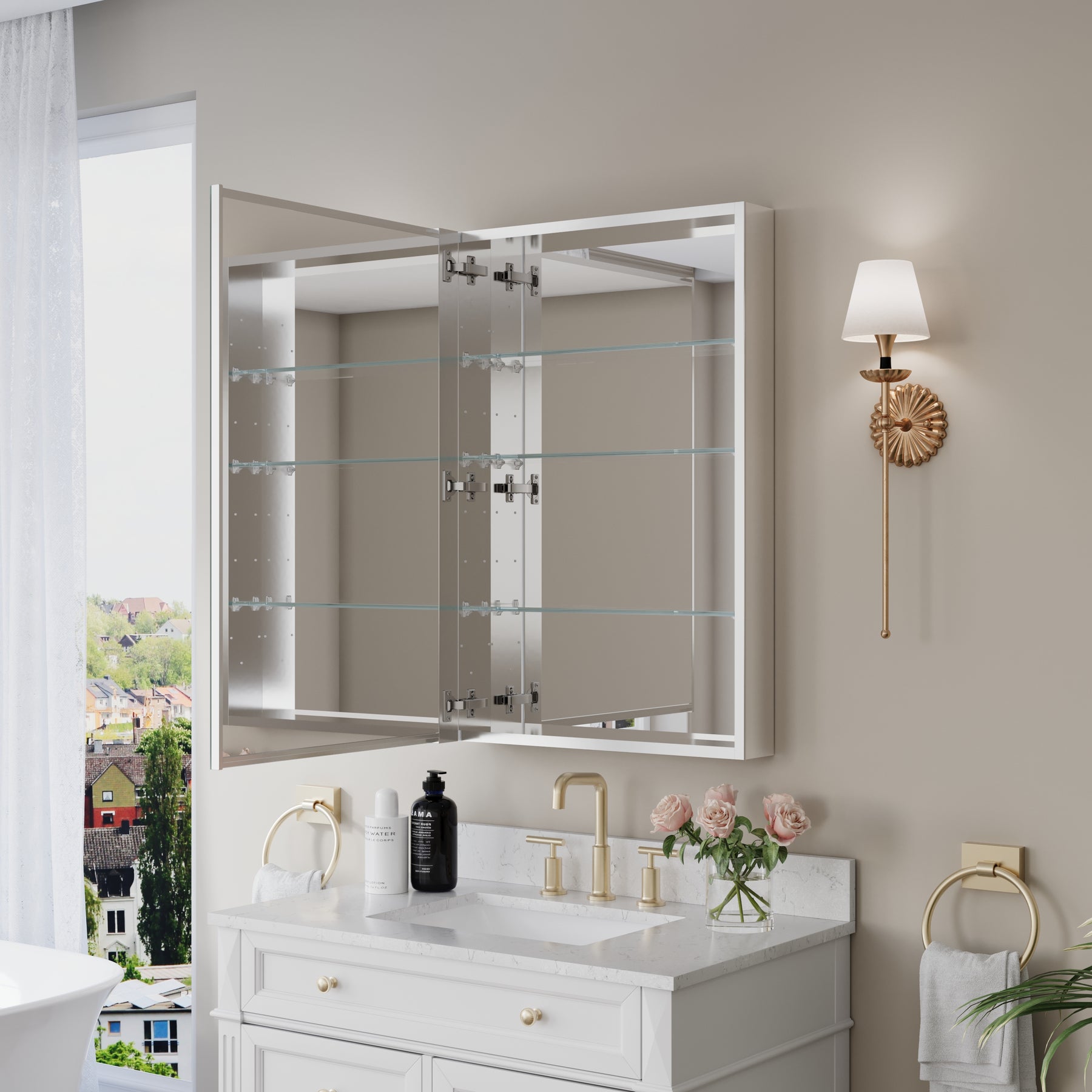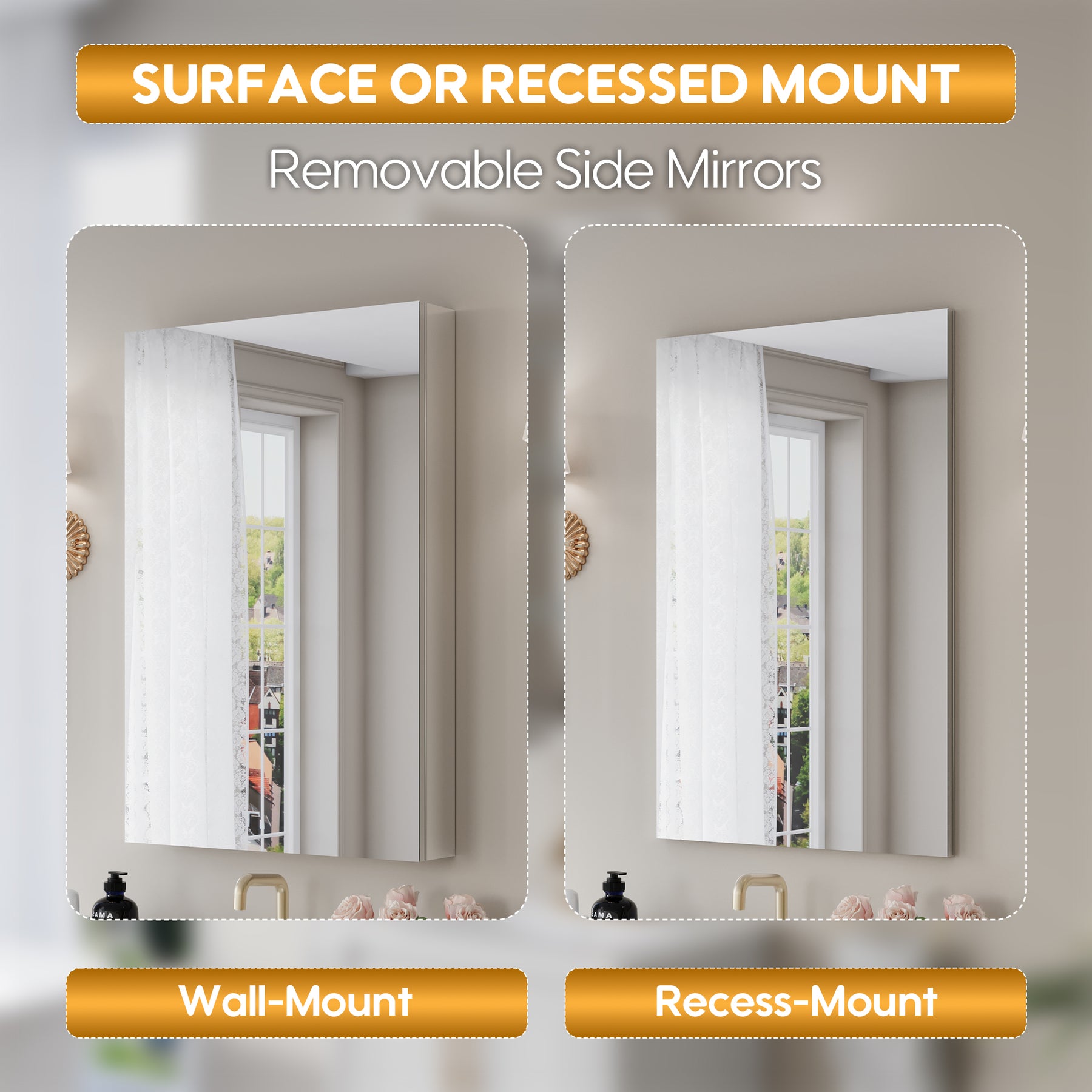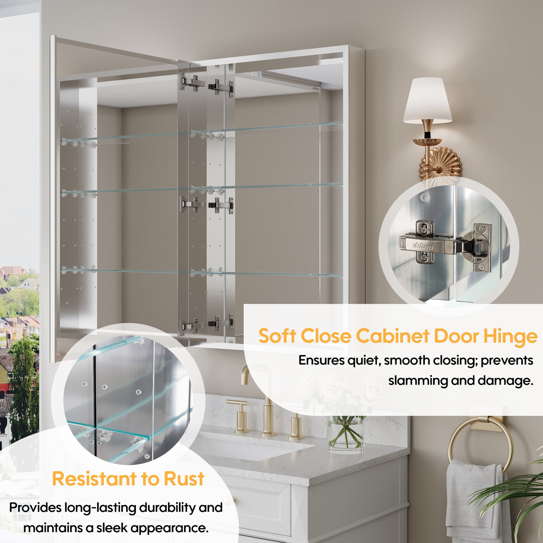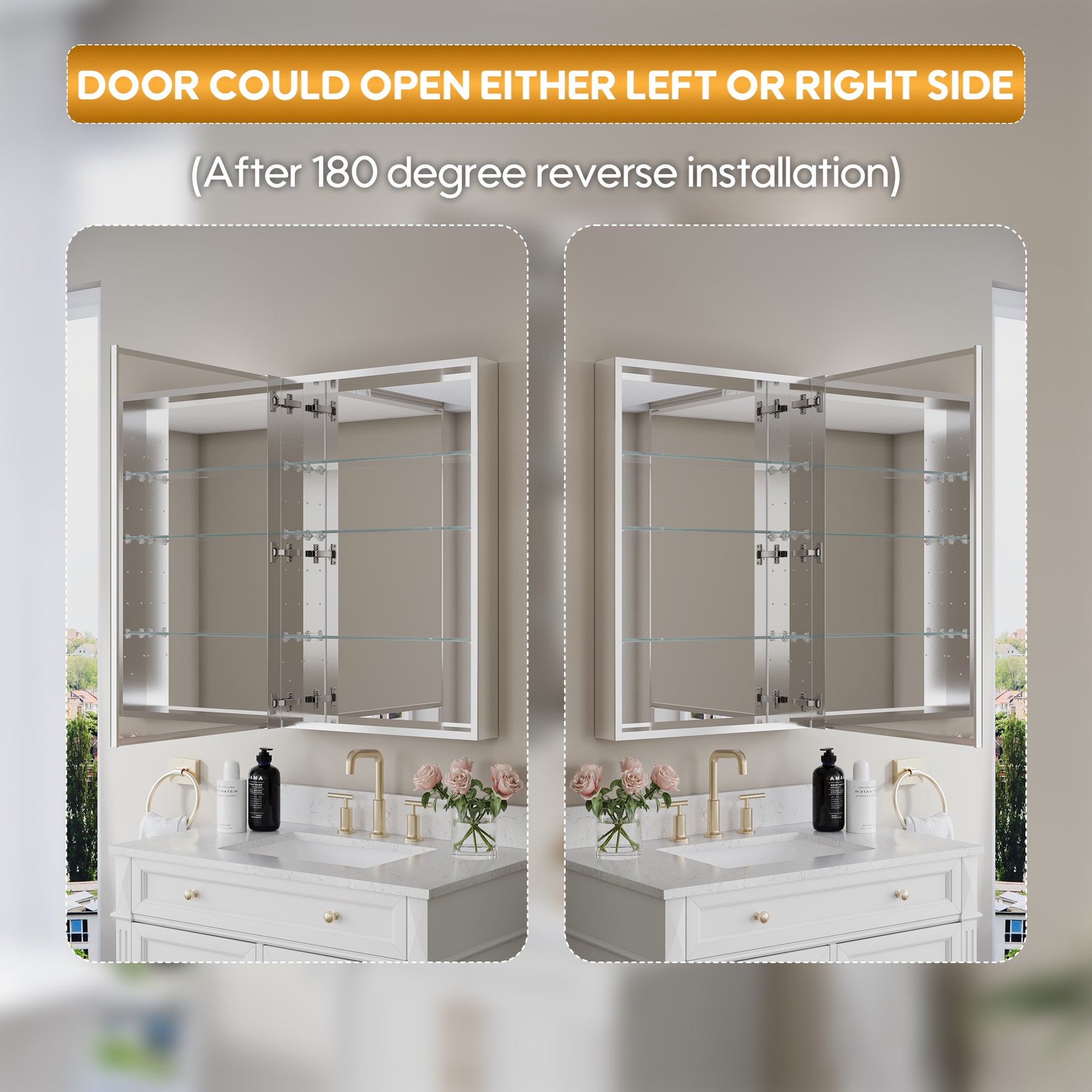 - Reversible Door Design: Copper-free tri-view mirror cabinet with 180° reversible installation, allowing the door to open from either the left or right side for flexible bathroom layouts.