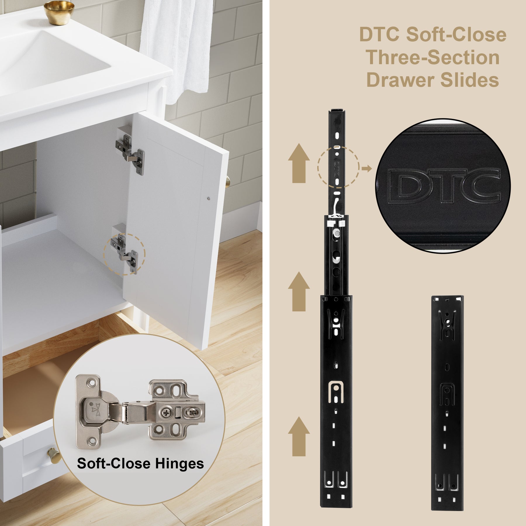 - Ample Storage Space: This single-basin bathroom cabinet comes with 2 soft-close doors and 1 drawer—ensuring no annoying noise during use, for a smooth, quiet experience. The drawer slides are DTC metal-made, paired with golden handles. This modern style cabinet delivers a superior feel that ordinary bathroom cabinets can hardly match.