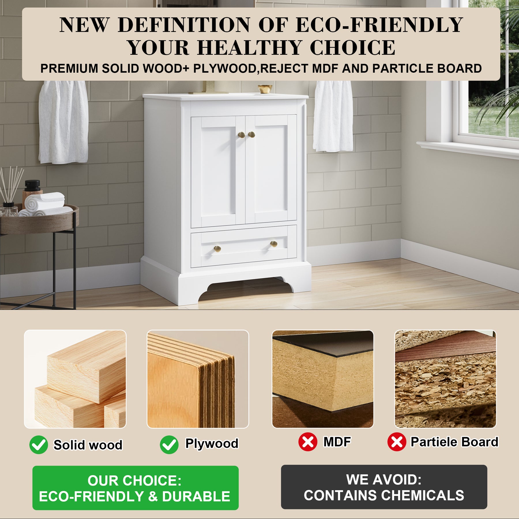 Premium Solid Wood Structure: Crafted from solid wood and plywood material for outstanding durability and moisture resistance, ensuring a long-lasting and stable vanity. 100% free of MDF and particle board for a healthier, stronger, and more eco-friendly bathroom solution.