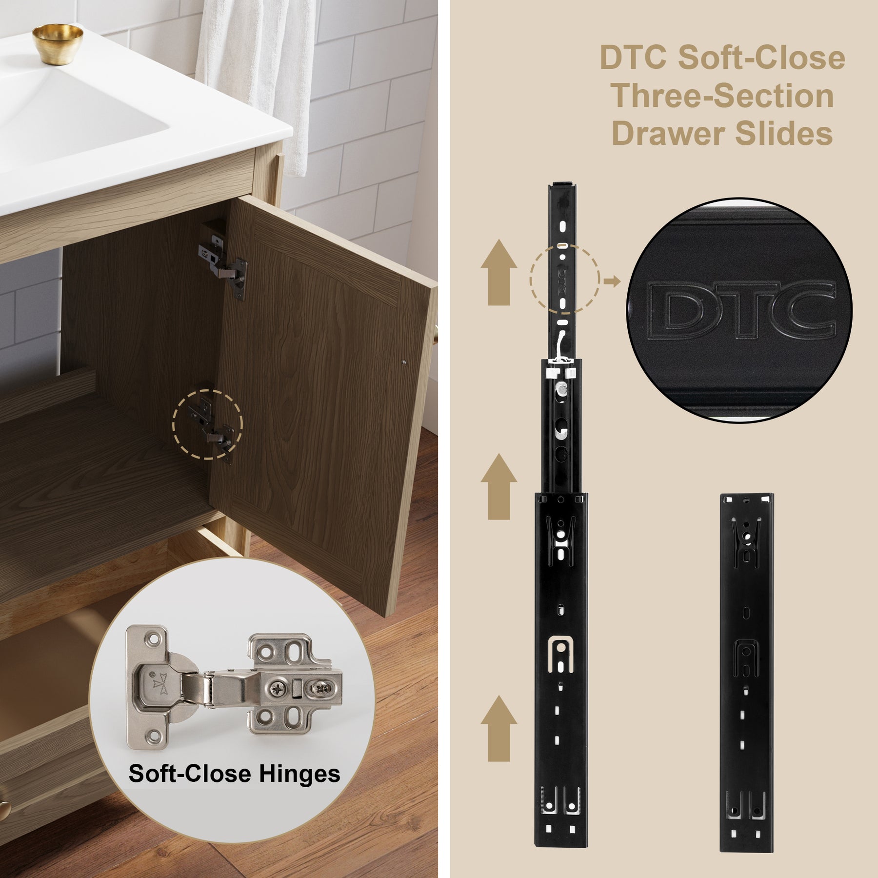 - Hardware Material: DTC soft-closing three-section drawer slides and soft-closing door hinges