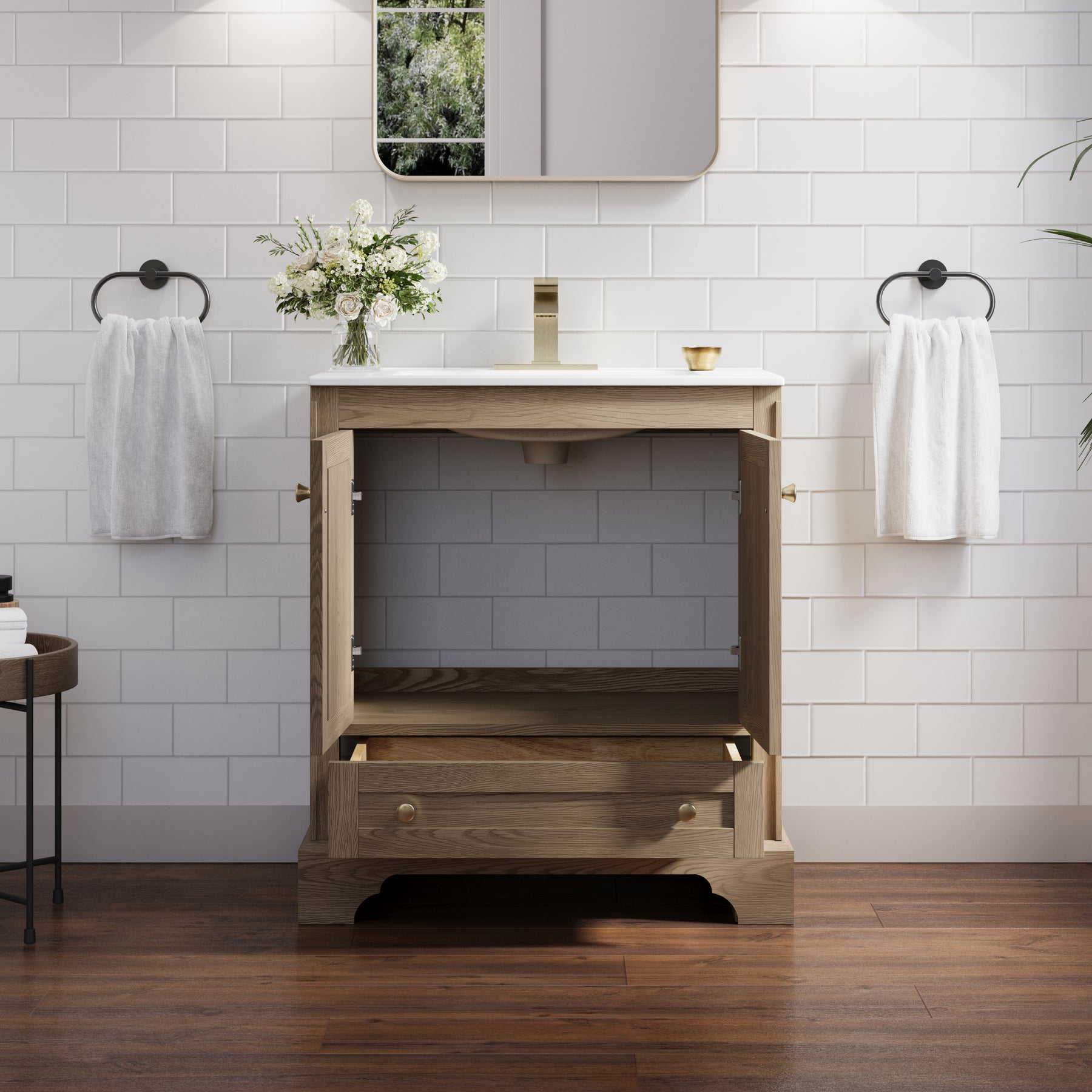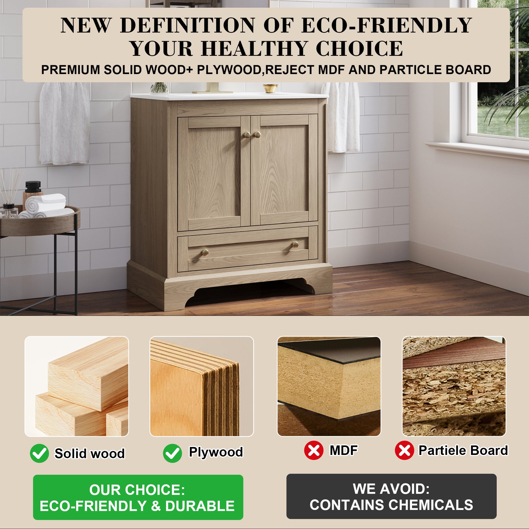 - Premium Solid Wood Structure: Crafted from durable oak solid wood and high-quality plywood with oak veneer detailing, delivering exceptional strength, stability, and an elevated natural wood appearance. 100% free of MDF and particle board for a healthier, stronger, and more eco-friendly bathroom solution.
