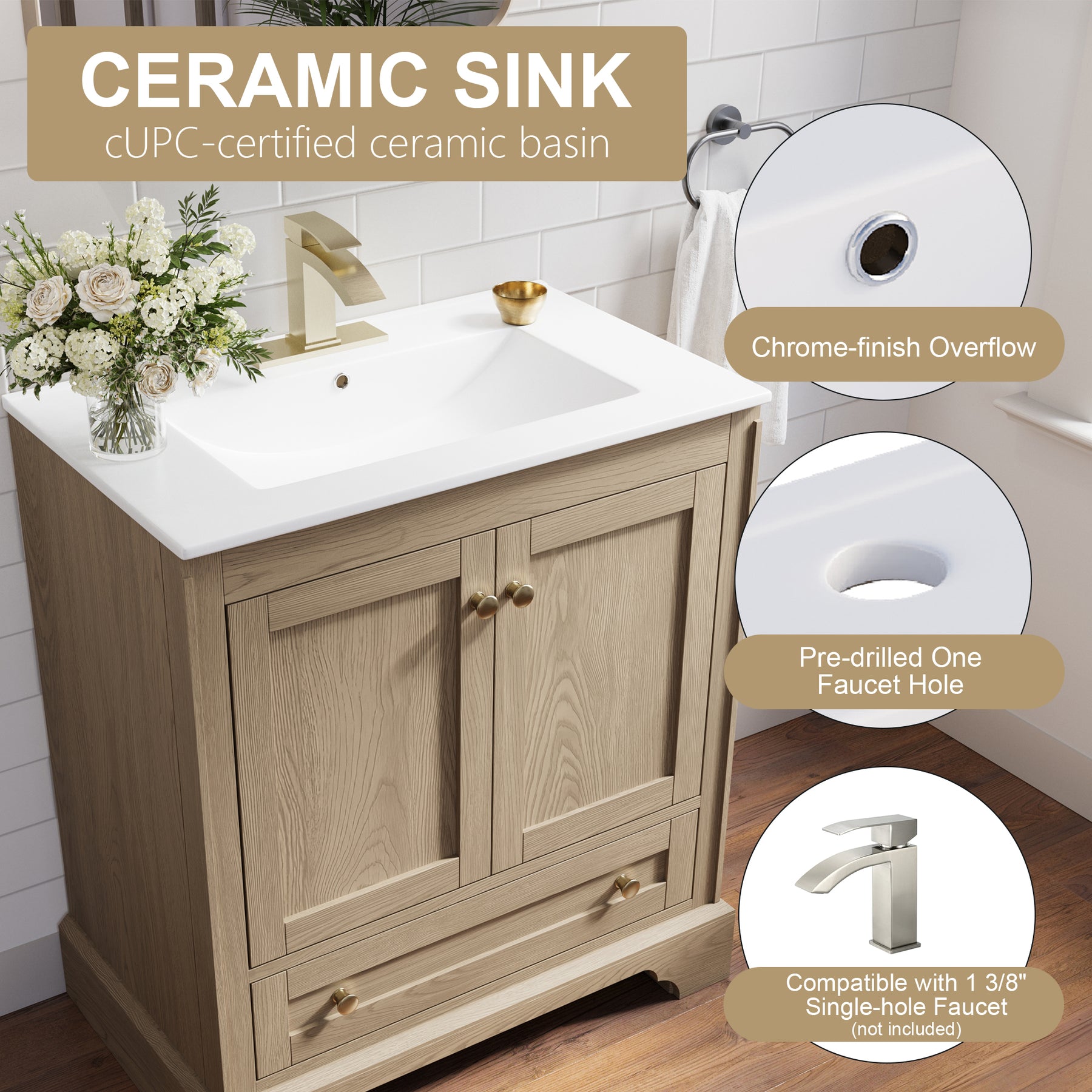 - Upgrade Ceramic Material Basin: Our bathroom vanity with sink include a premium cUPC-certified ceramic basin for easy maintenance and lasting shine. Features pre-drilled faucet hole and a drain hole, making it easy to install your faucet and drainage system.