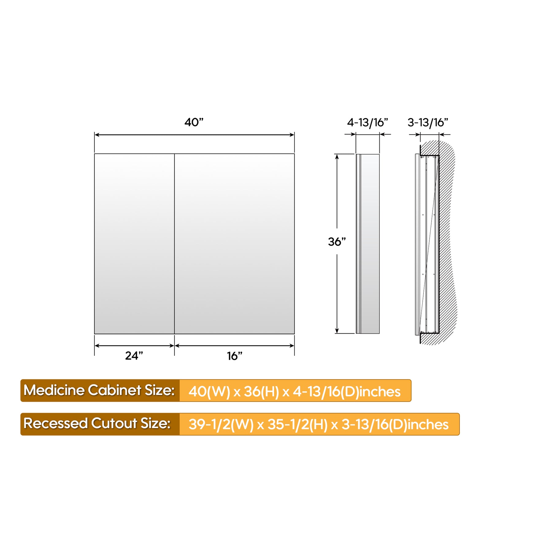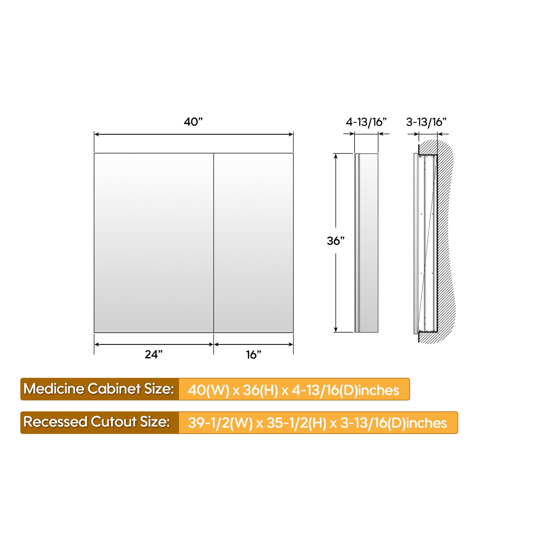 - Recess Rough-In Size: 39 1/2" x 3 13/16" x 35 1/2".