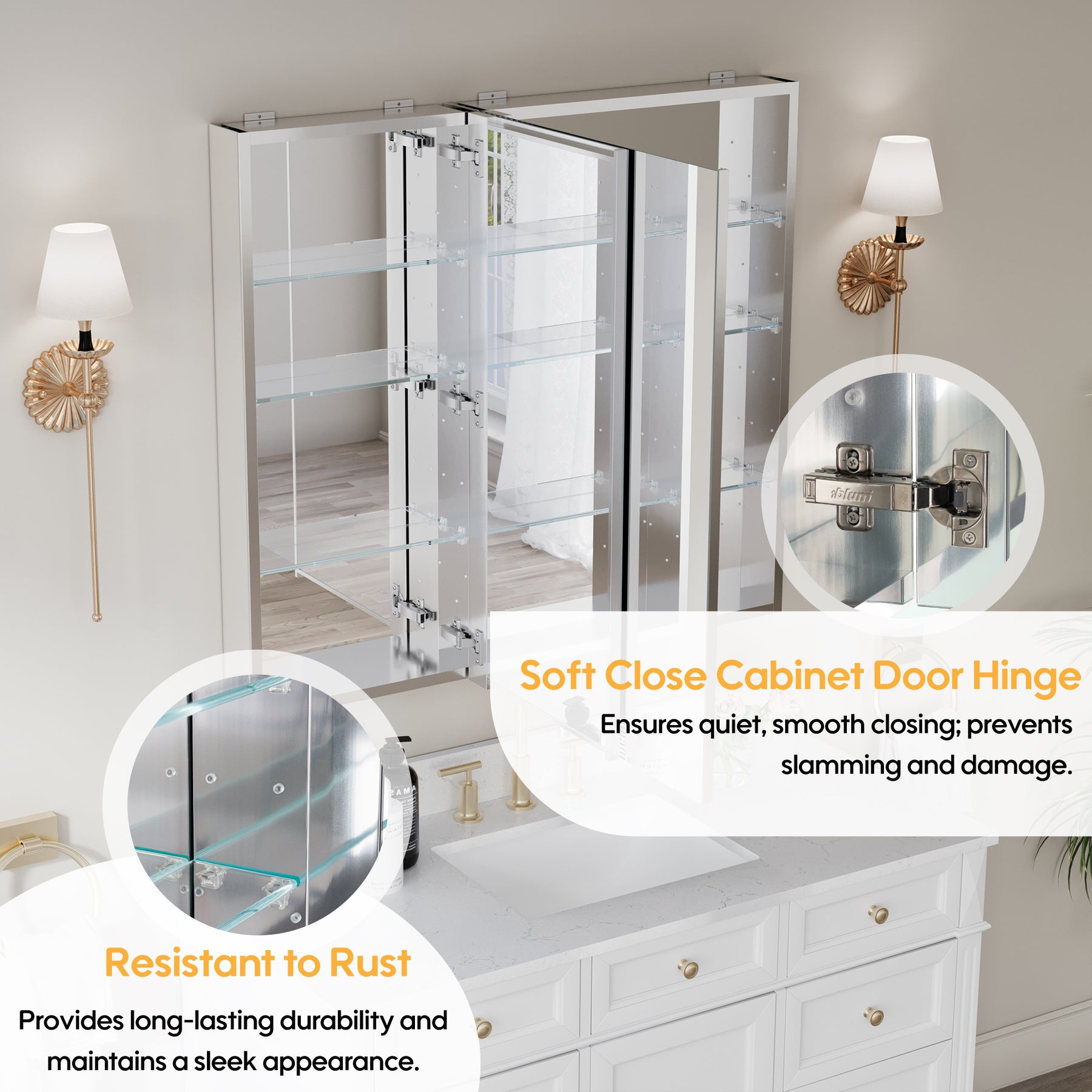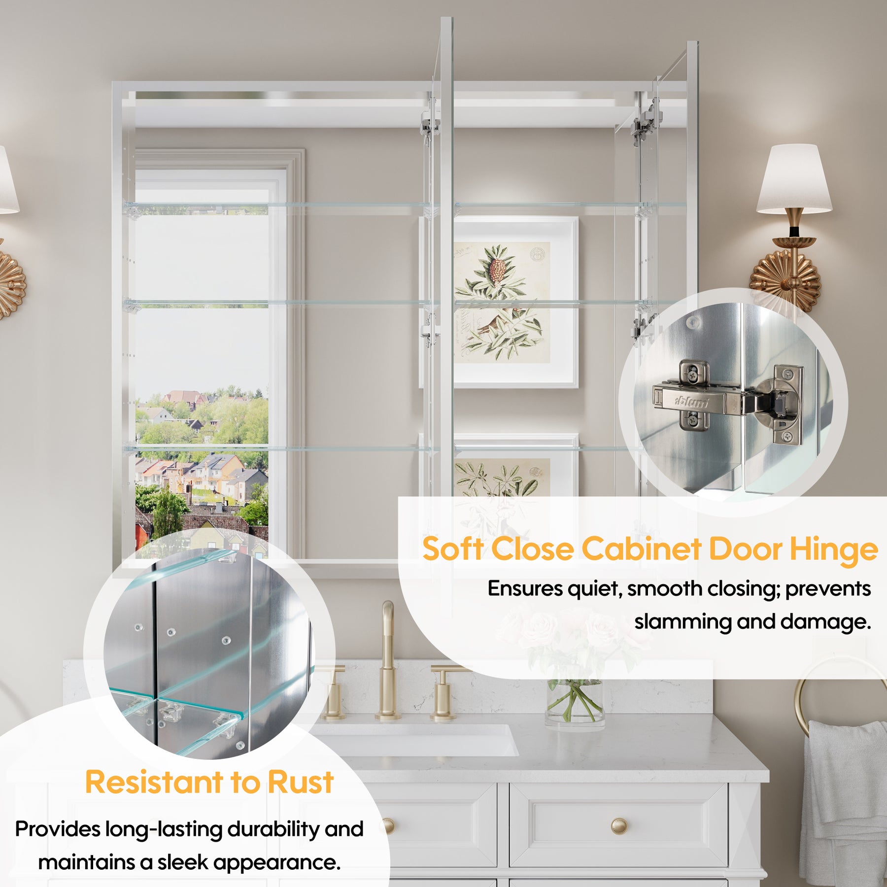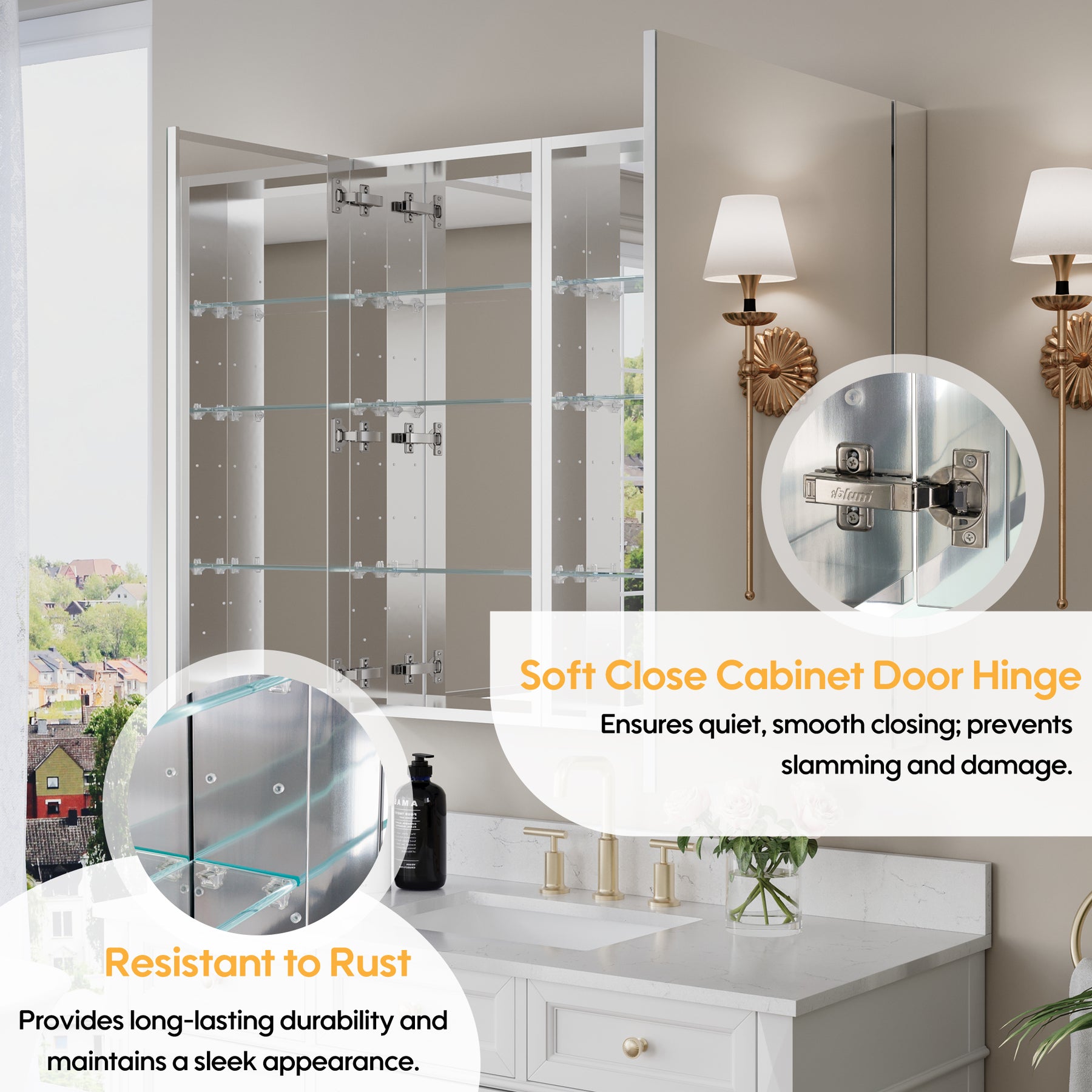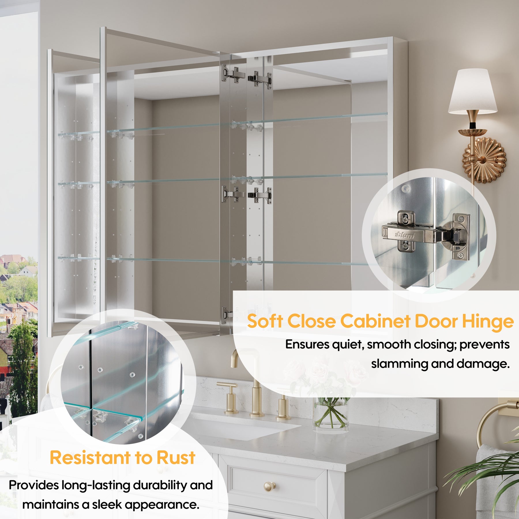 - Reversible Door Design: Copper-free tri-view mirror cabinet with 180° reversible installation, allowing the door to open from either the left or right side for flexible bathroom layouts.