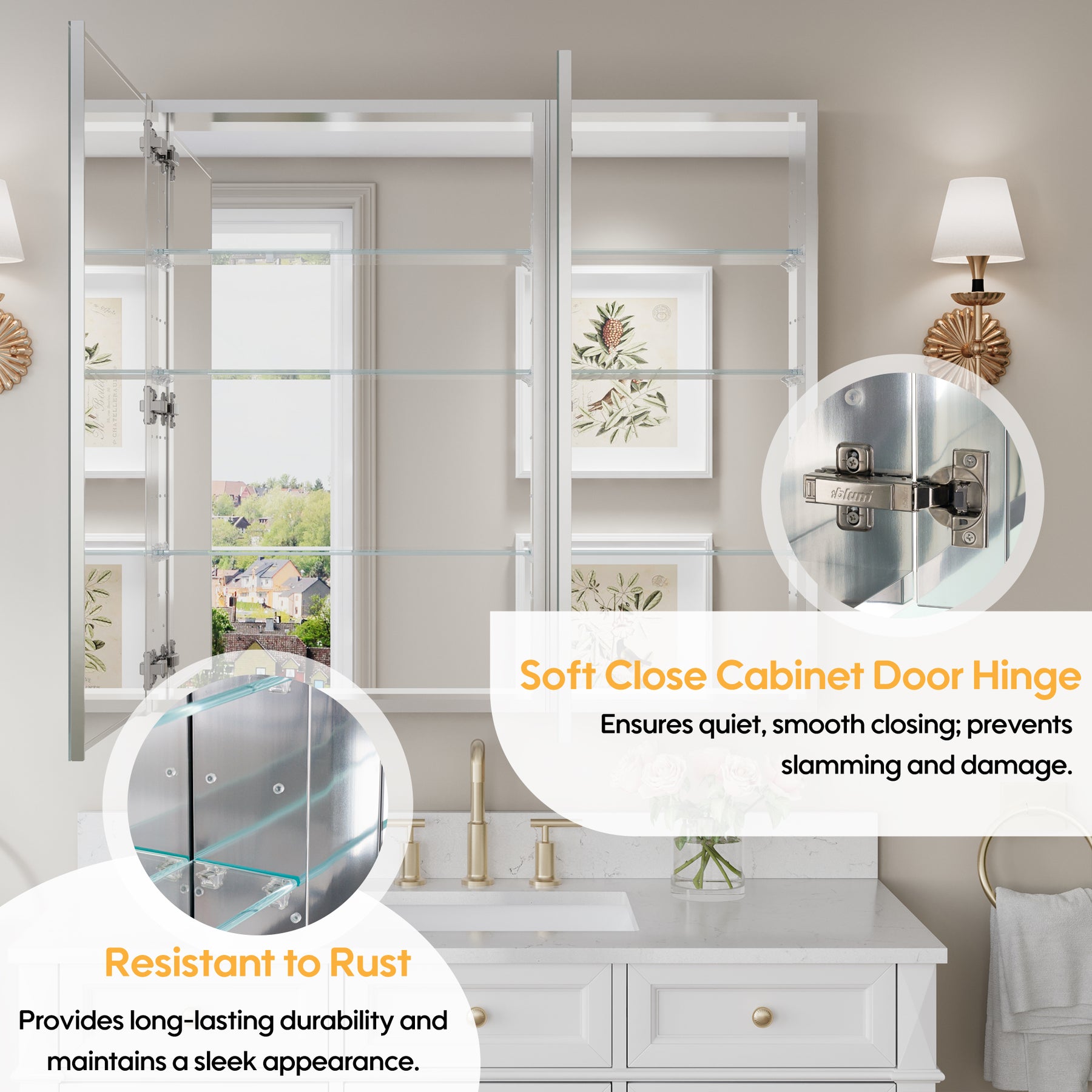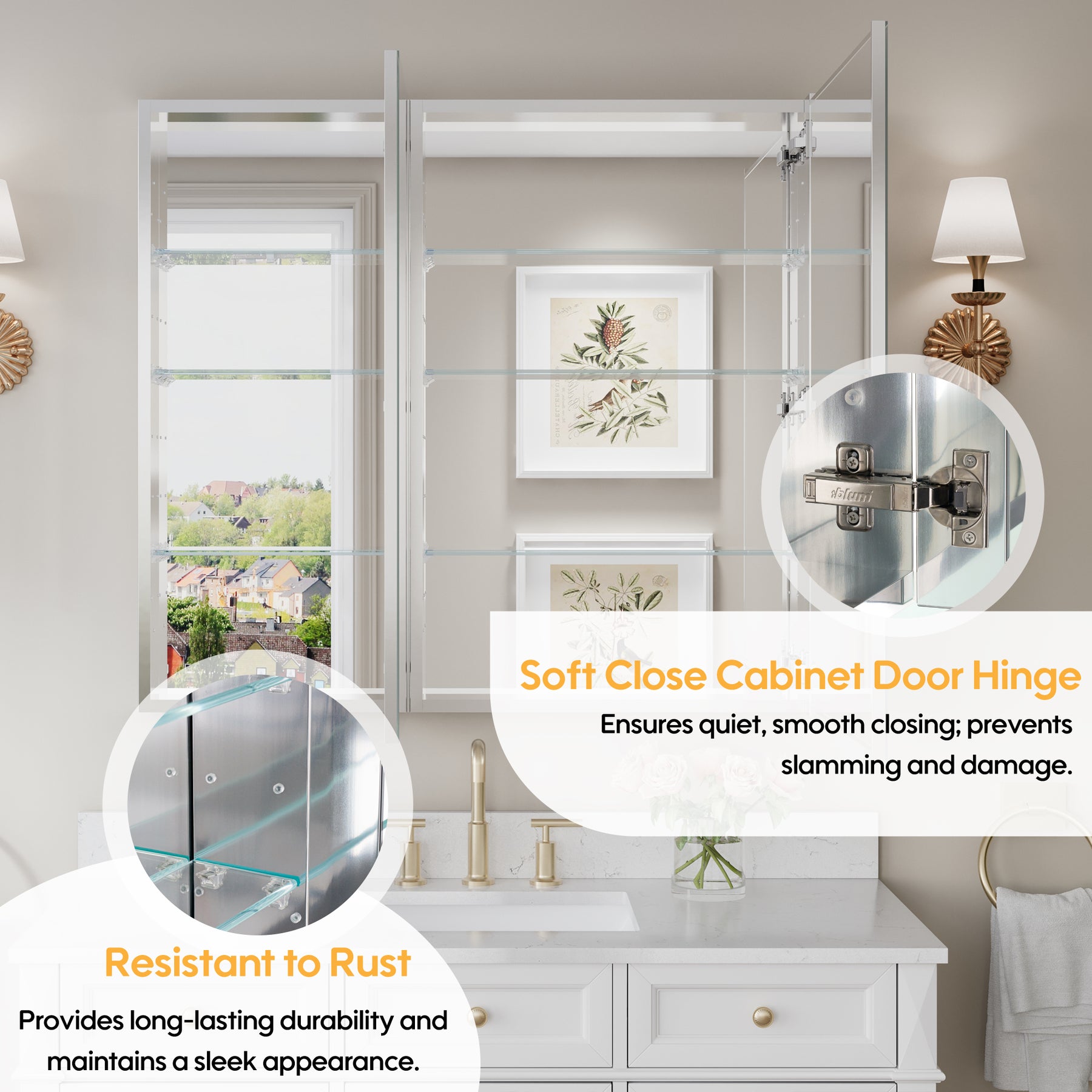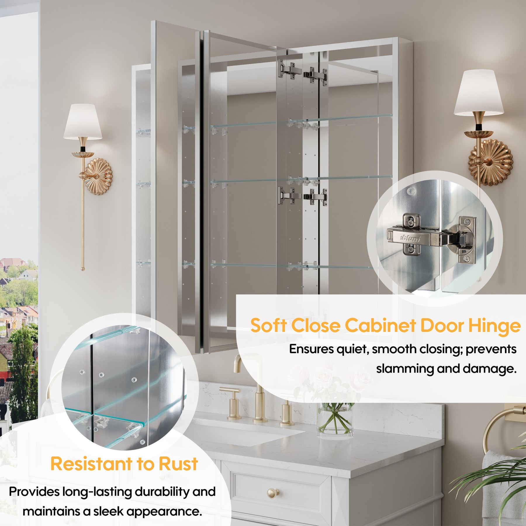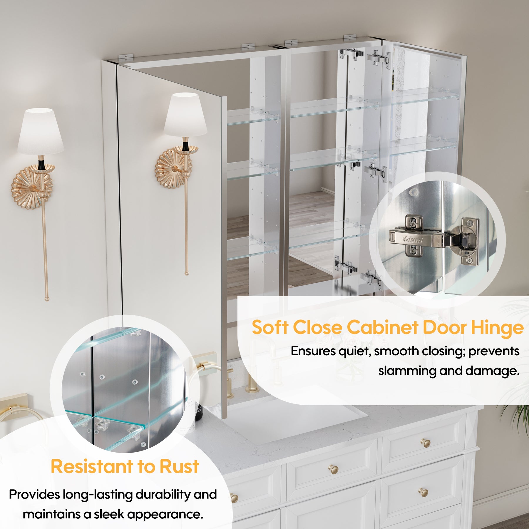 - Reversible Door Design: Copper-free tri-view mirror cabinet with 180° reversible installation, allowing the door to open from either the left or right side for flexible bathroom layouts.