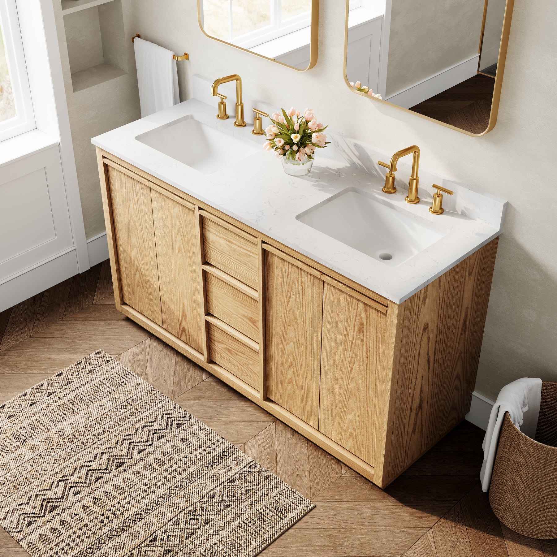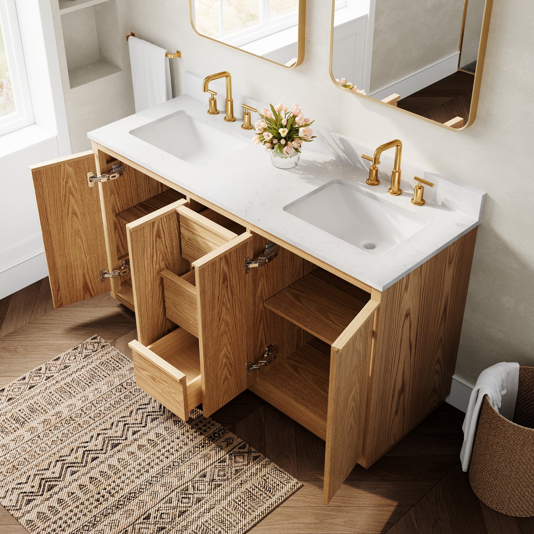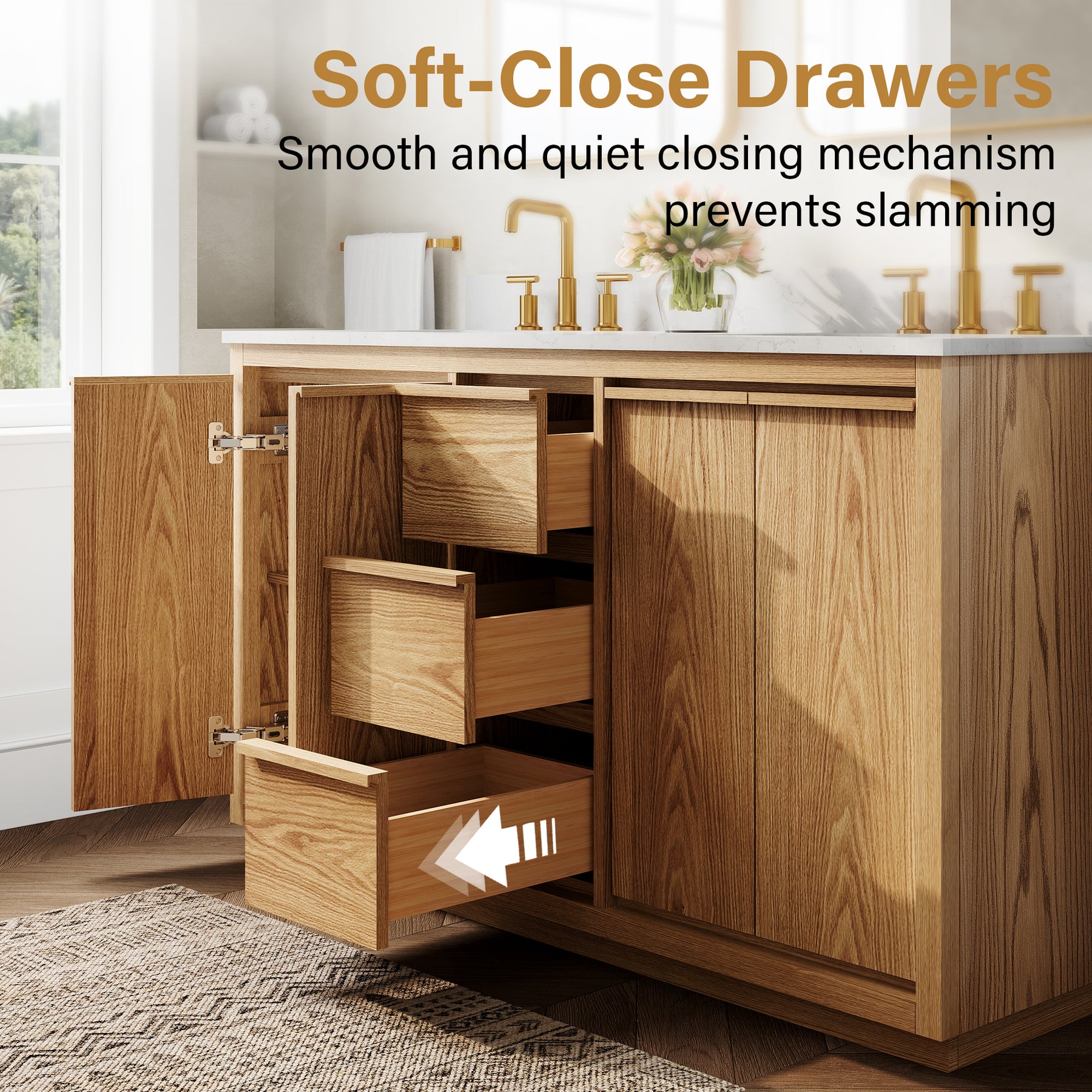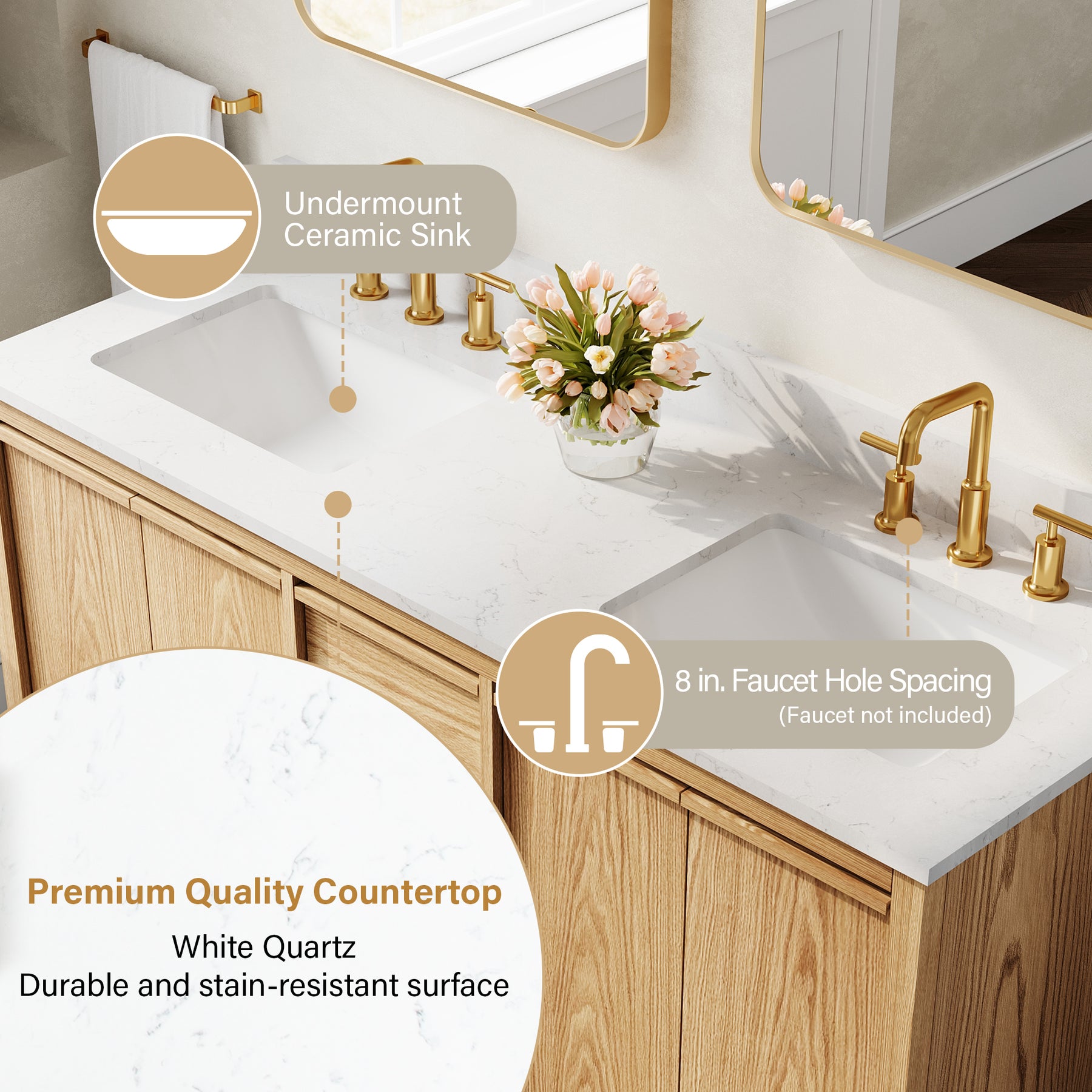 - High-End Quartz Countertop with Undermount Sink: Features a premium quartz vanity top paired with 2 sleek undermount ceramic sinks, offering a refined, modern look that is scratch-resistant and easy to clean.