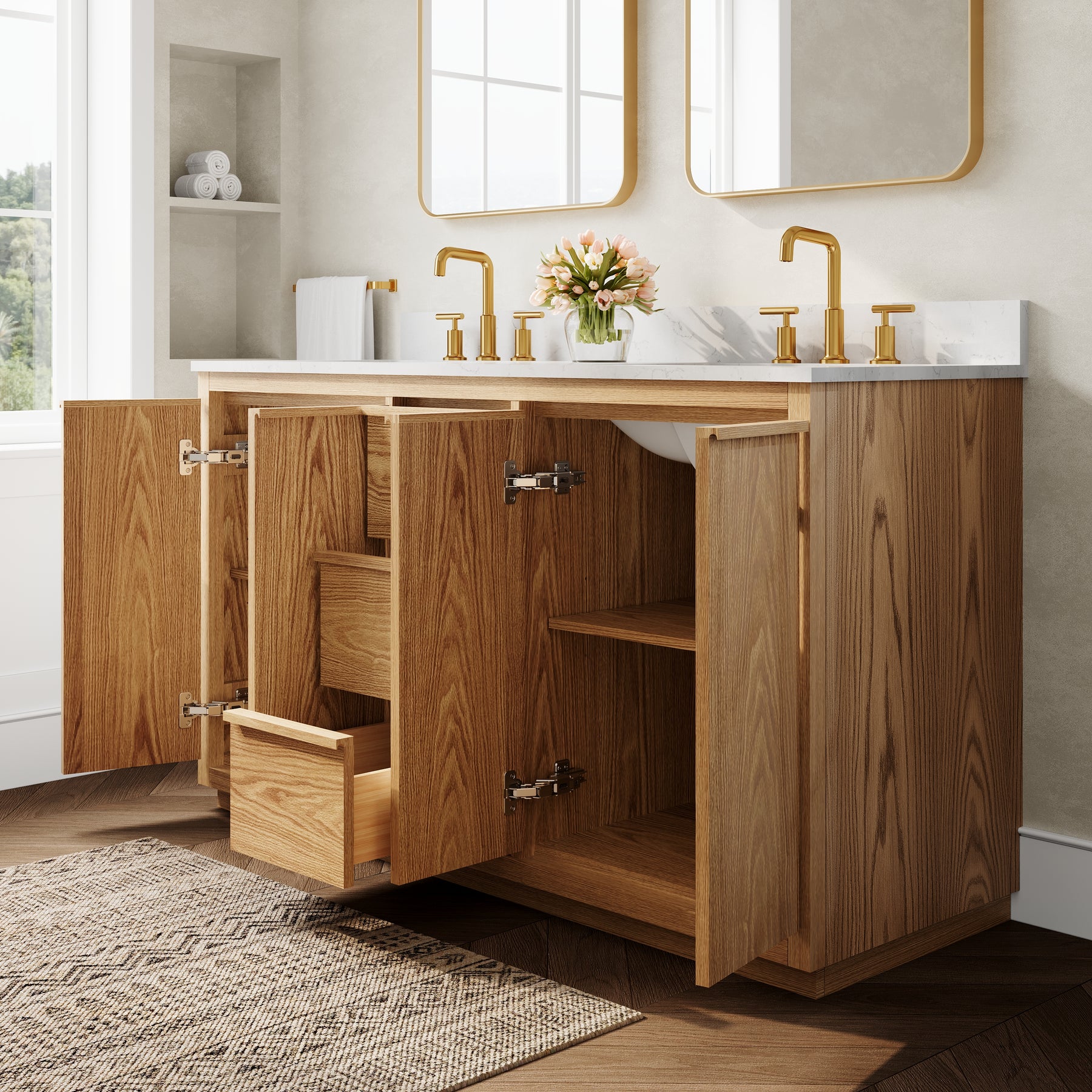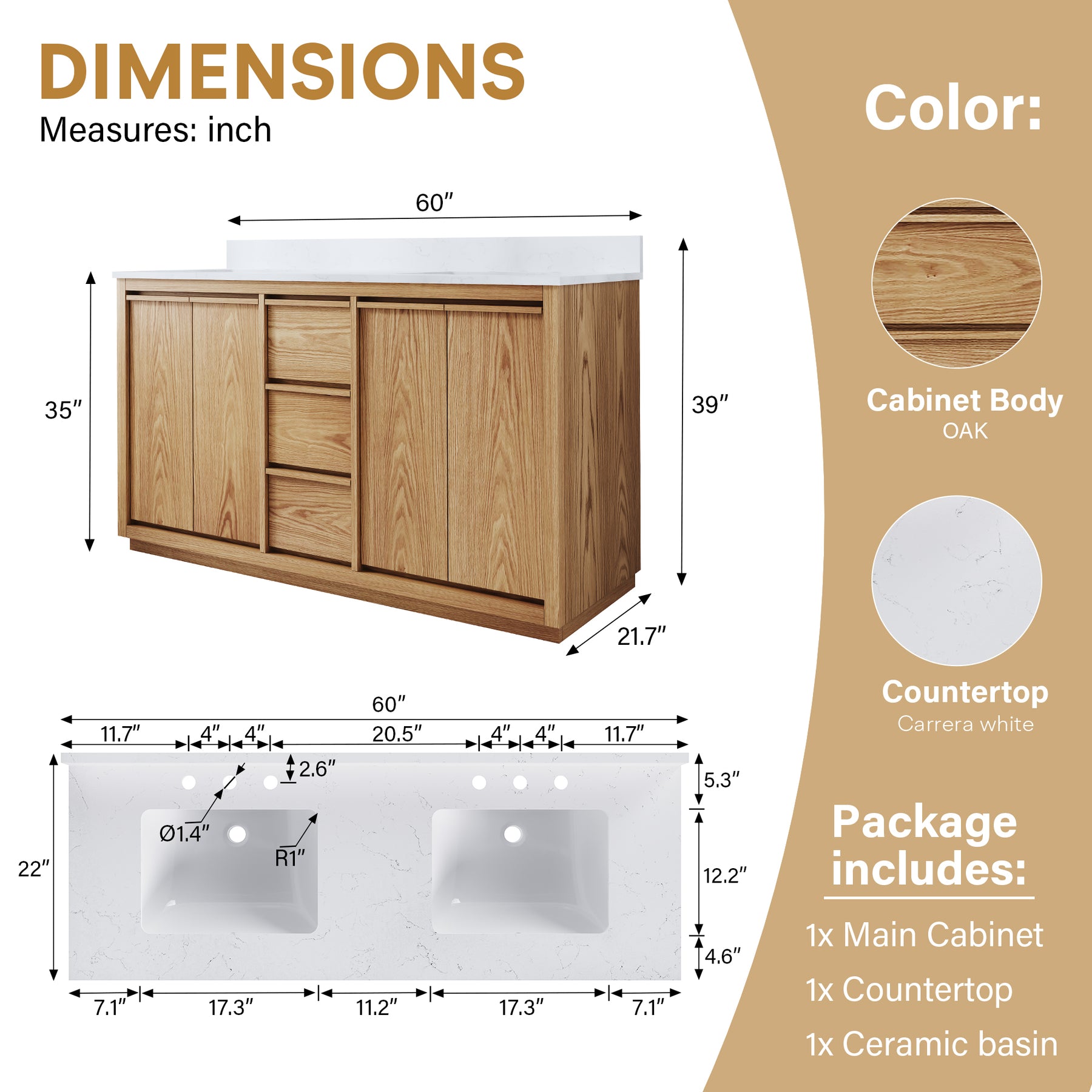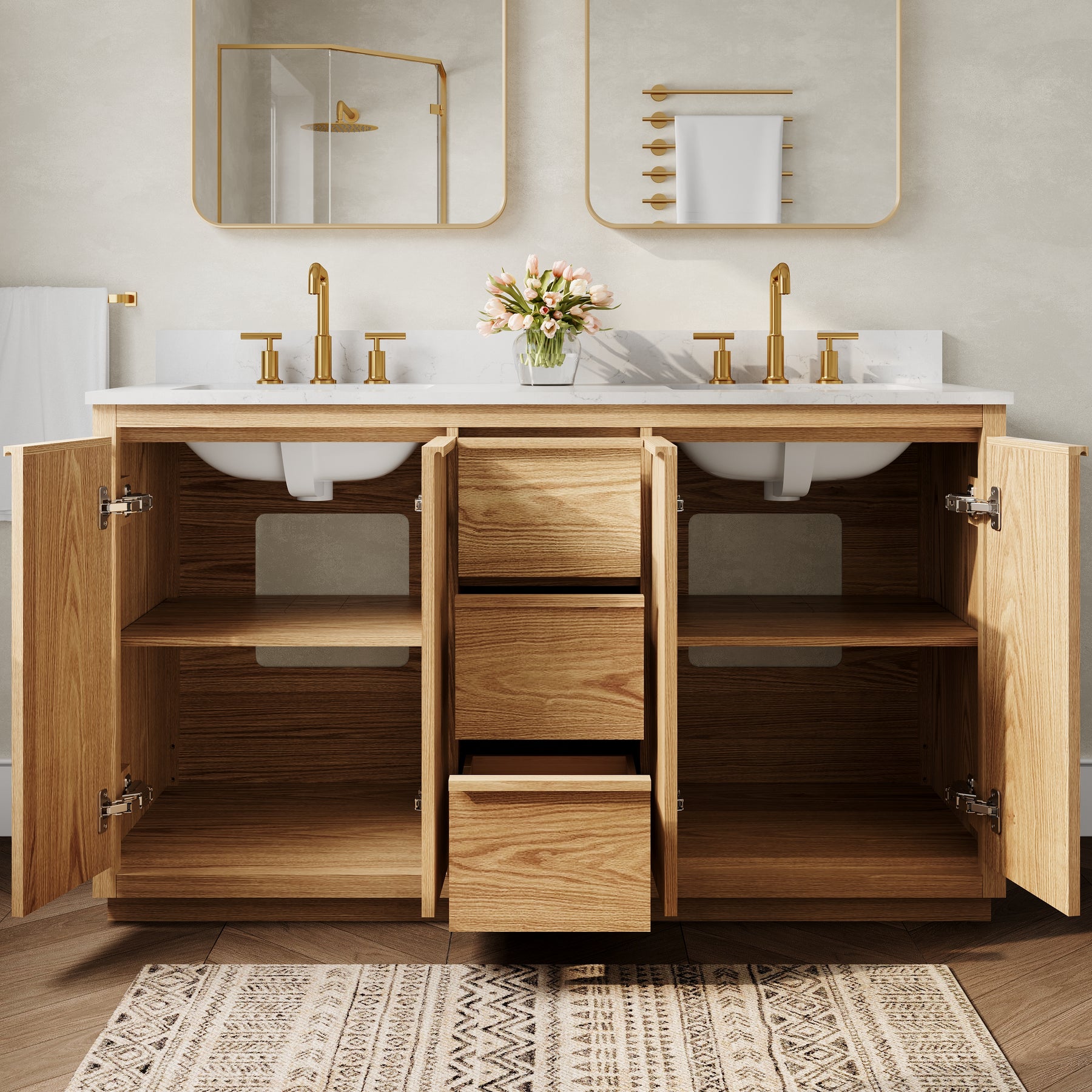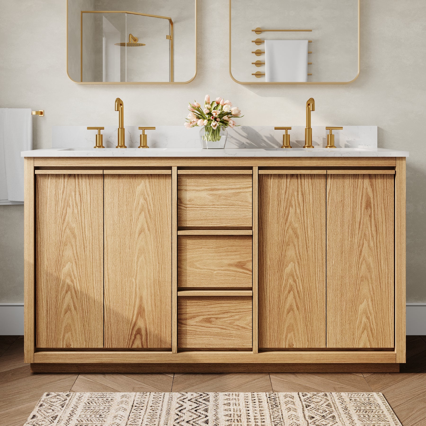 - High-End Quartz Countertop with Undermount Sink: Features a premium quartz vanity top paired with 2 sleek undermount ceramic sinks, offering a refined, modern look that is scratch-resistant and easy to clean.