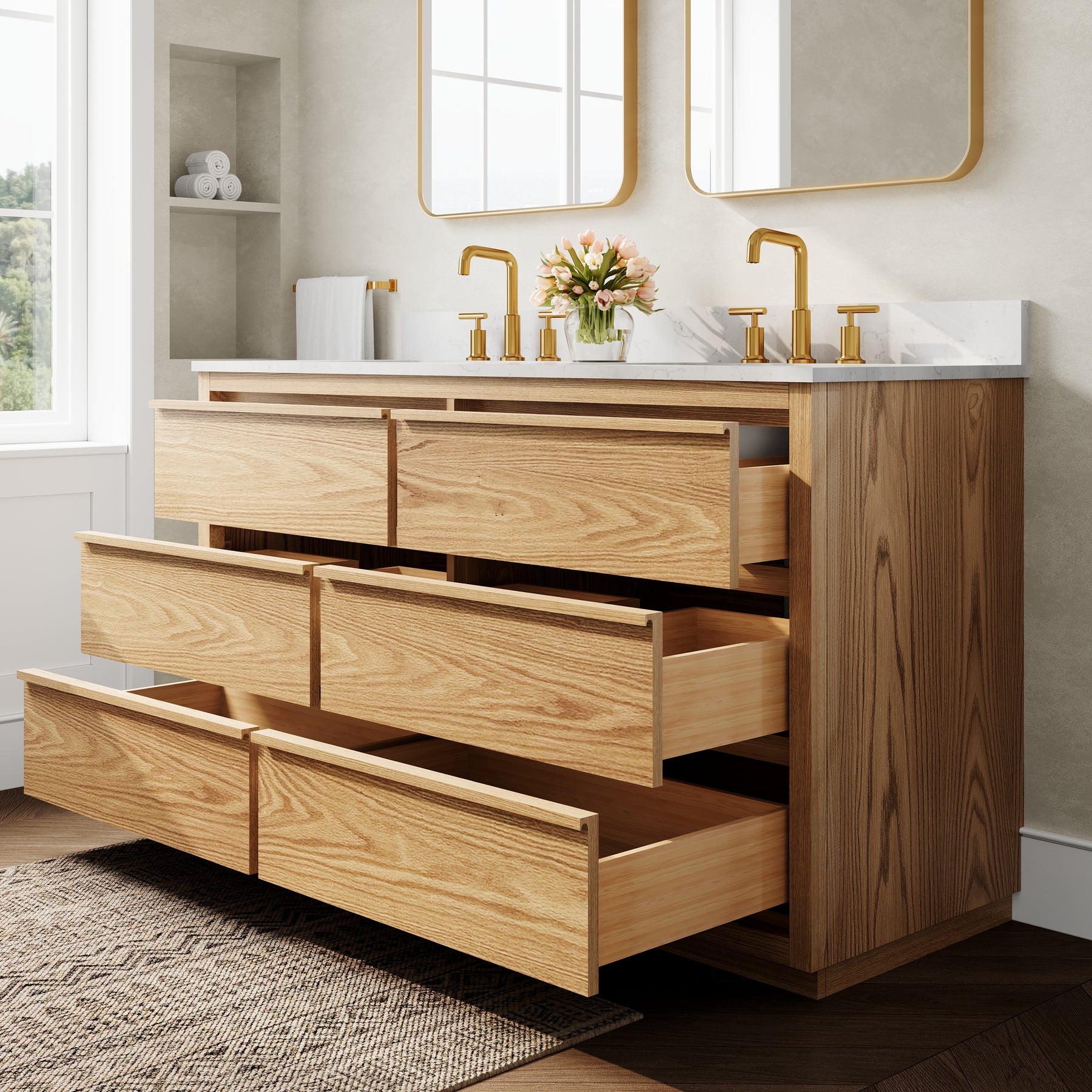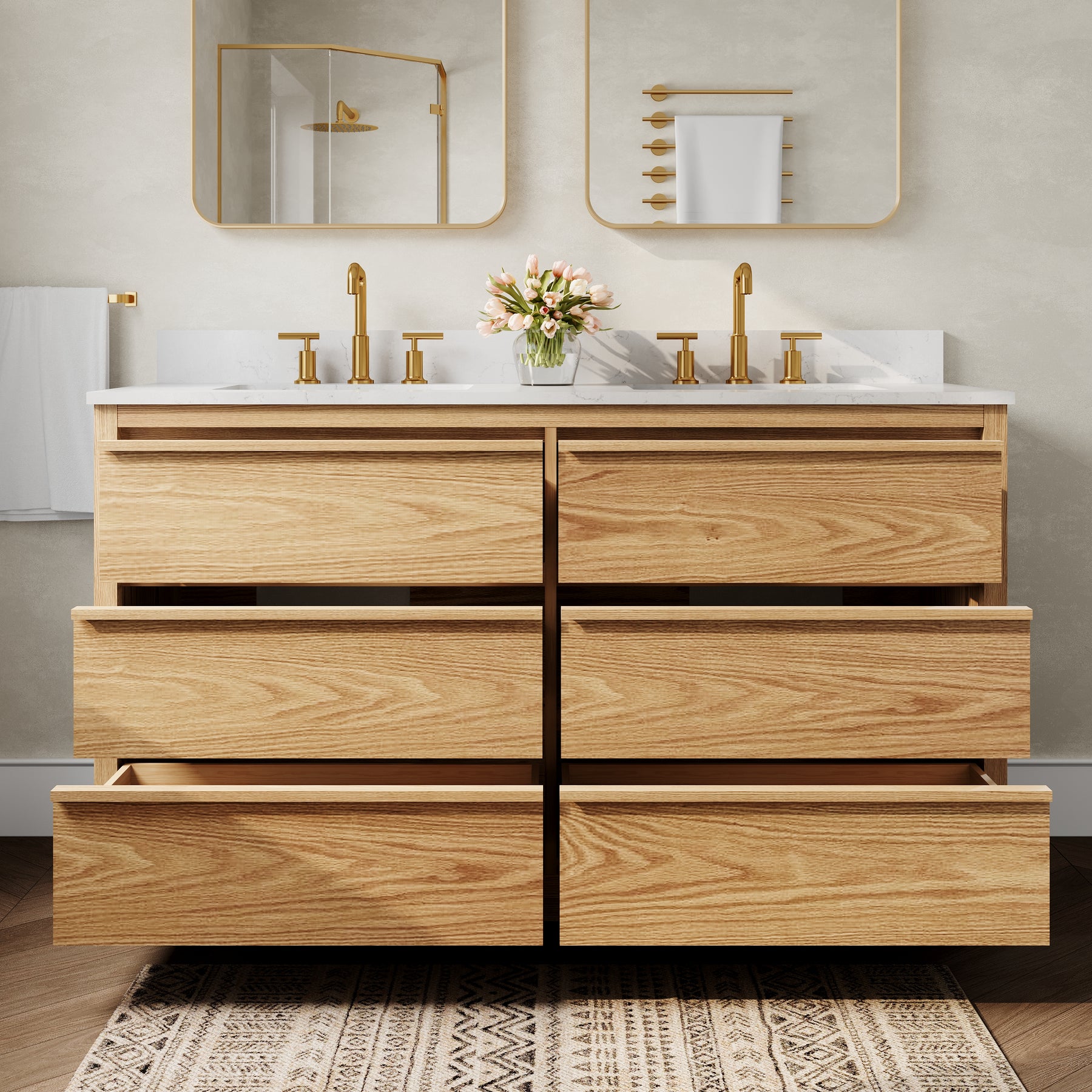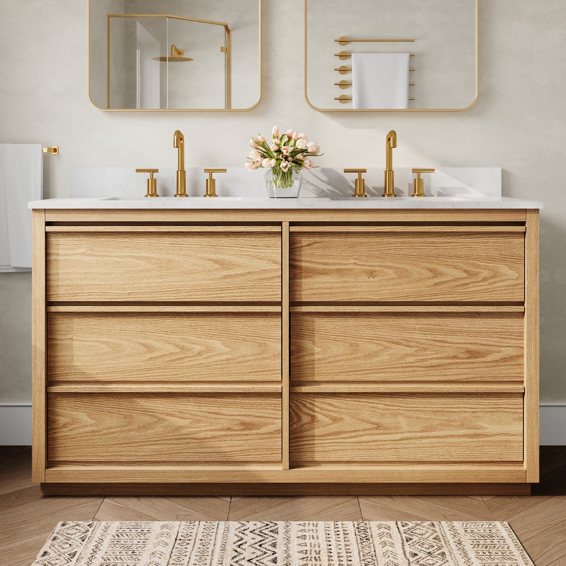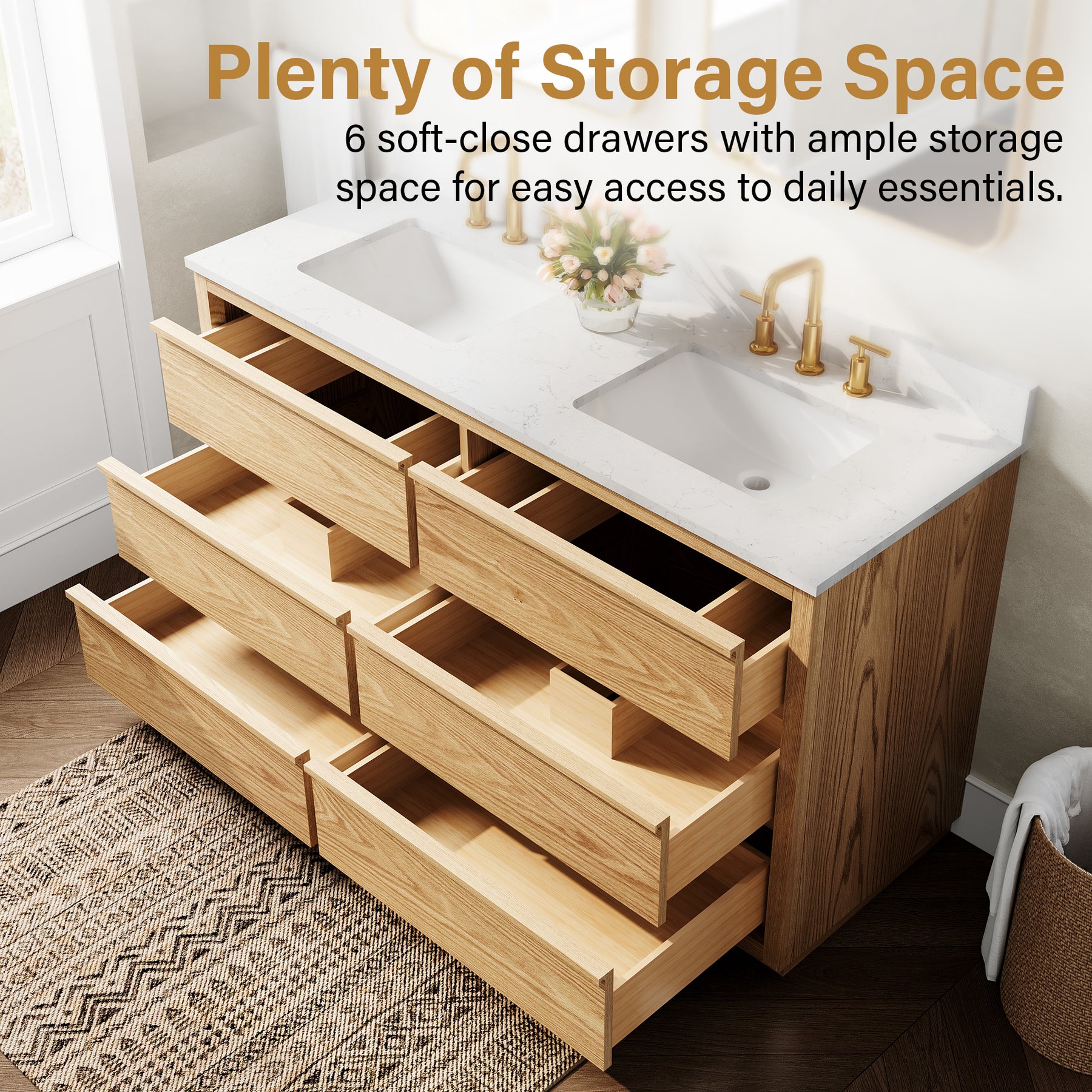 - High-End Quartz Countertop with Undermount Sink: Features a premium quartz vanity top paired with 2 sleek undermount ceramic sinks, offering a refined, modern look that is scratch-resistant and easy to clean.