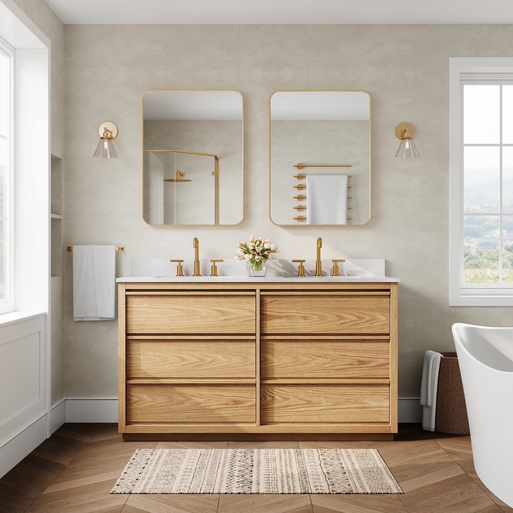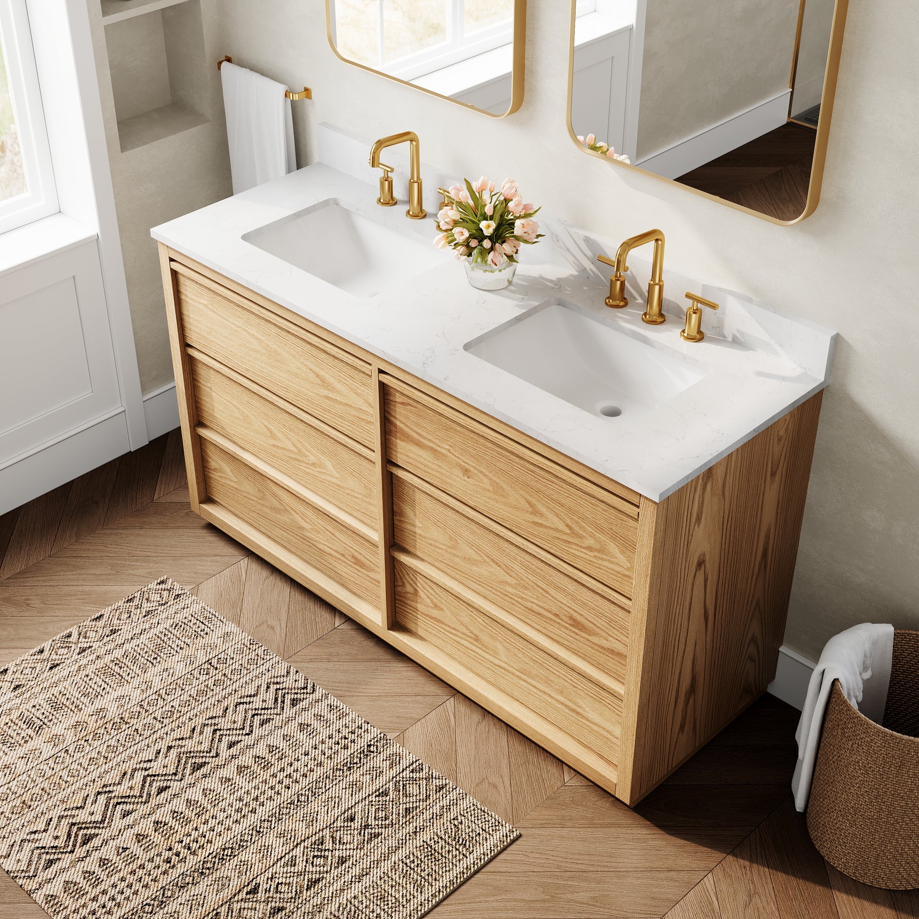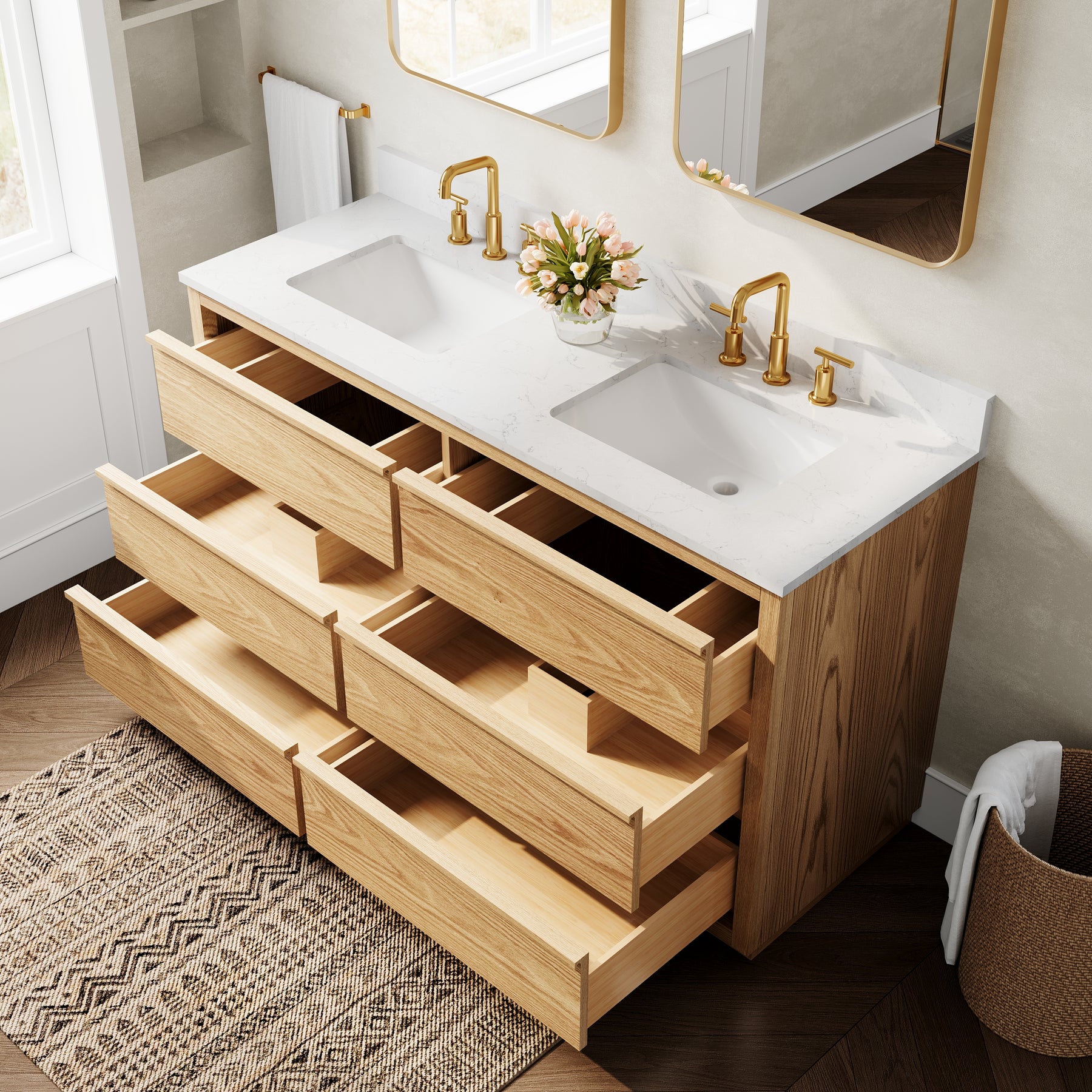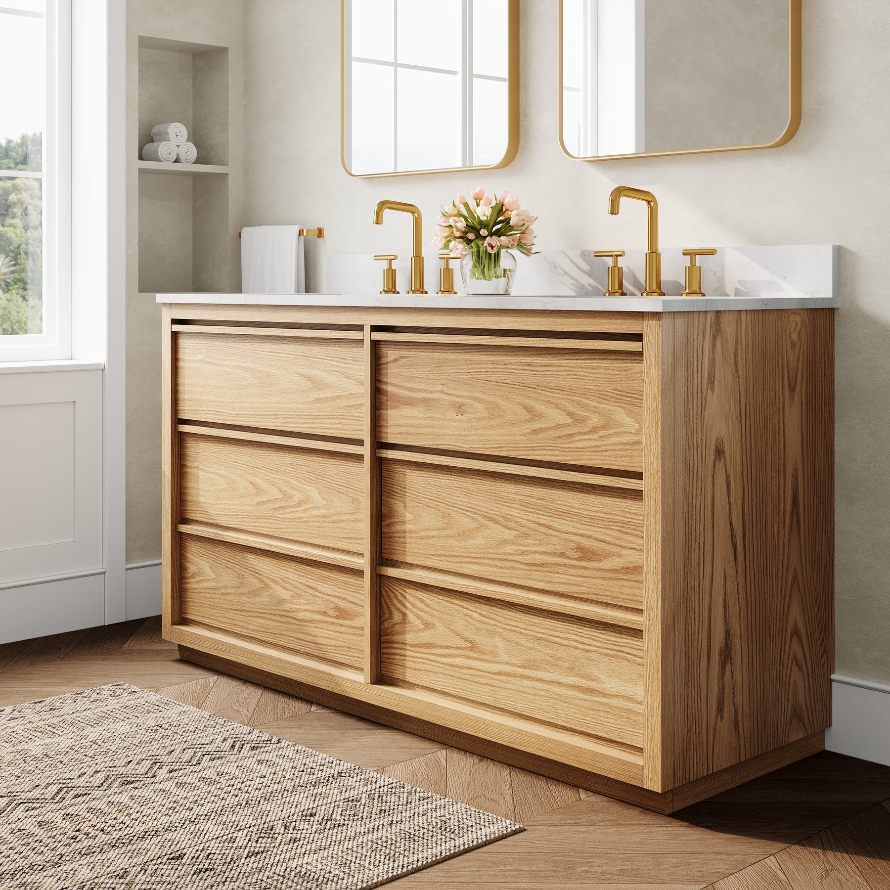 - High-End Quartz Countertop with Undermount Sink: Features a premium quartz vanity top paired with 2 sleek undermount ceramic sinks, offering a refined, modern look that is scratch-resistant and easy to clean.