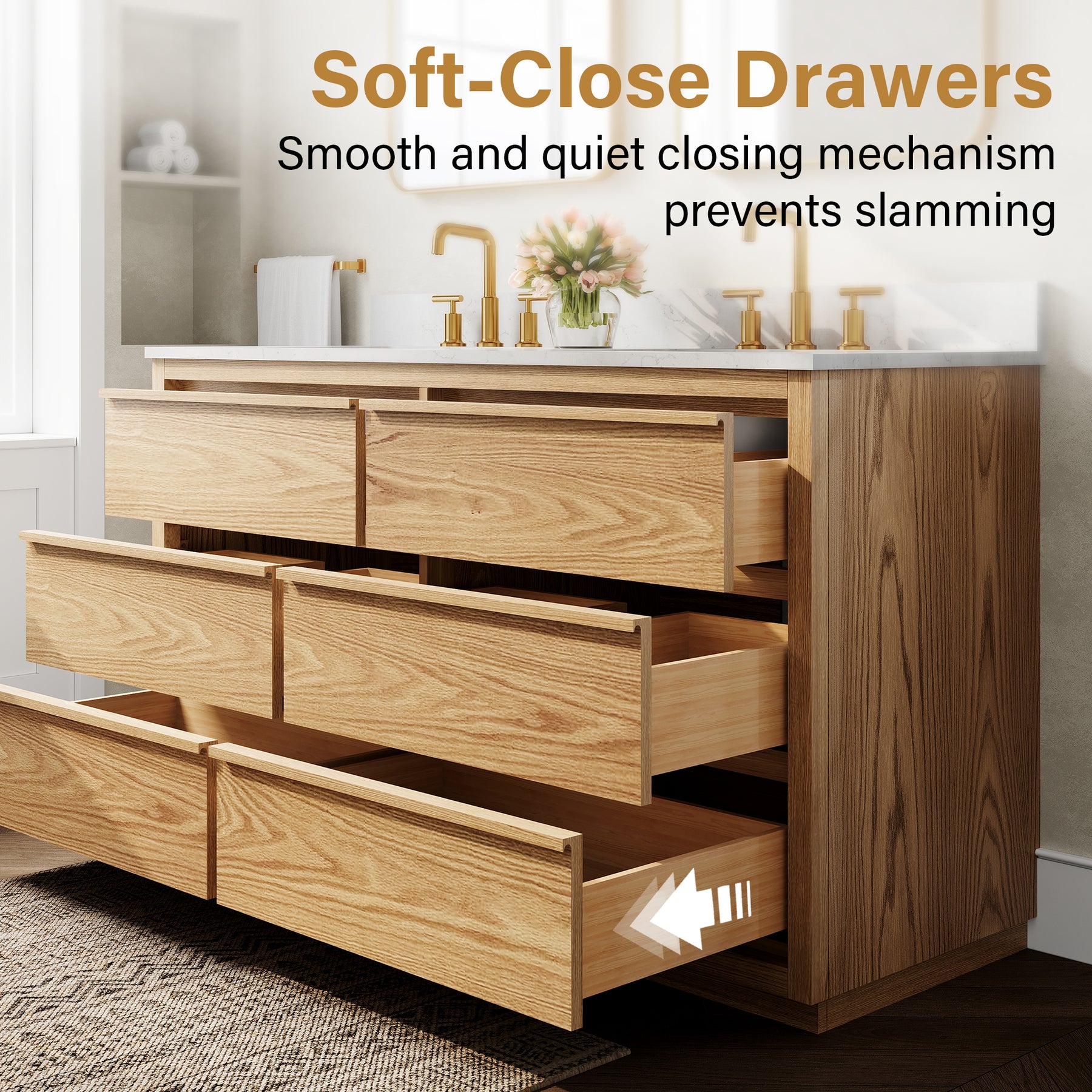 - Smooth & Quiet Soft-Close System: Equipped with DTC concealed soft-close drawer sliders, ensuring quiet operation and extending the life of the hardware.