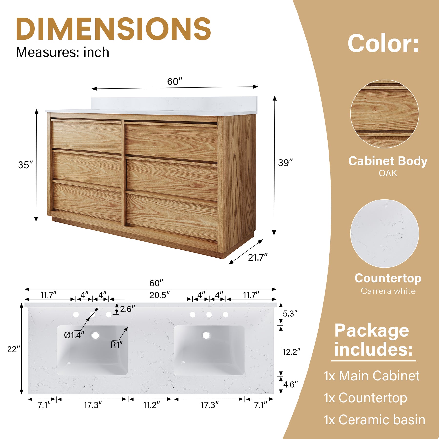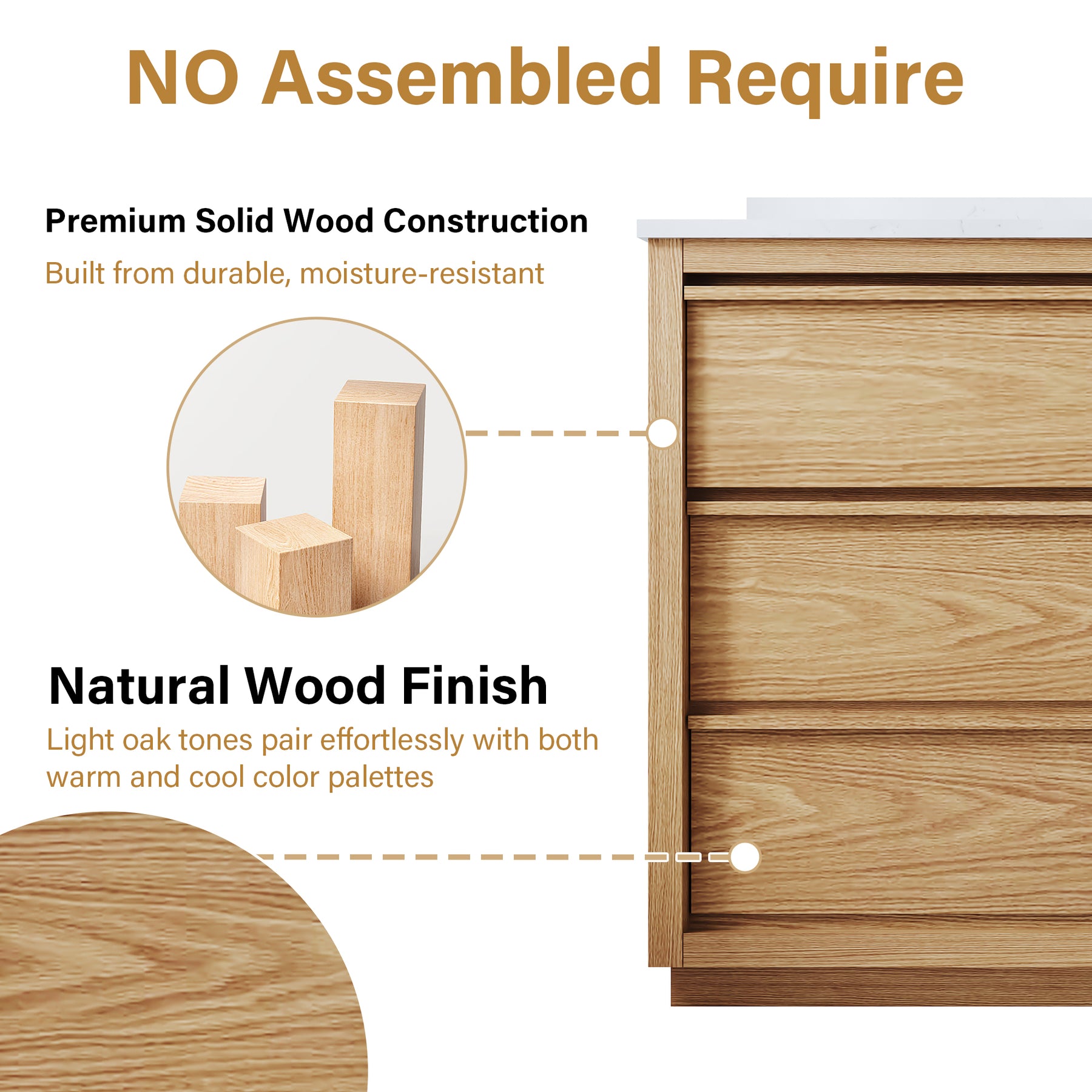 - Premium Oak Wood Construction: Crafted with a solid oak wood frame and high-quality veneer plywood, this bathroom vanity delivers superior durability, stability, and long-lasting performance.