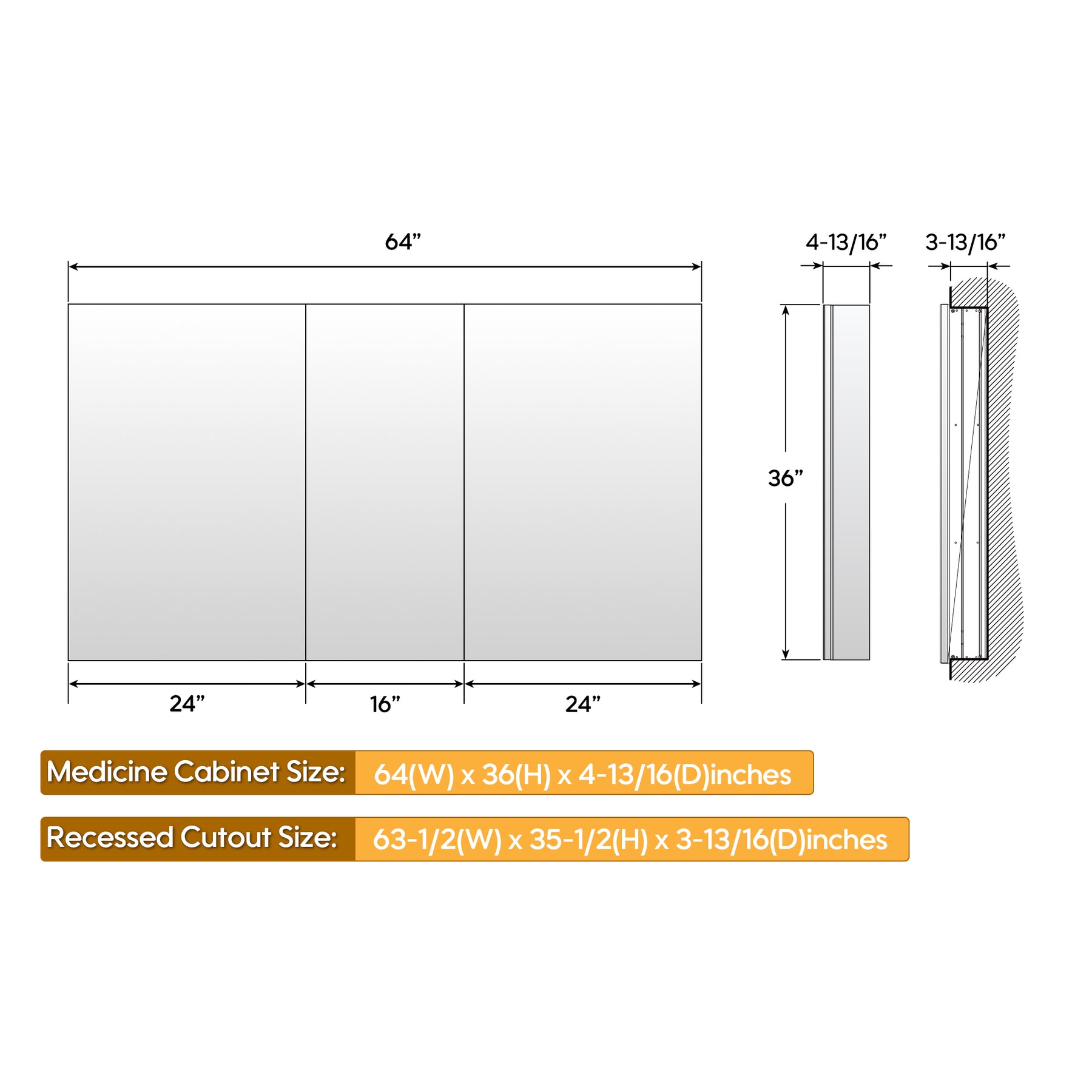 - Recess Rough-In Size: 63 1/2" x 3 13/16" x 35 1/2".