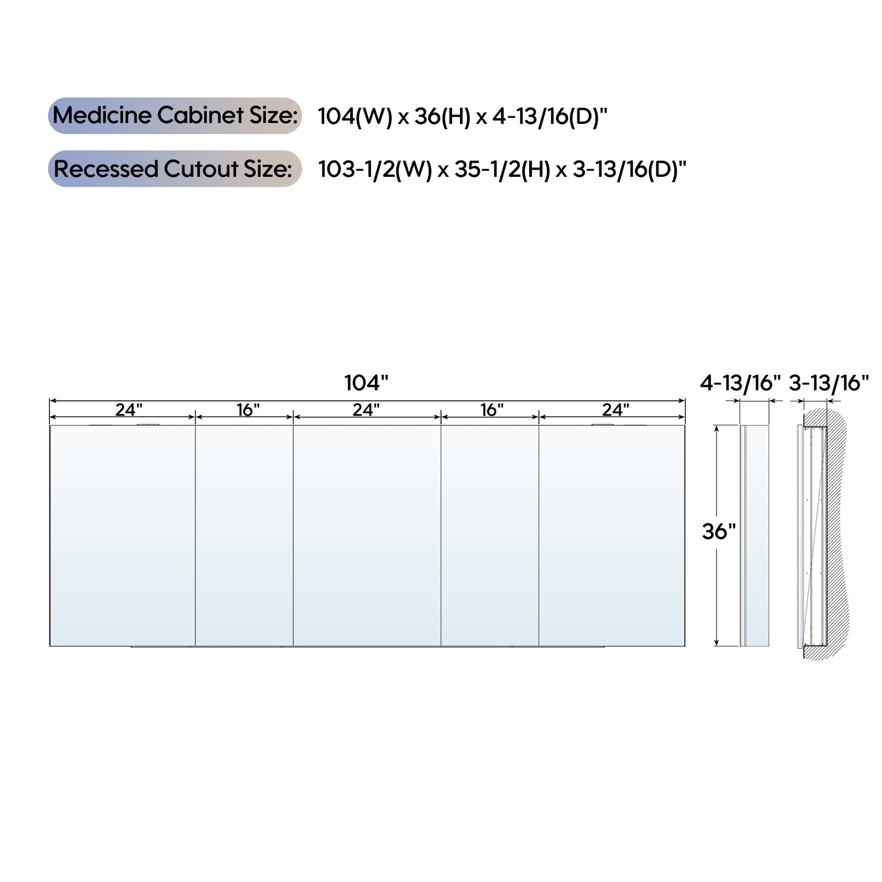 - Recess Rough-In Size: 103 1/2" x 3 13/16" x 35 1/2".