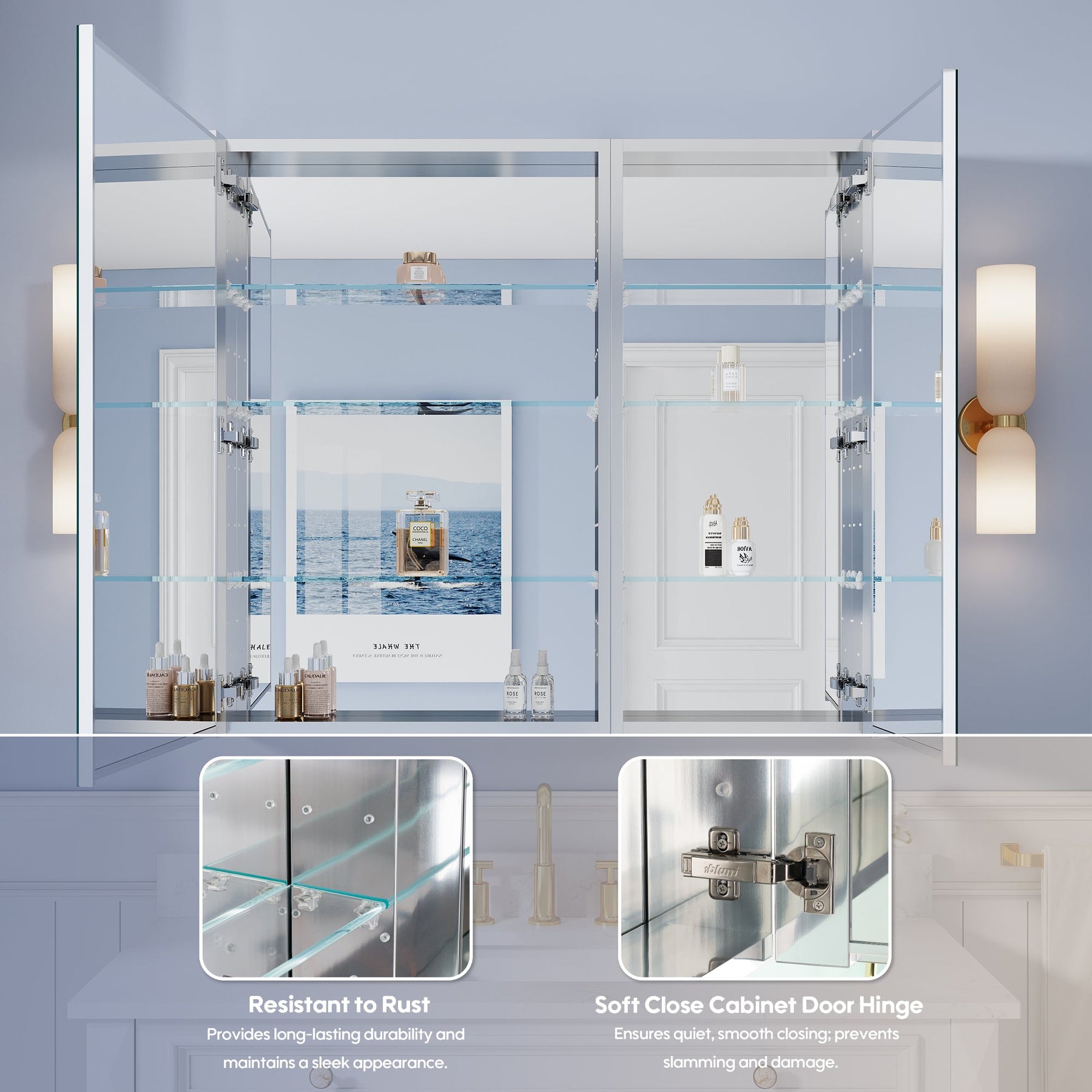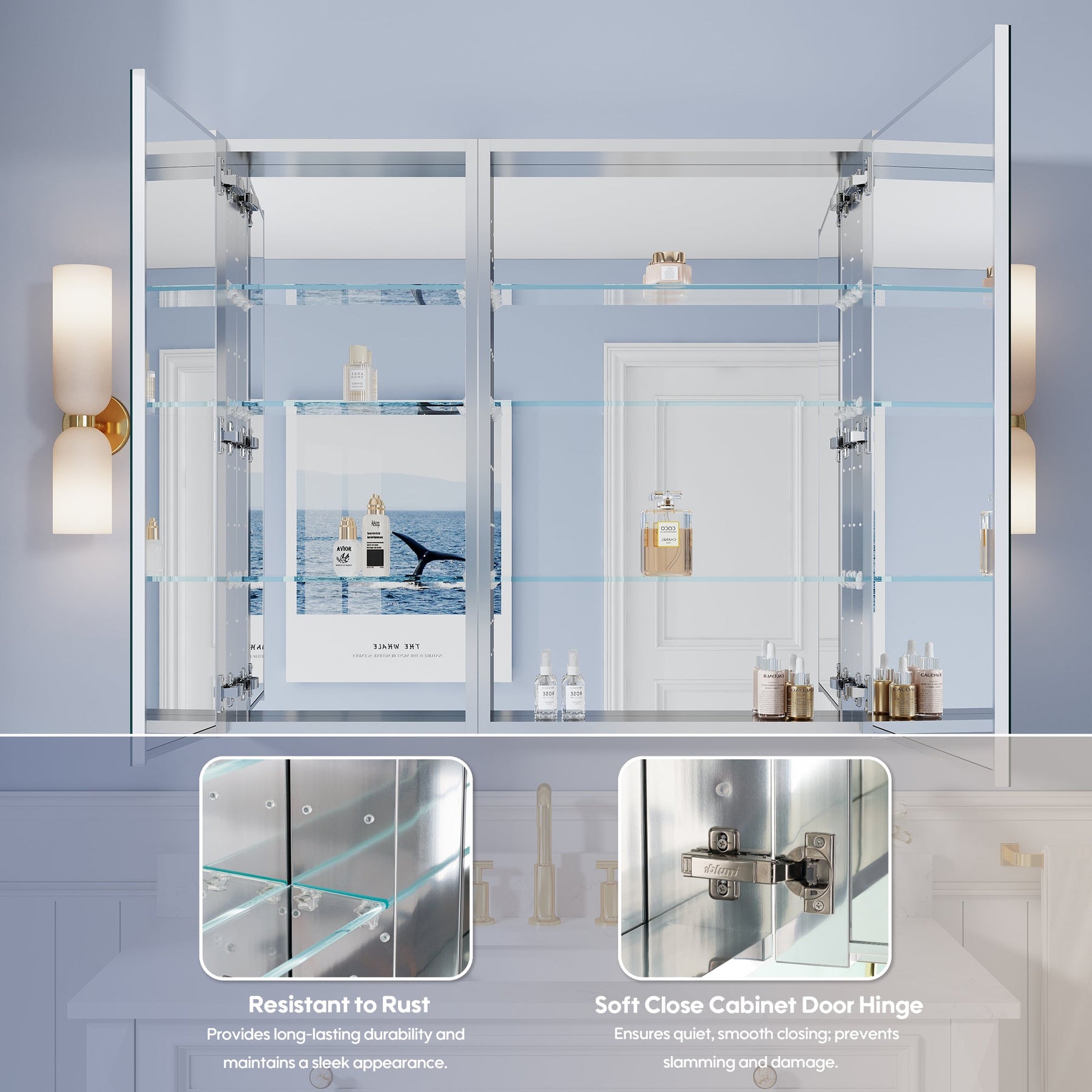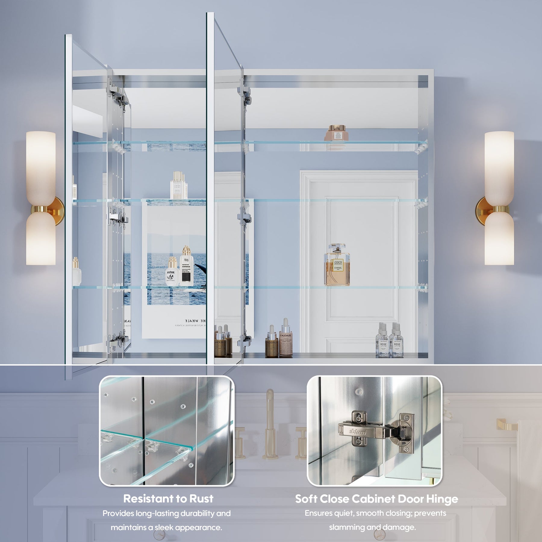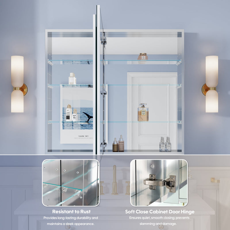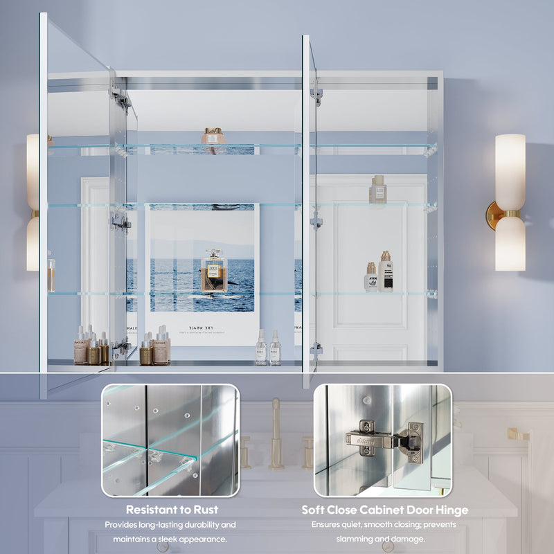 - Reversible Door Design: Copper-free tri-view mirror cabinet with 180° reversible installation, allowing the door to open from either the left or right side for flexible bathroom layouts.