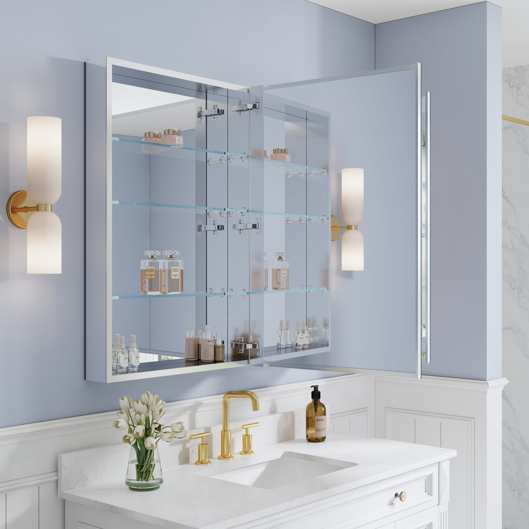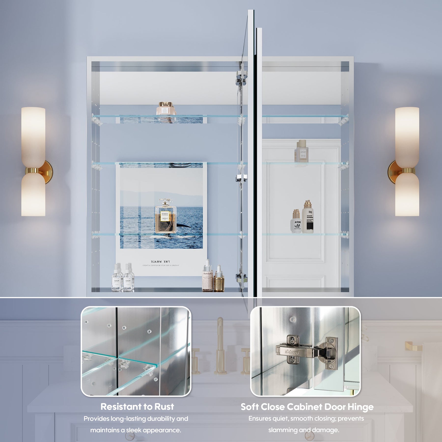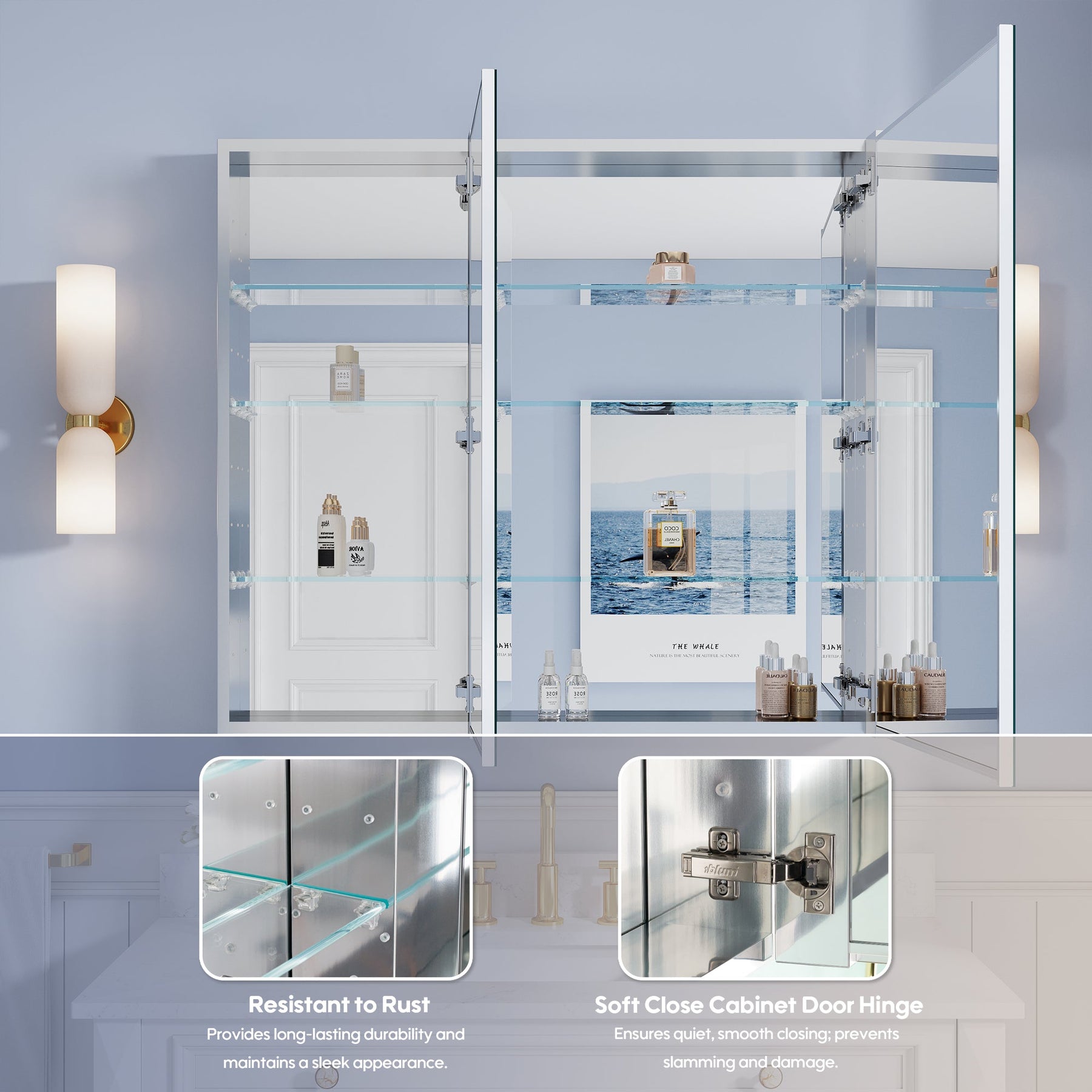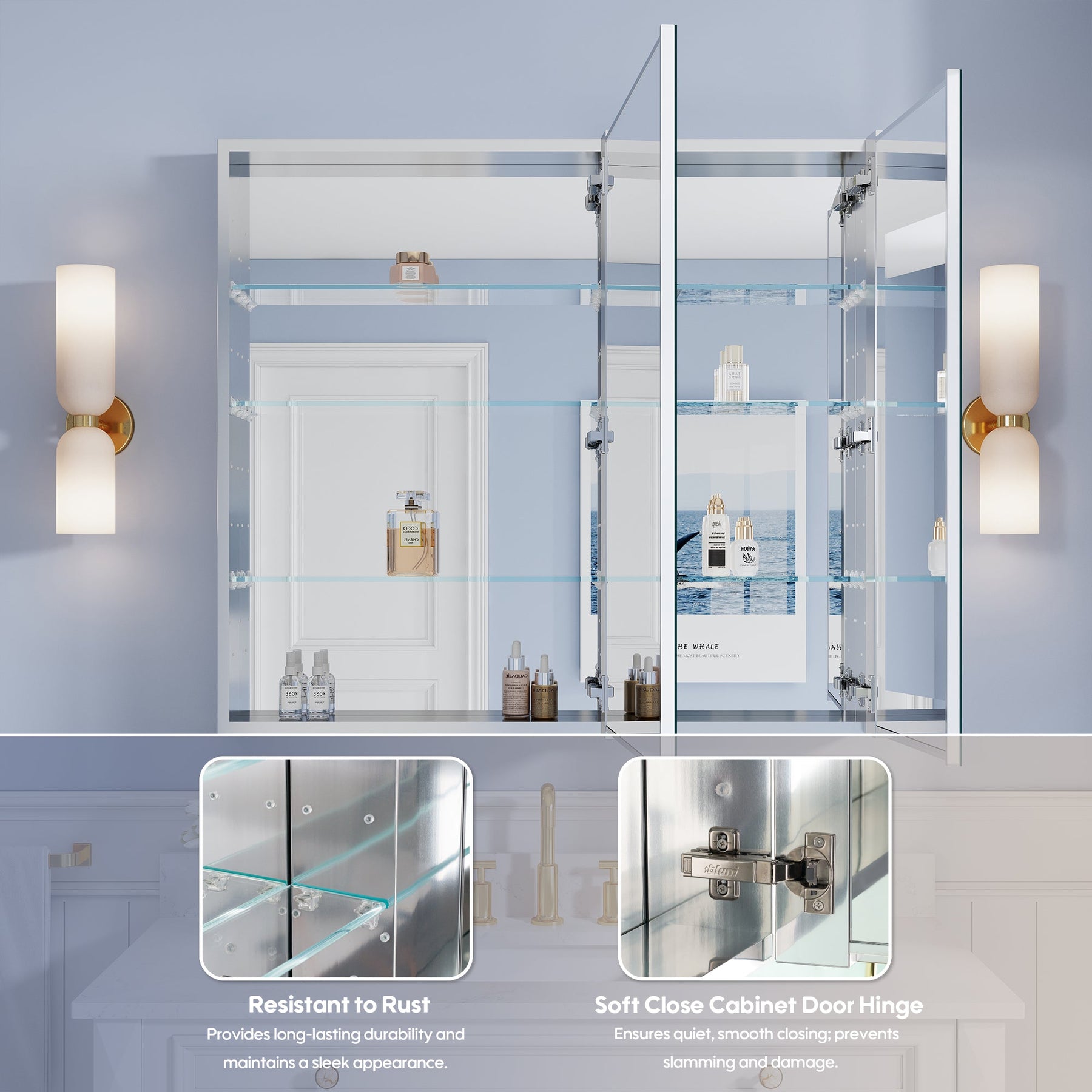 - Reversible Door Design: Copper-free tri-view mirror cabinet with 180° reversible installation, allowing the door to open from either the left or right side for flexible bathroom layouts.