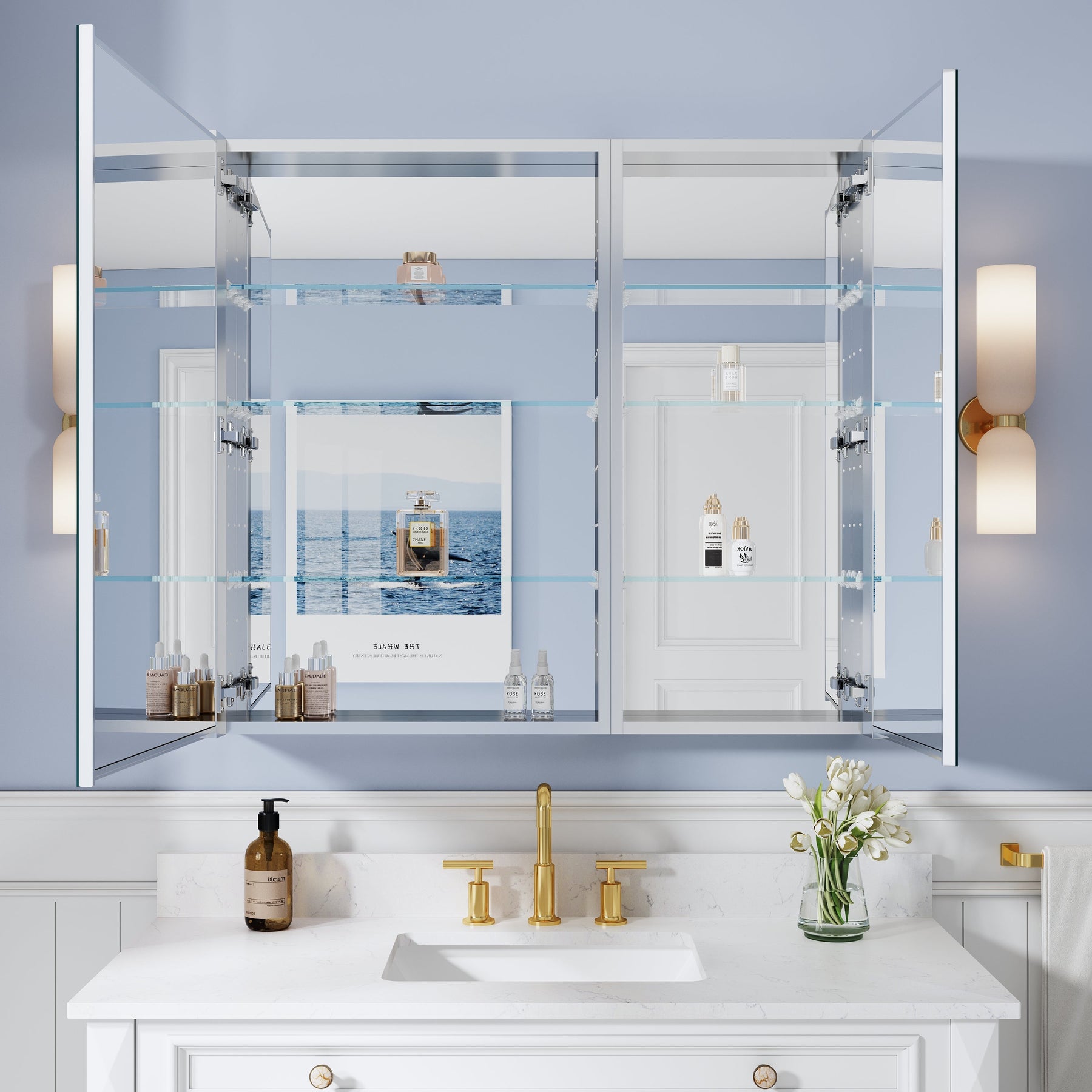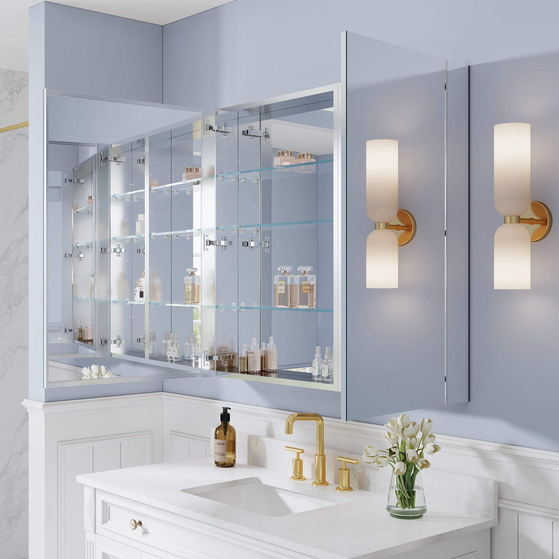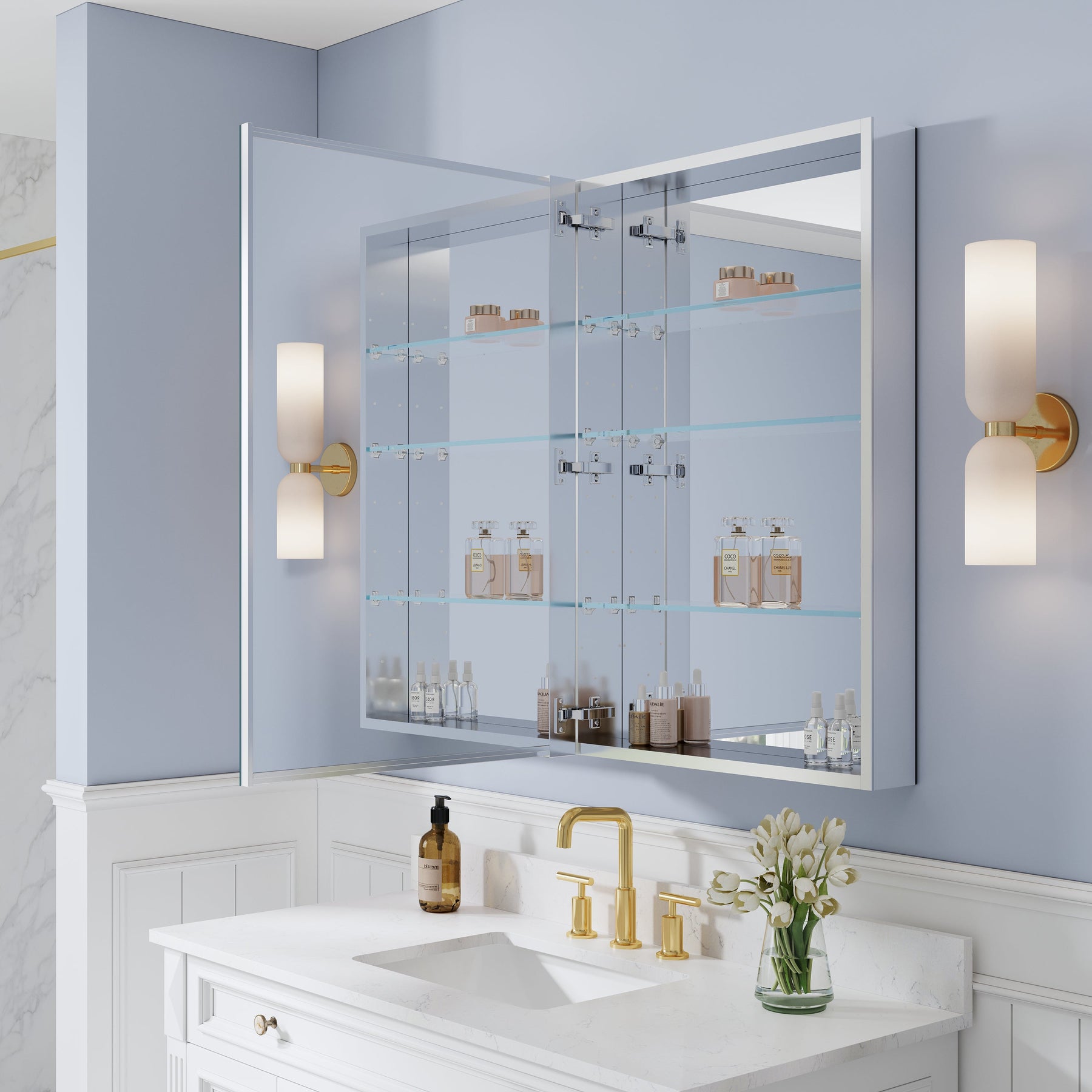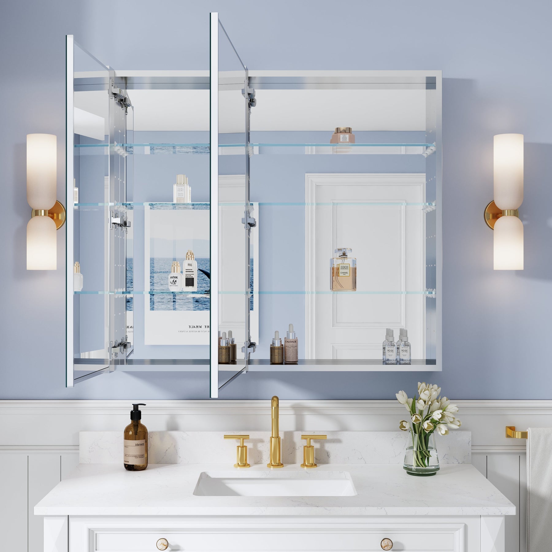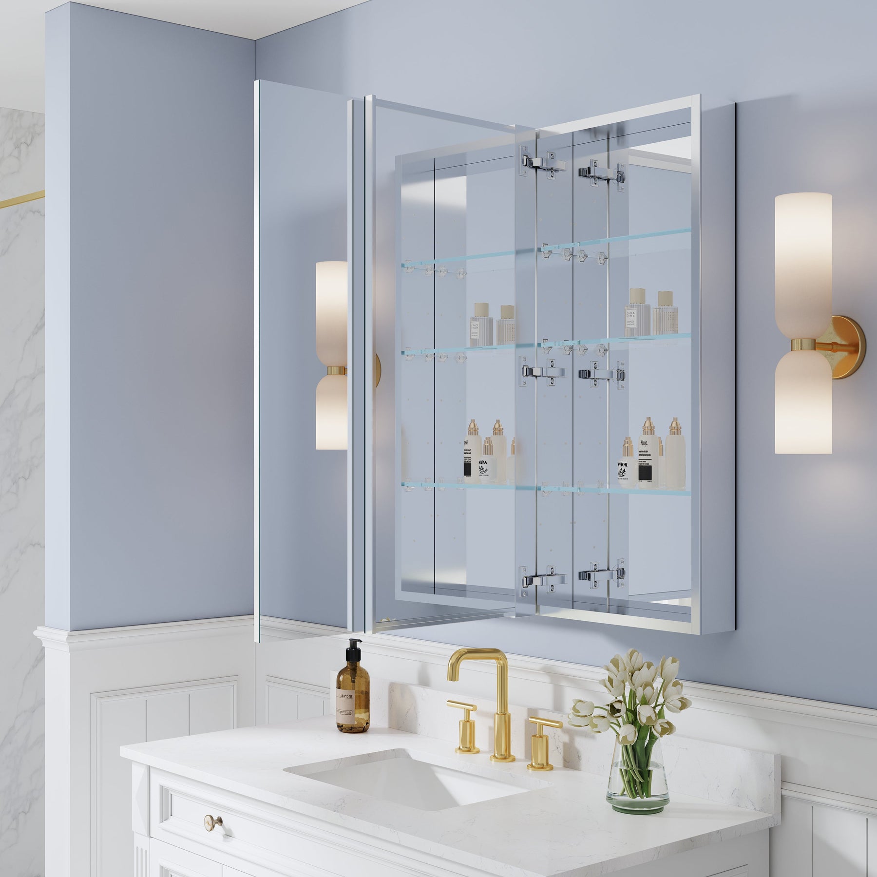 - Reversible Door Design: Copper-free tri-view mirror cabinet with 180° reversible installation, allowing the door to open from either the left or right side for flexible bathroom layouts.