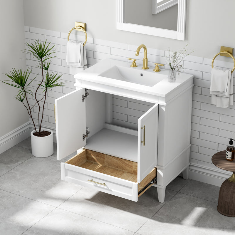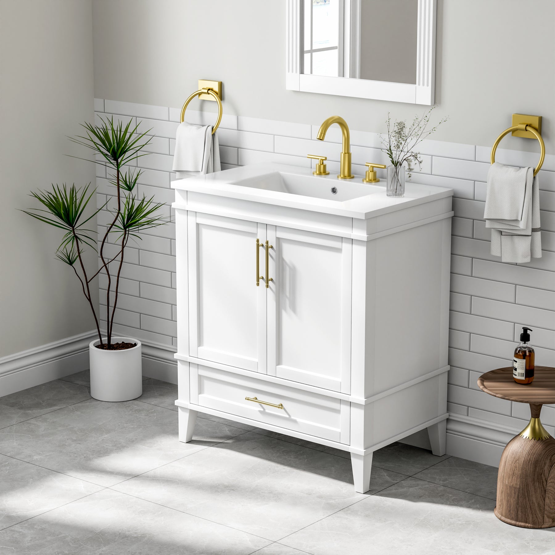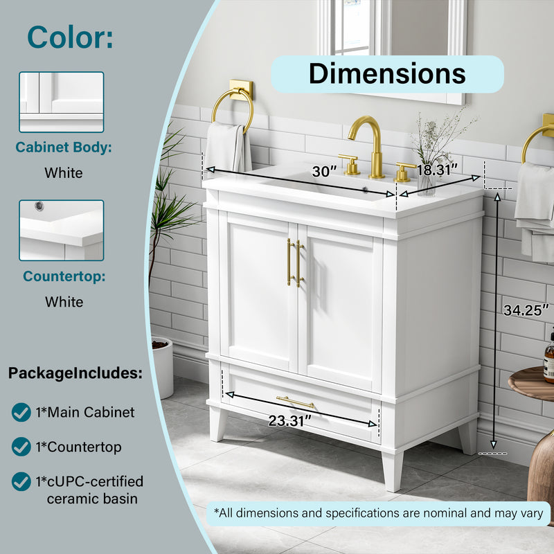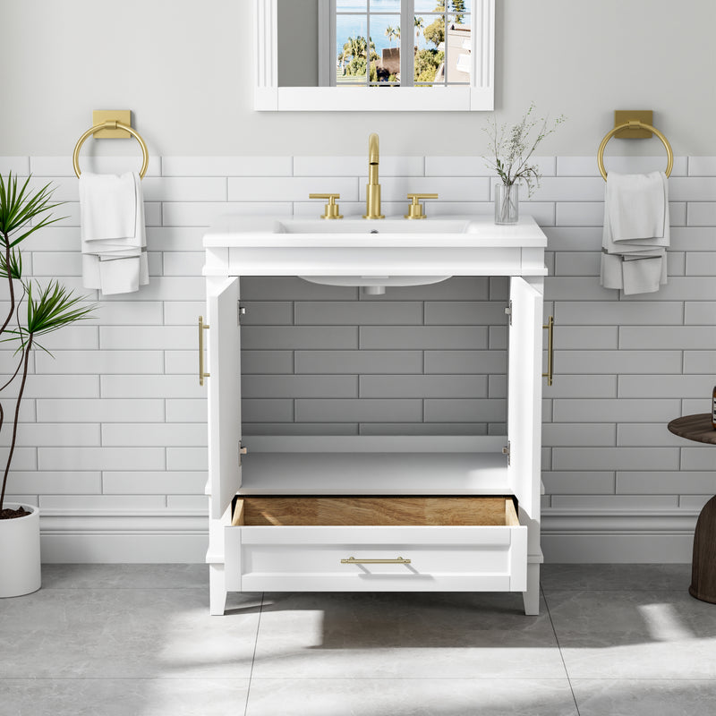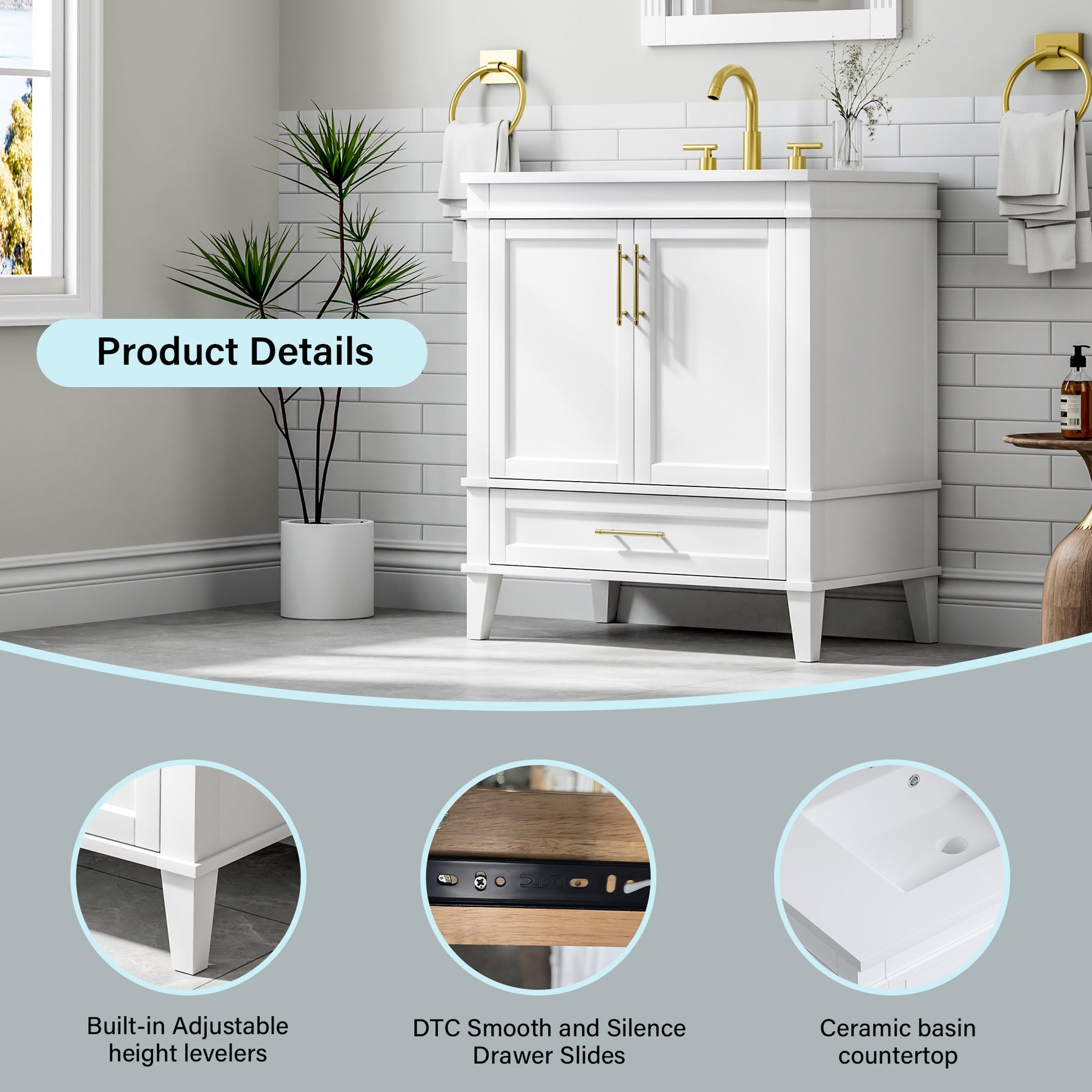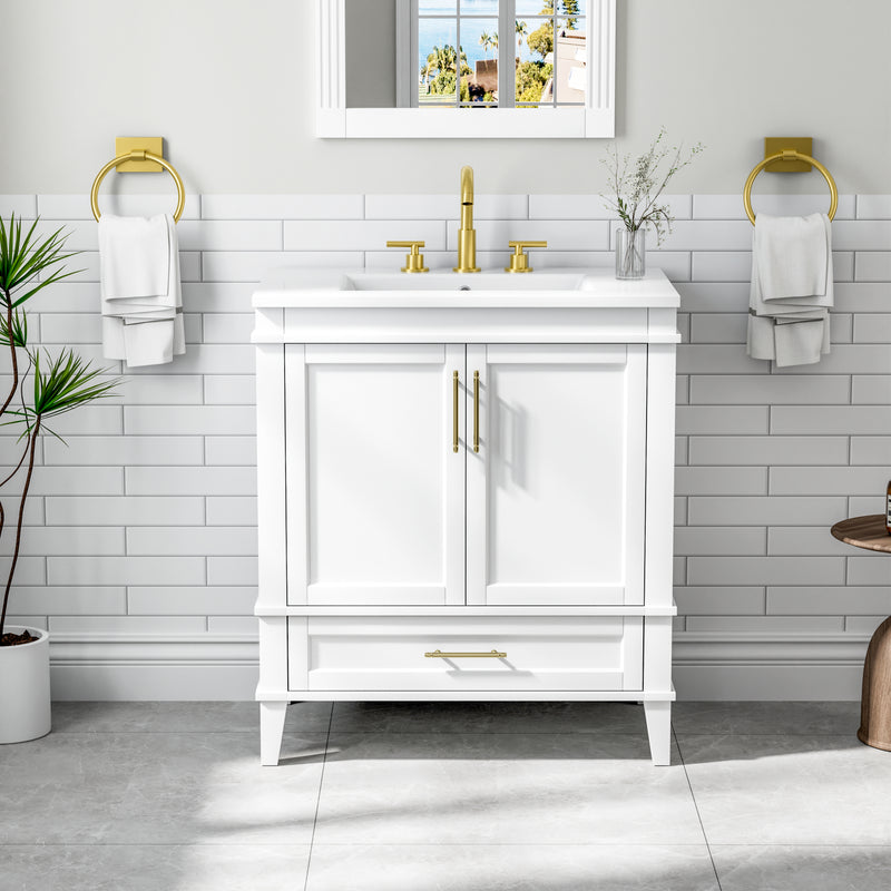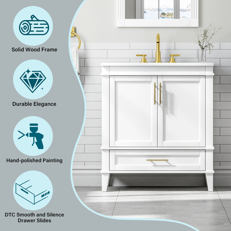 30 Inch Solid Wood Bathroom Vanity with cUPC Ceramic Sink, Gold Anodized Aluminum Handles, and Soft-Close DTC Hinges