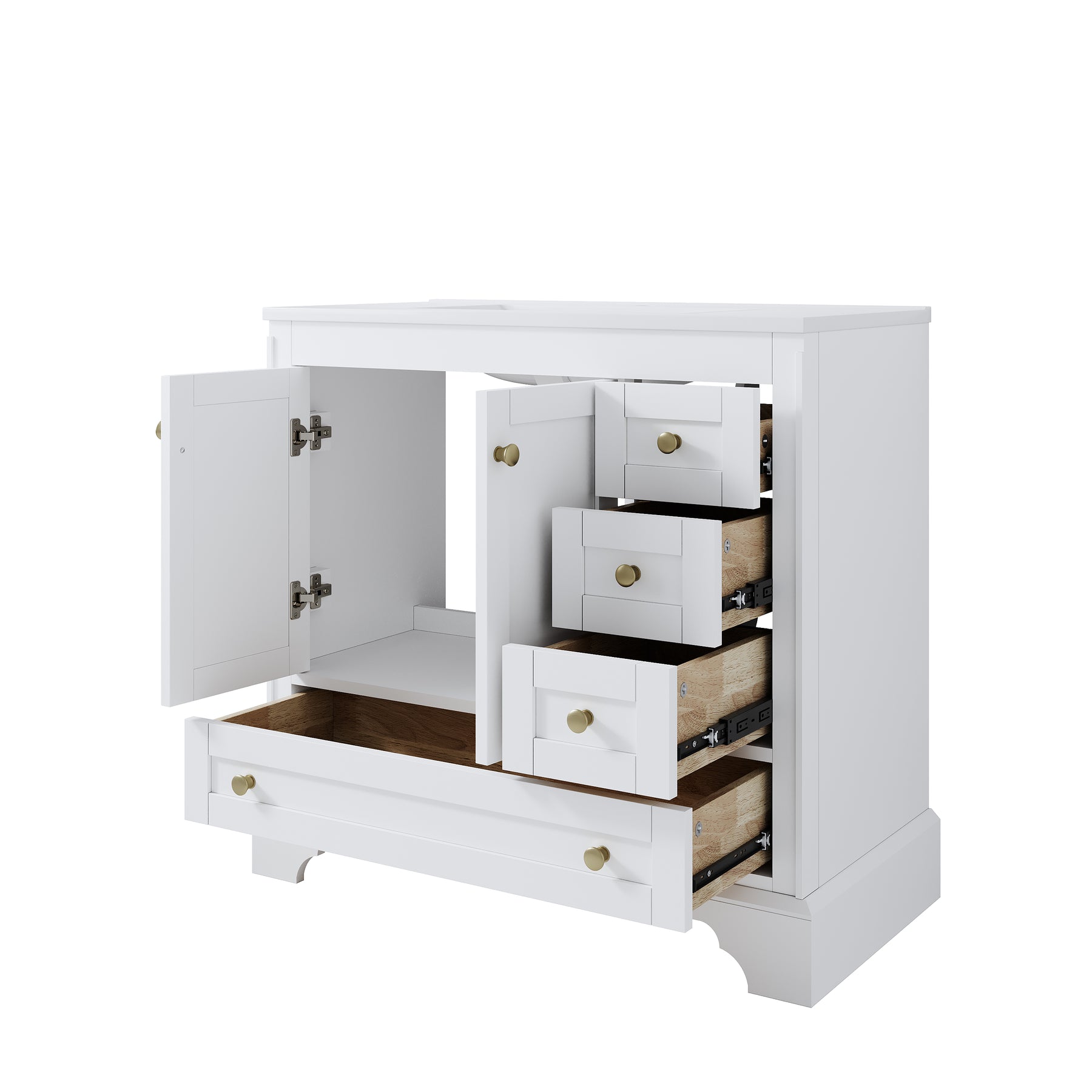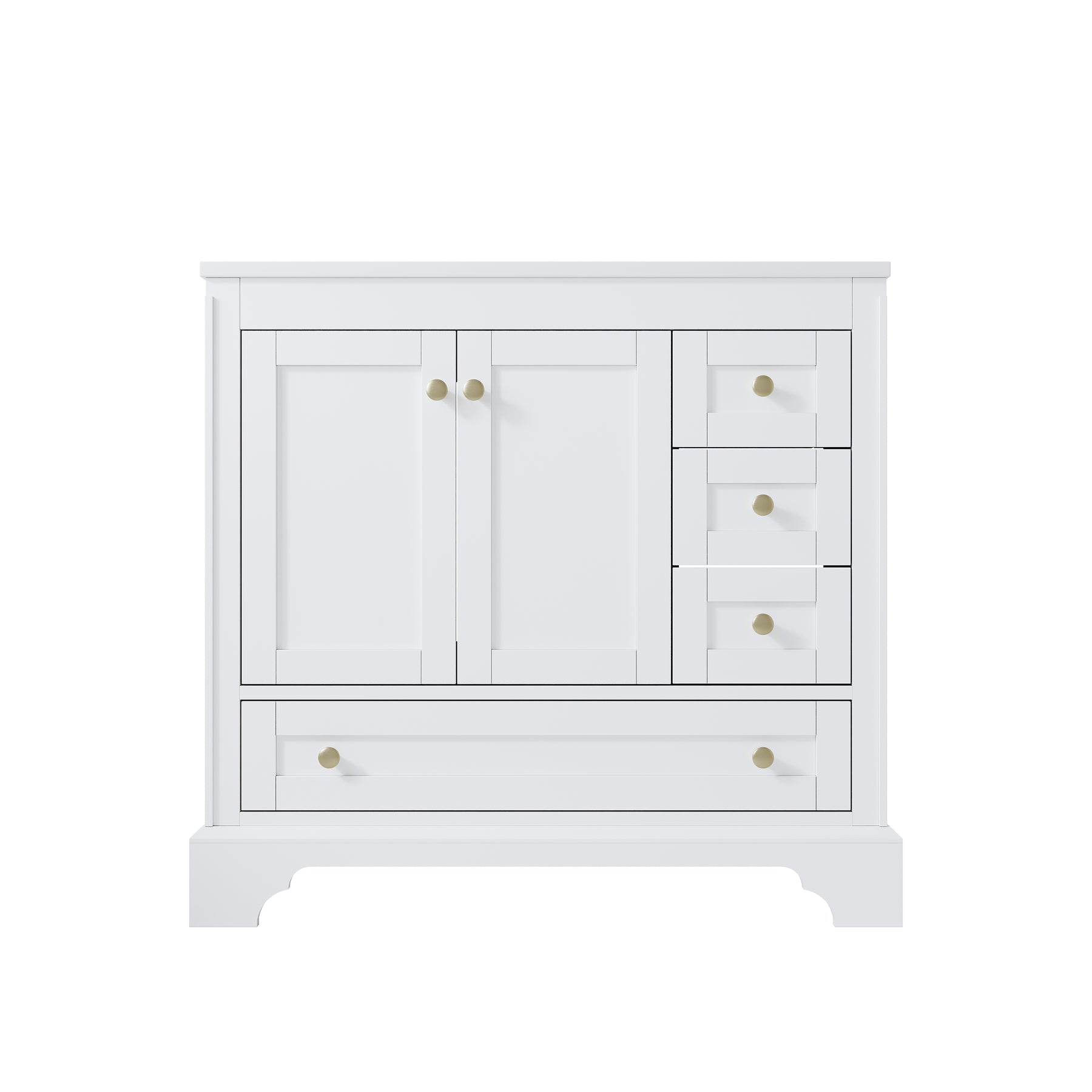 • Ample Storage Space: This single-basin bathroom cabinet comes with soft-close doors and 4 drawer—ensuring no annoying noise during use, for a smooth, quiet experience. Both hardware and drawer slides are DTC metal-made, paired with golden handles. This modern style cabinet delivers a superior feel that ordinary bathroom cabinets can hardly match.