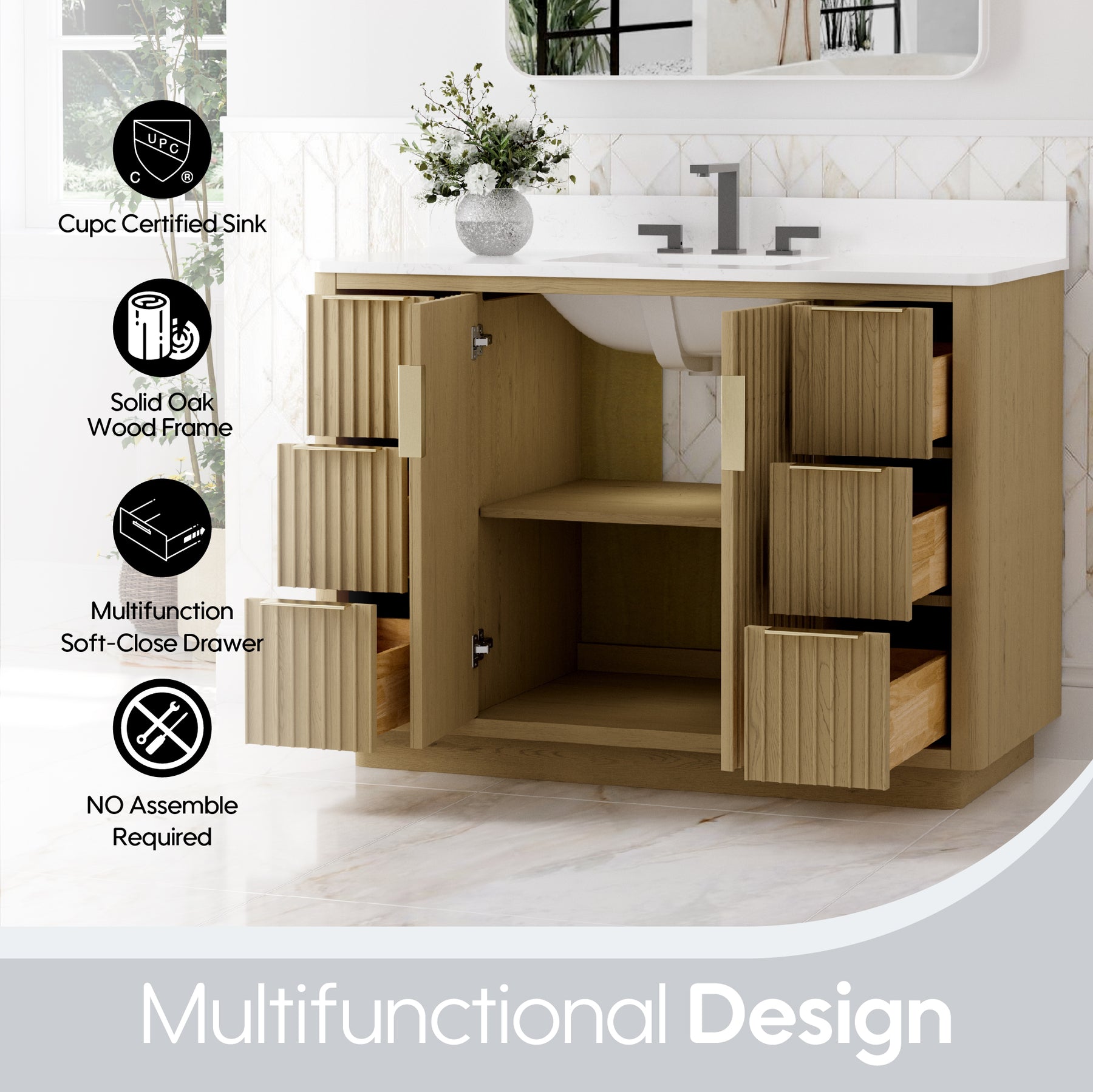 Transform your bathroom with our luxurious freestanding vanity, designed for both elegance and functionality. Constructed with a solid poplar wood frame and high-quality veneer plywood, this vanity is built to last. It features two soft-close doors with Austria BLUM hinges and six soft-close drawers with DTC concealed sliders, ensuring smooth and silent operation. The anodized aluminum hardware adds a sleek, modern touch. Topped with premium quartz or marble and a single undermount sink, this vanity provides a sophisticated focal point for your bathroom.