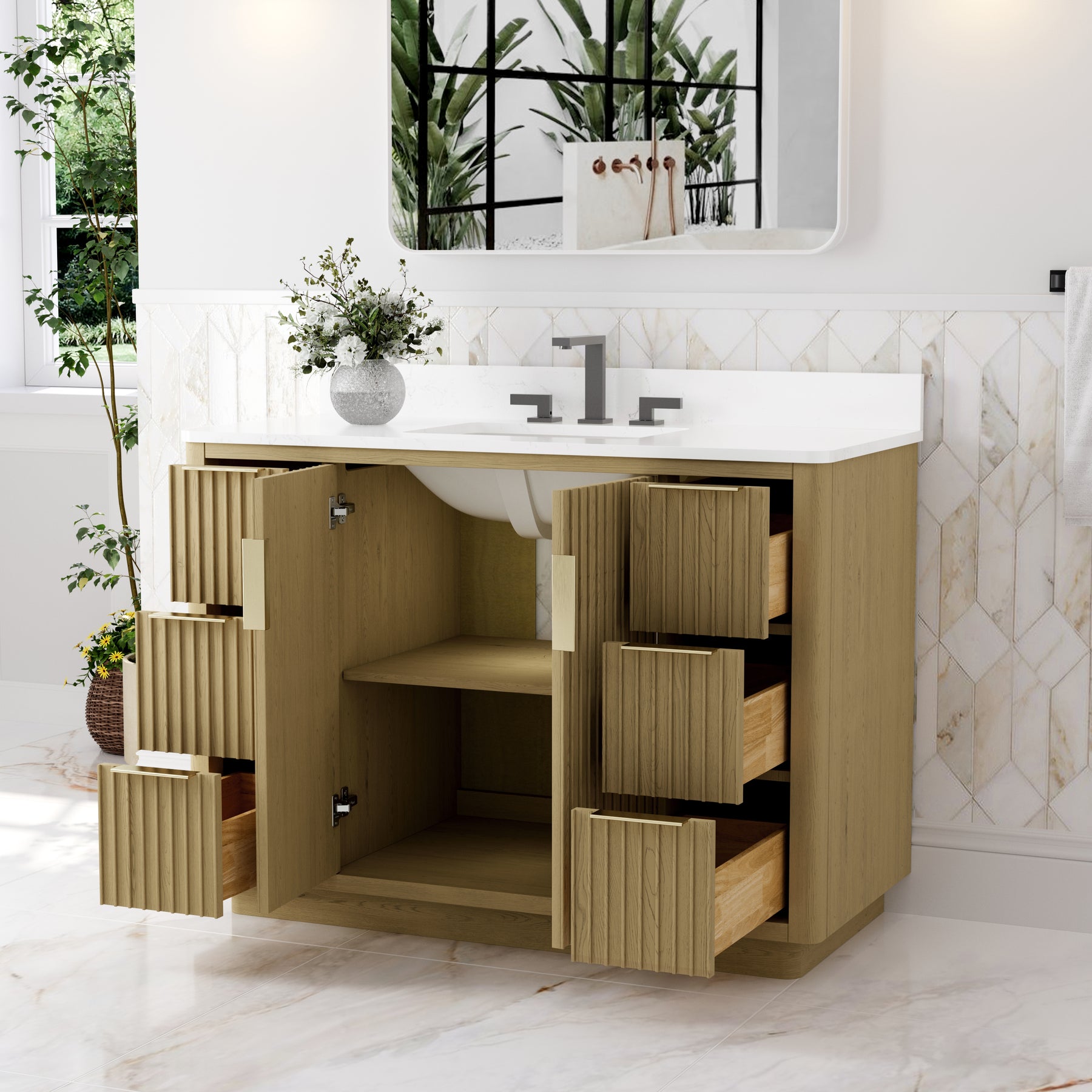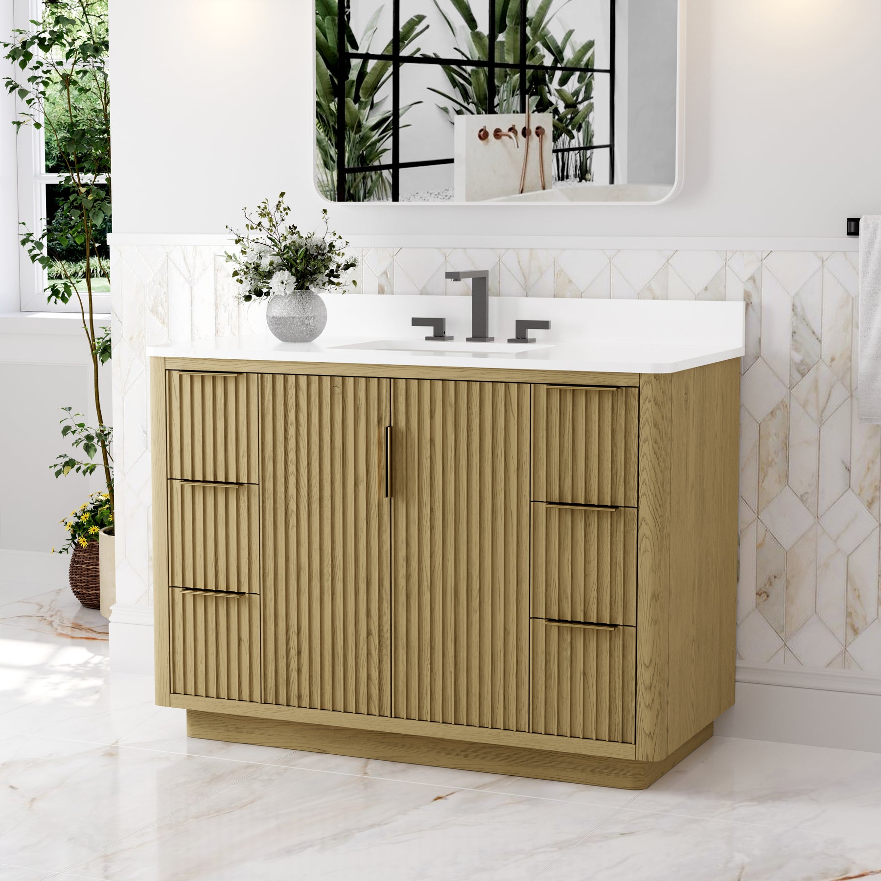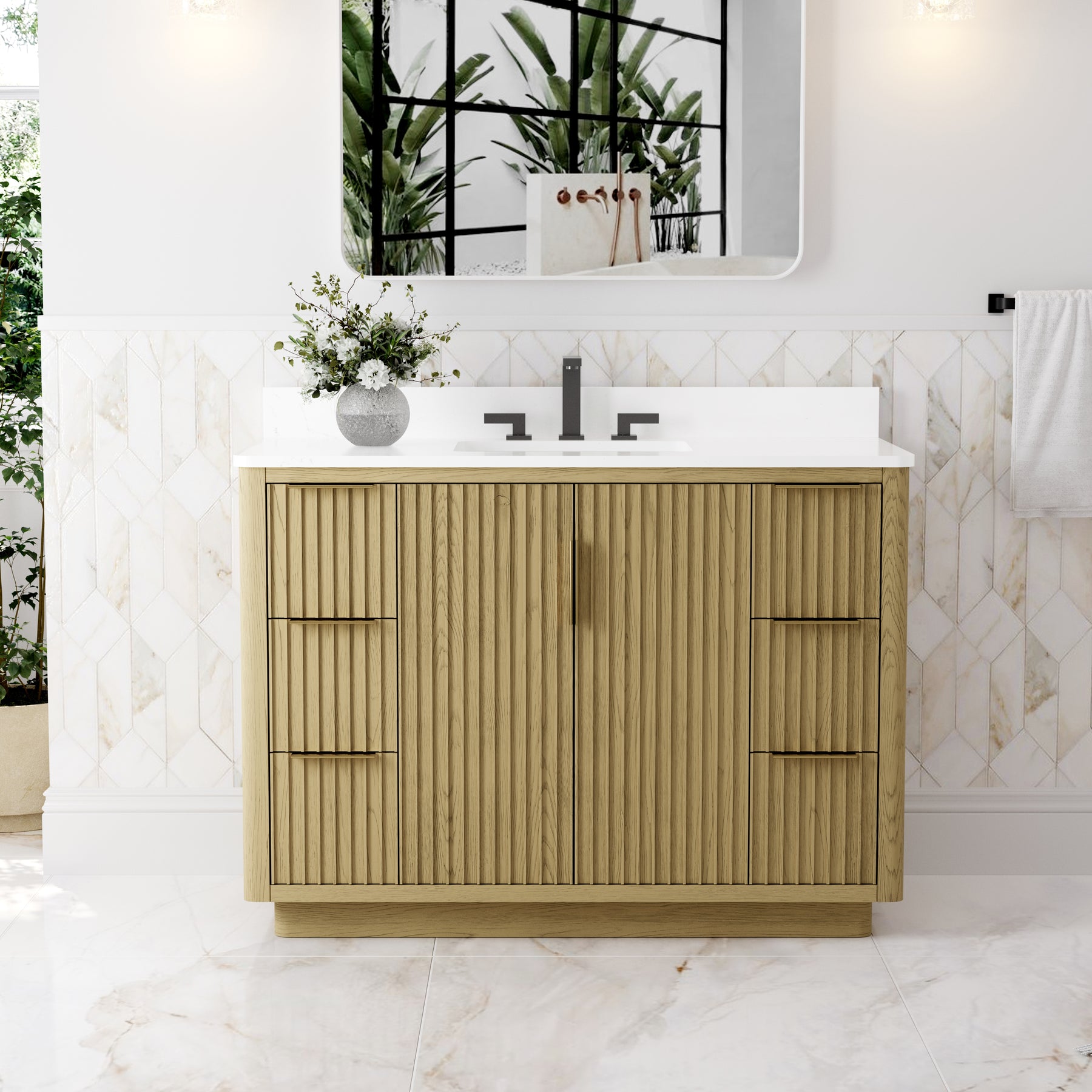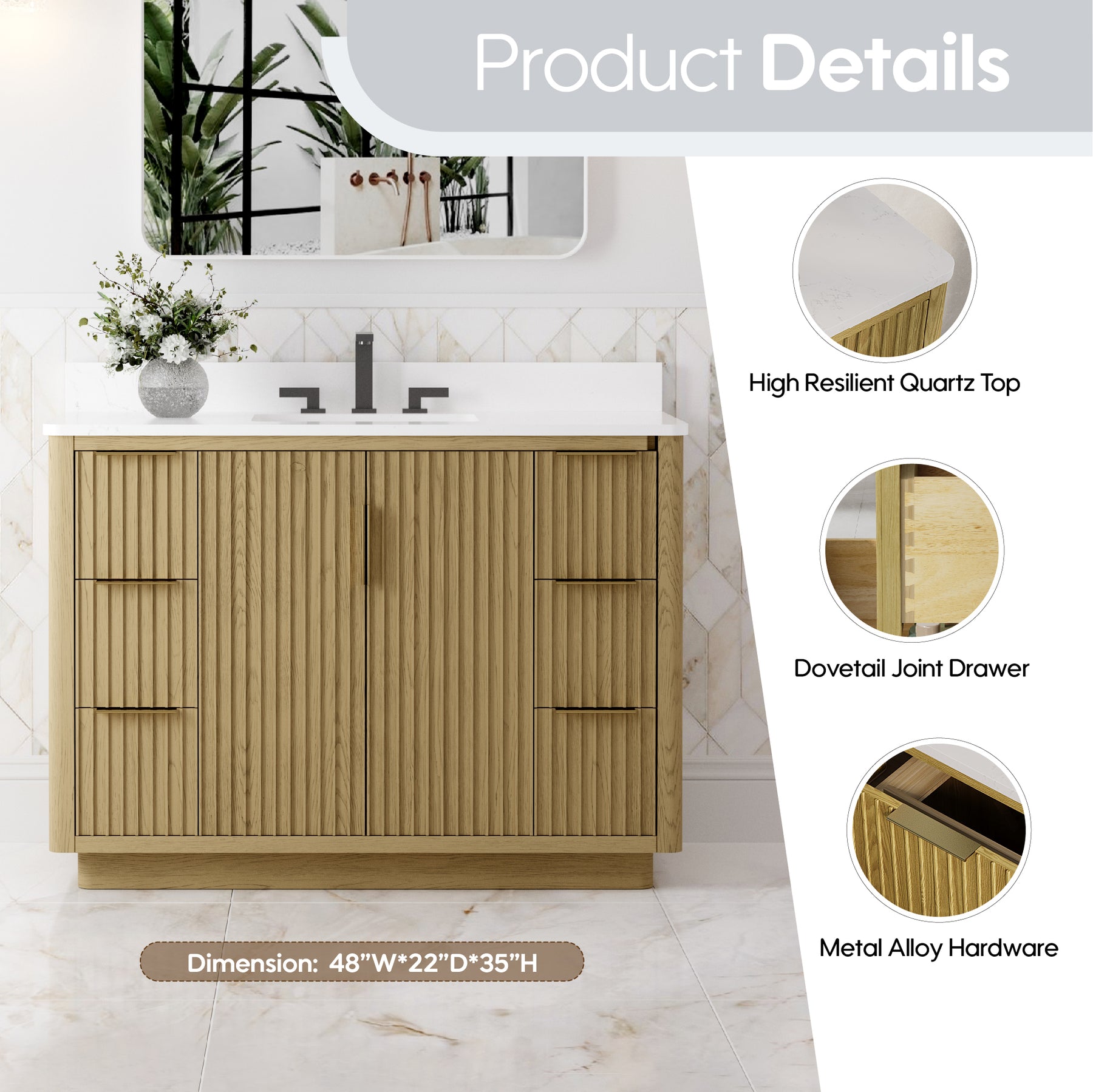 - Premium Vanity Top: High-quality quartz or marble with a single undermount sink for a refined look.