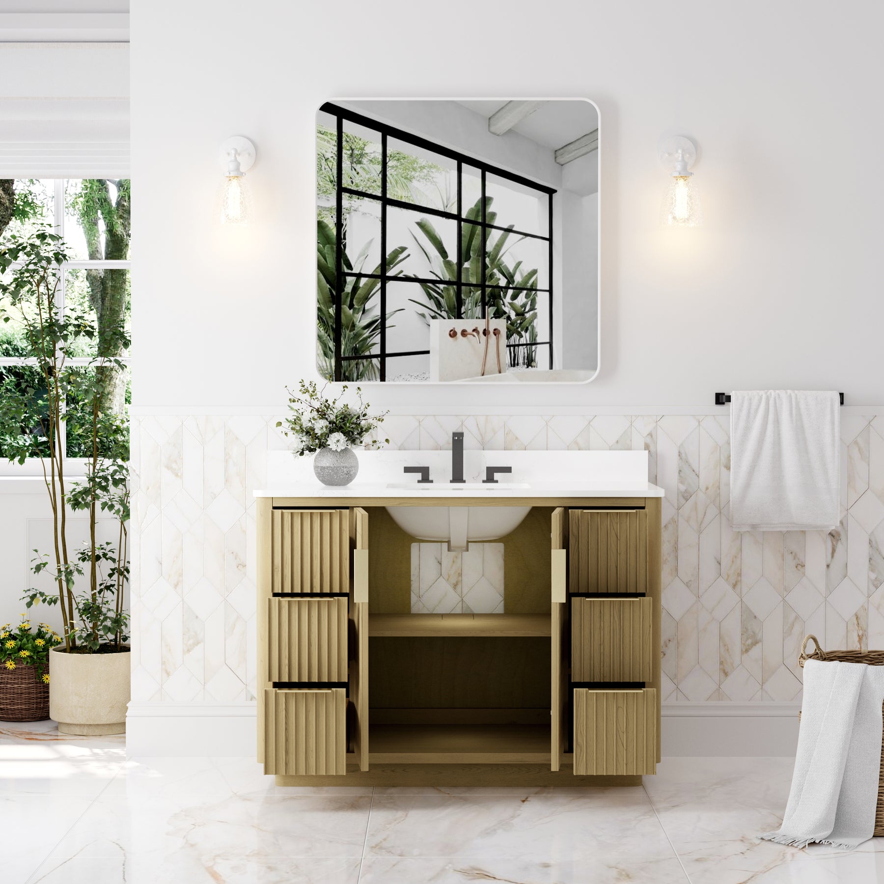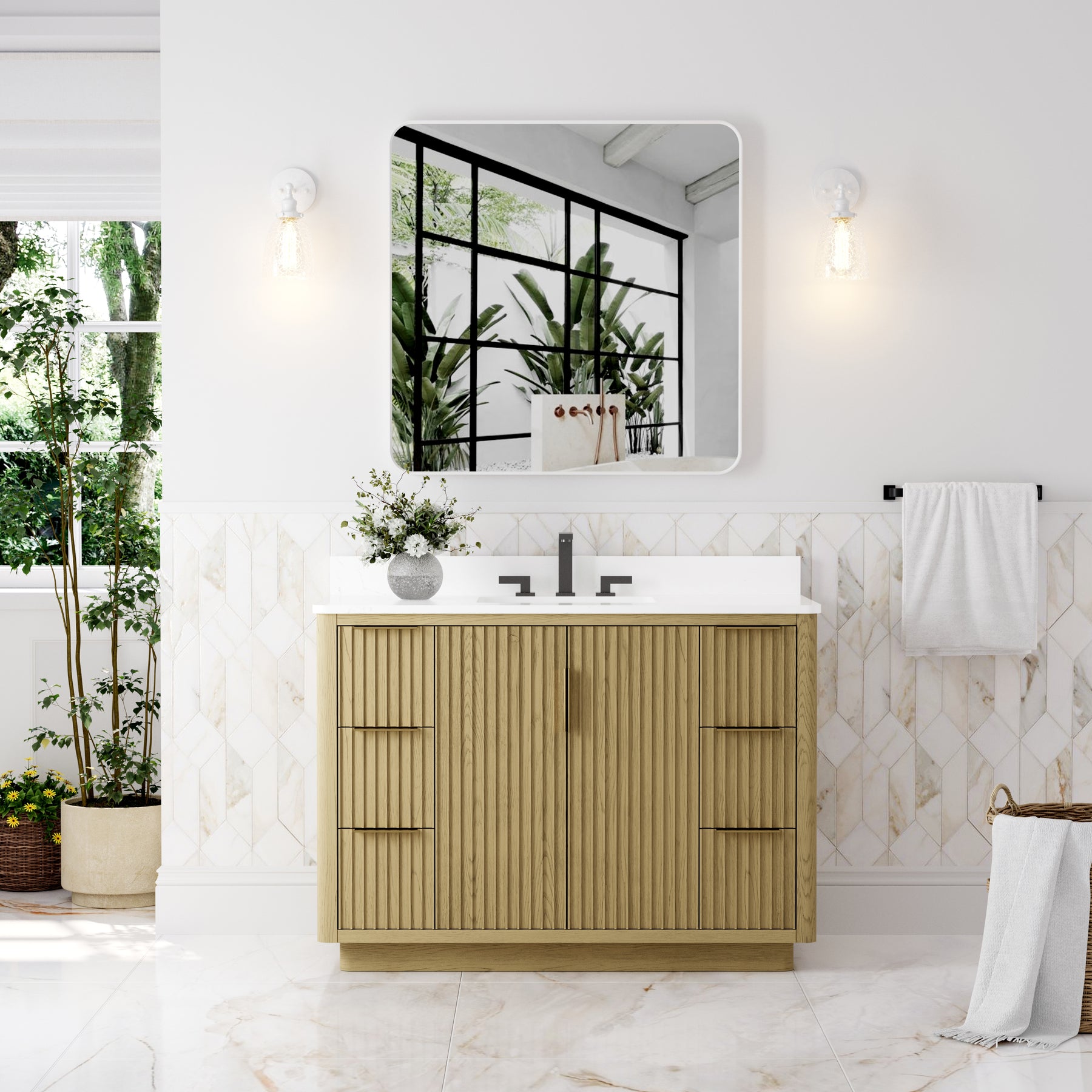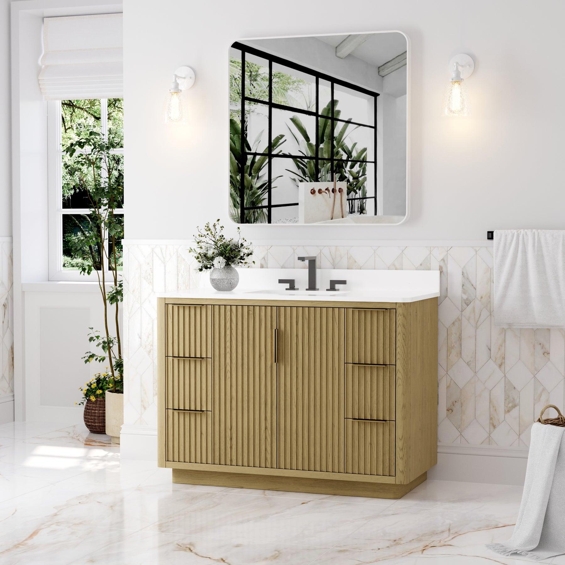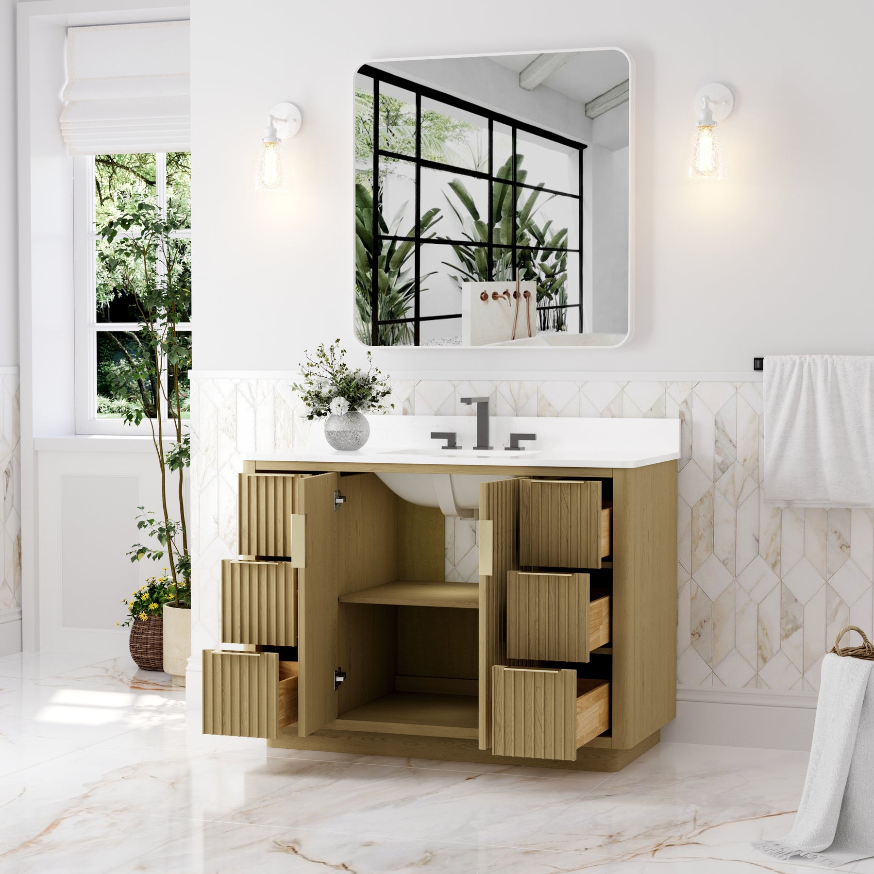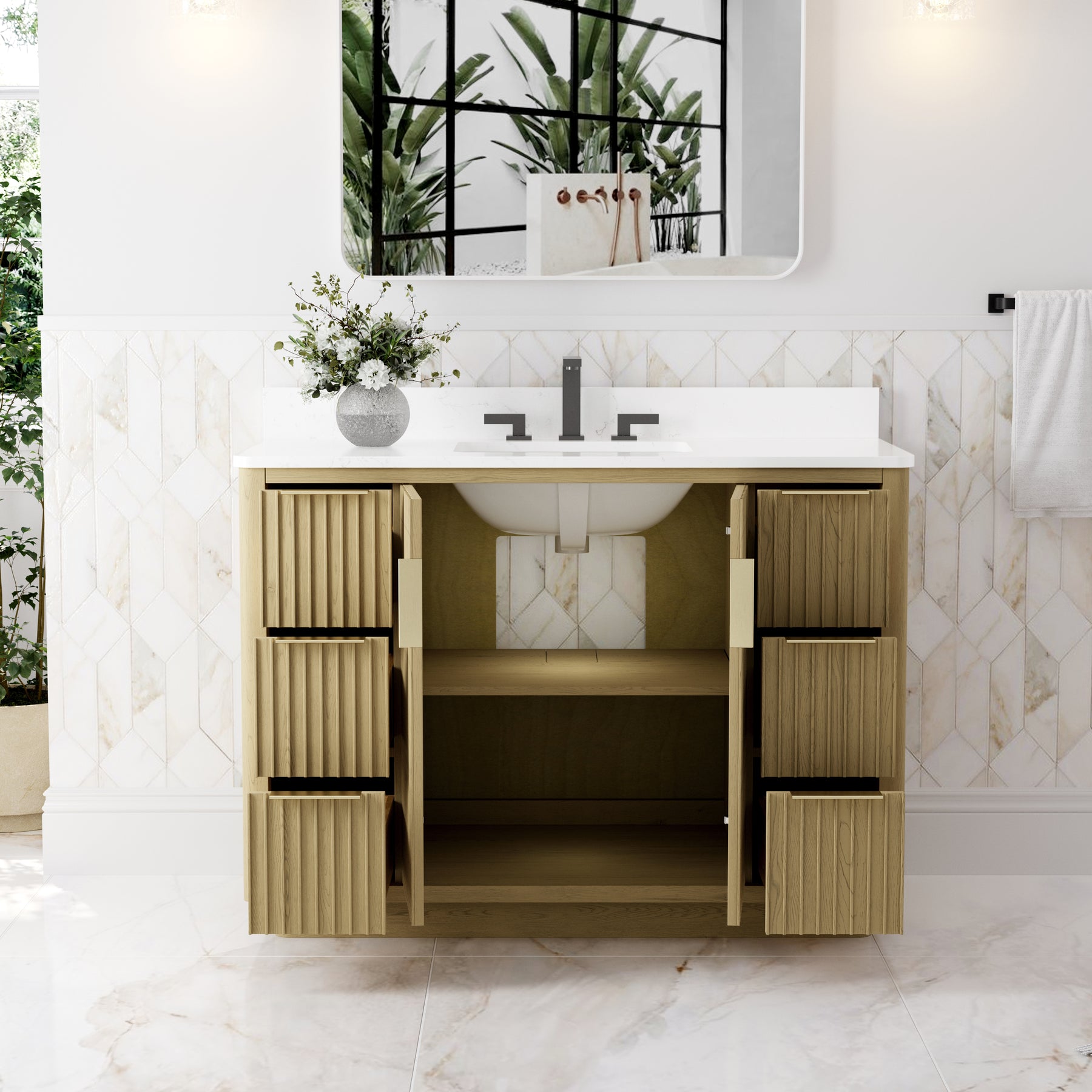 - Premium Vanity Top: High-quality quartz or marble with a single undermount sink for a refined look.