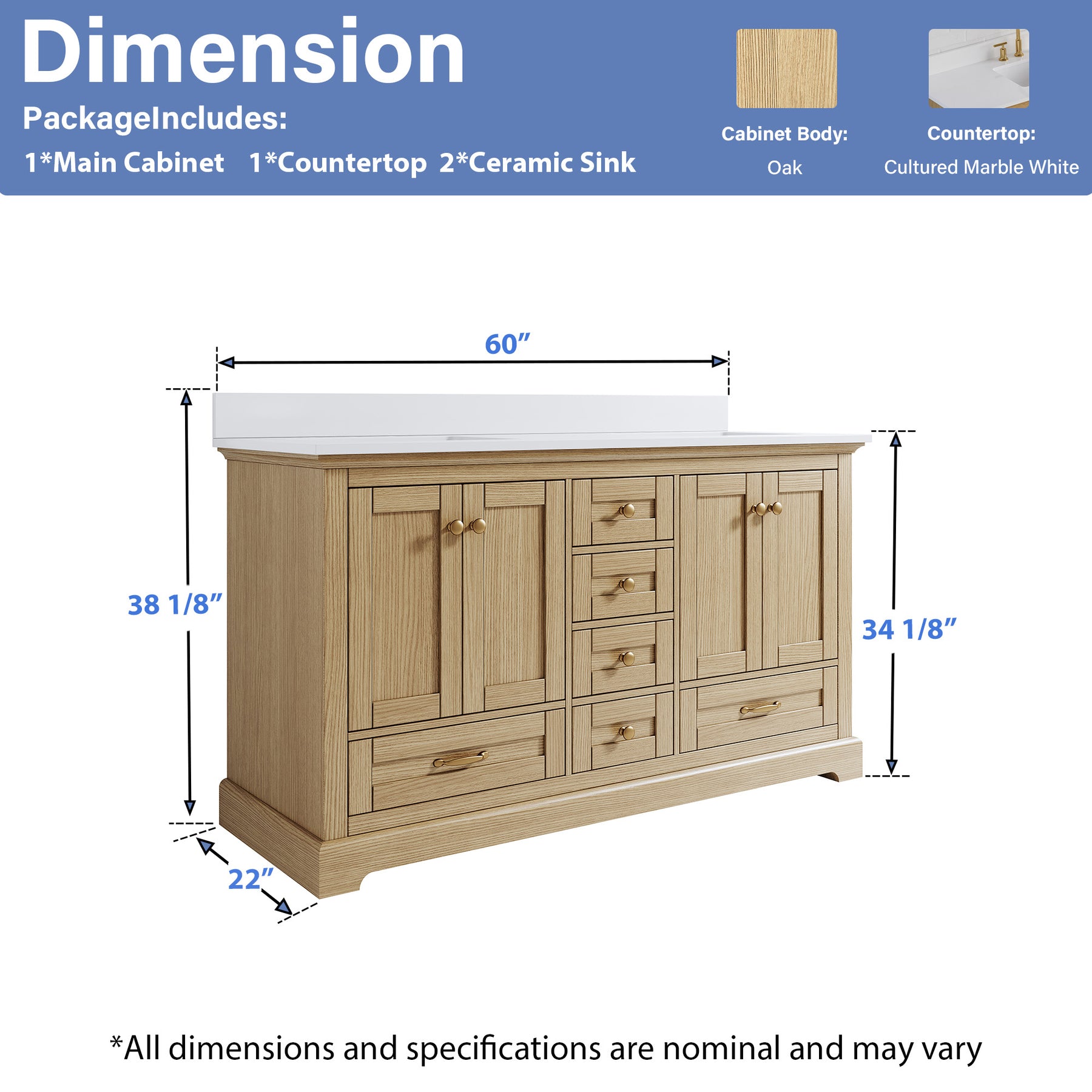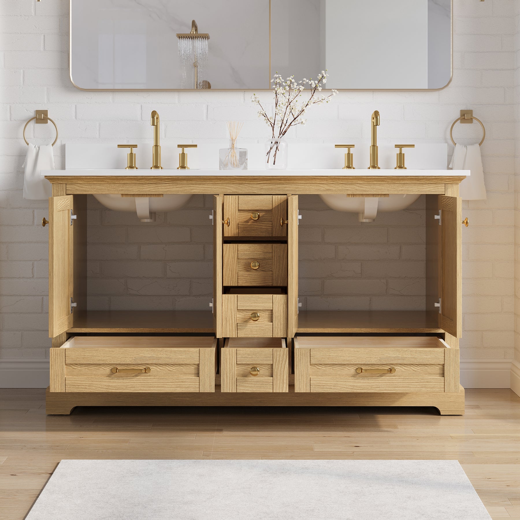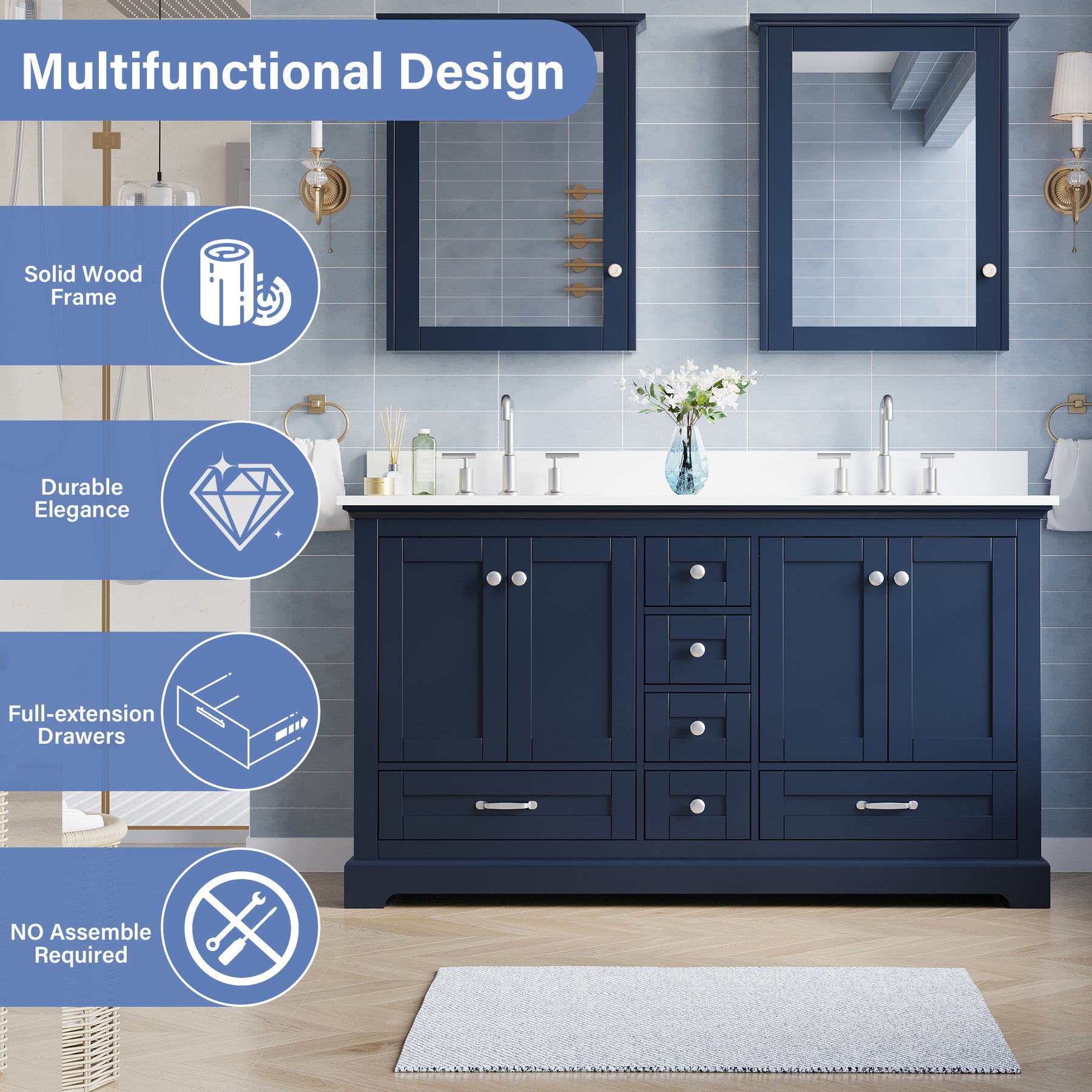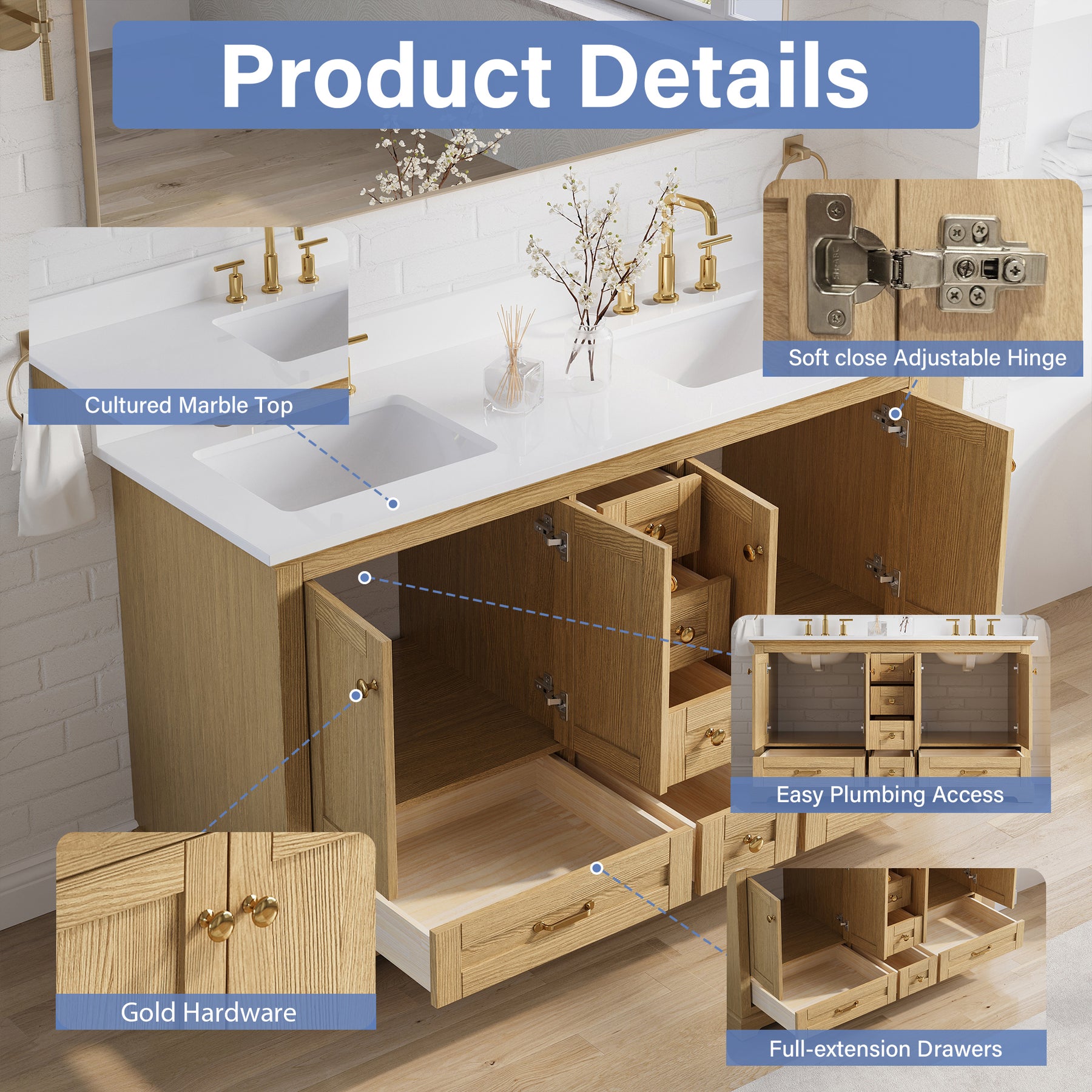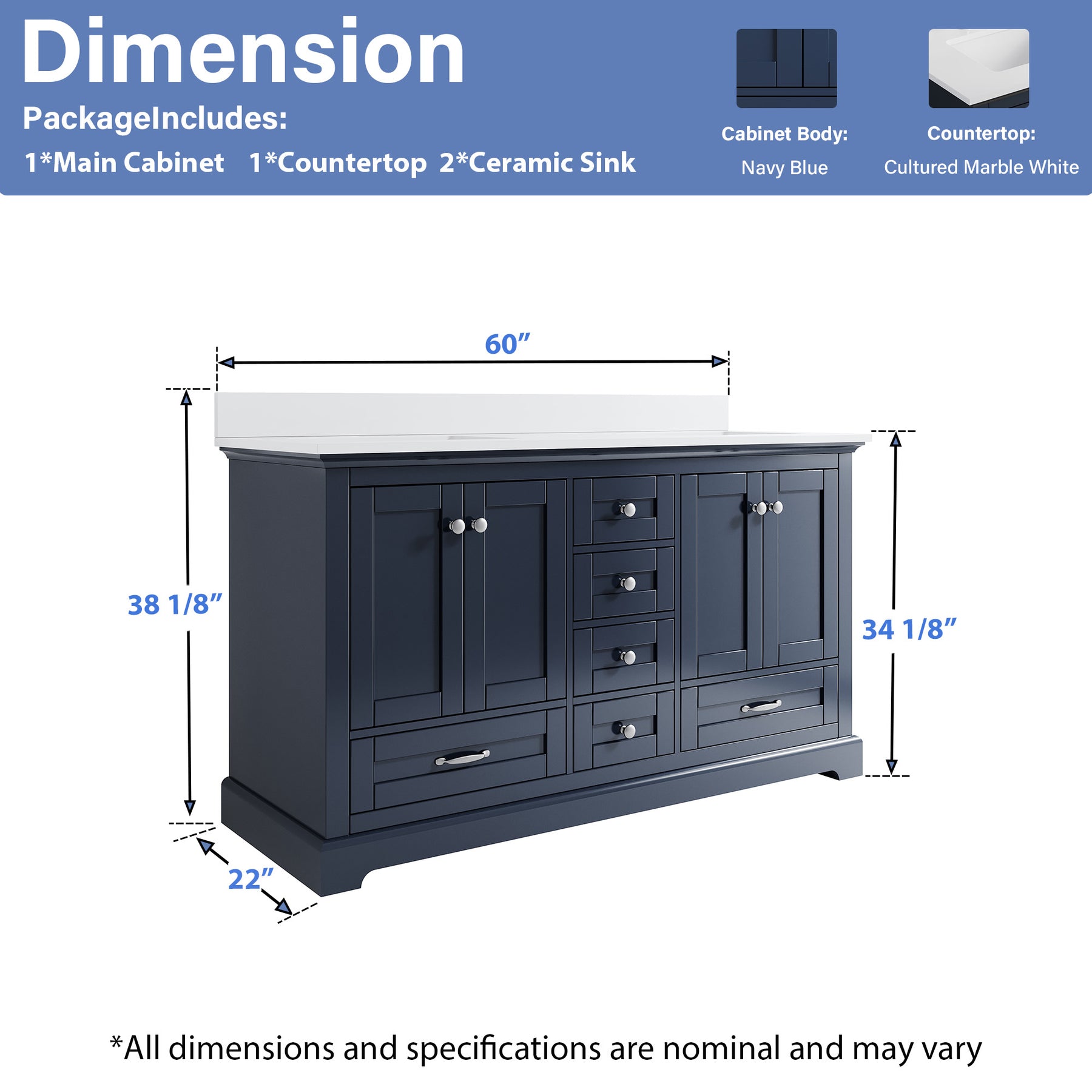 - Included Components: Backsplash, Basins, Drawers, Floor Cabinet, Hardware, Pull Handles