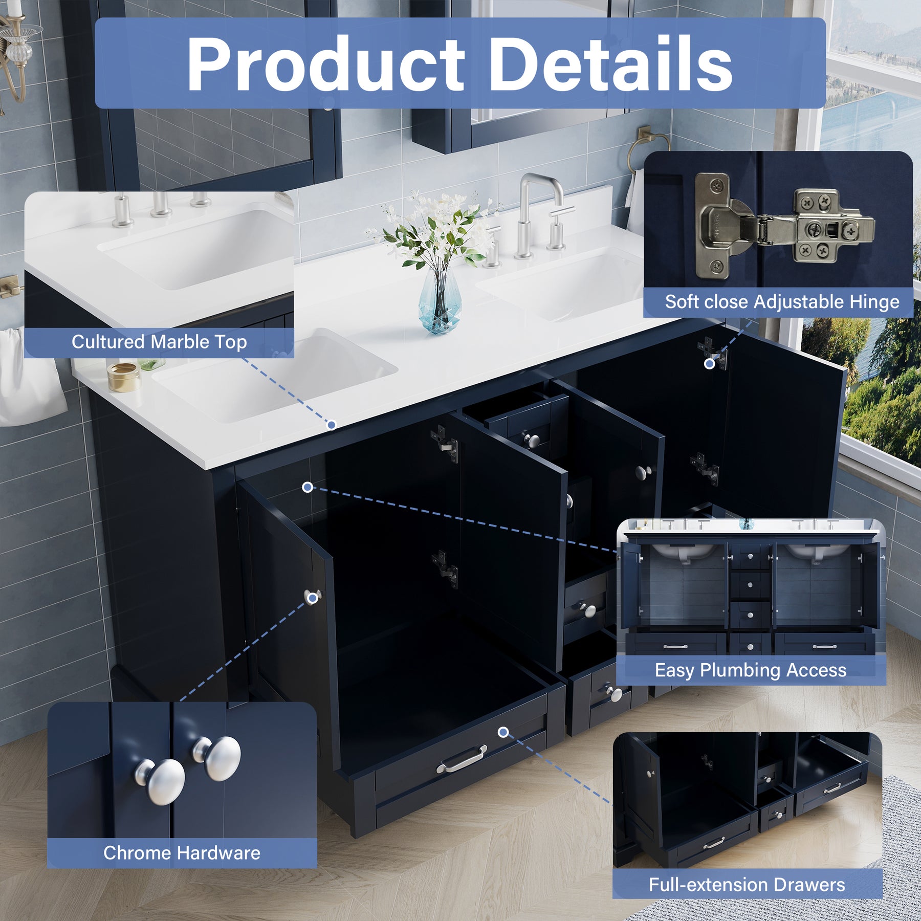 - Elegant Marble Top with Sink: Features an 18mm pure white culutered marble countertop that adds a clean, modern look to any bathroom.