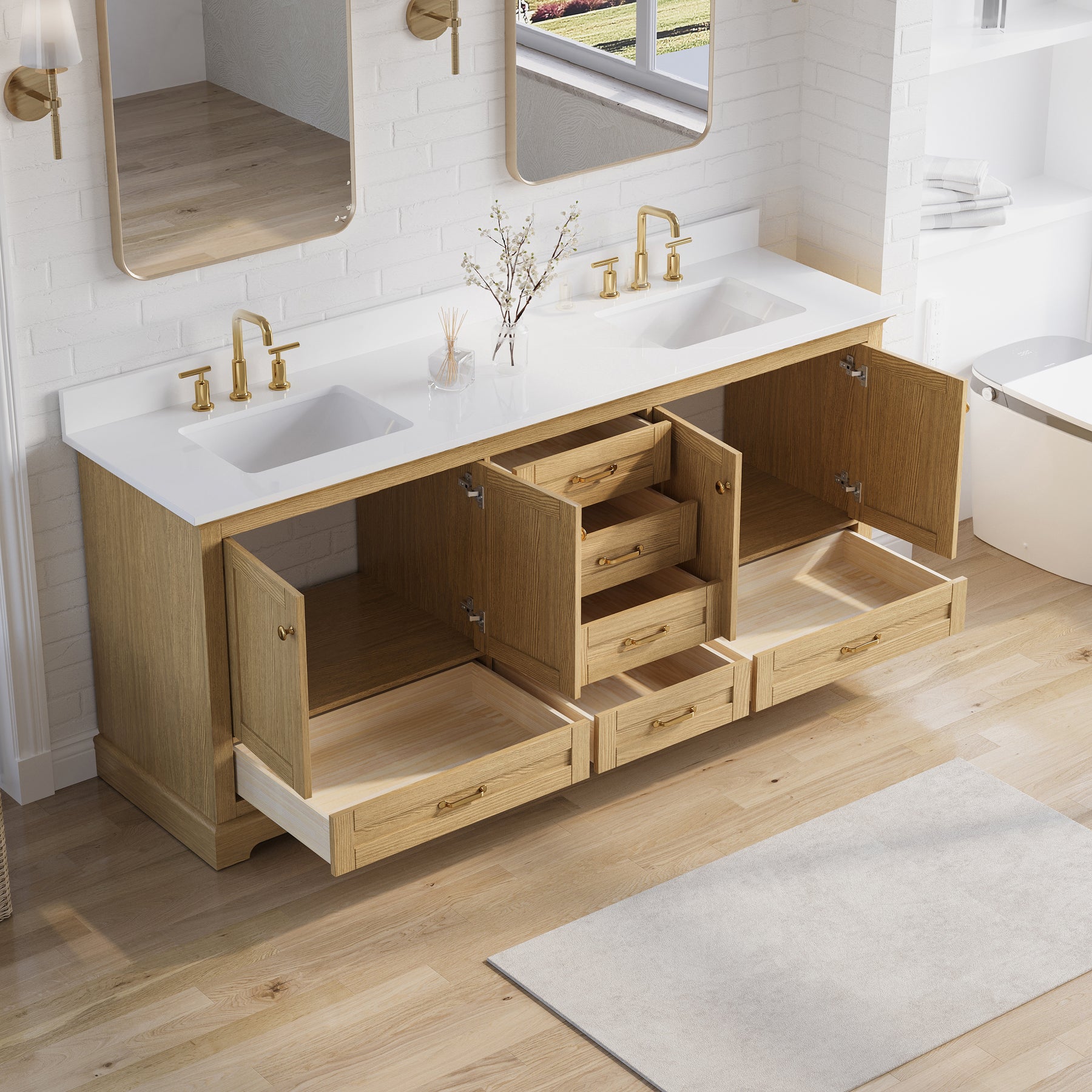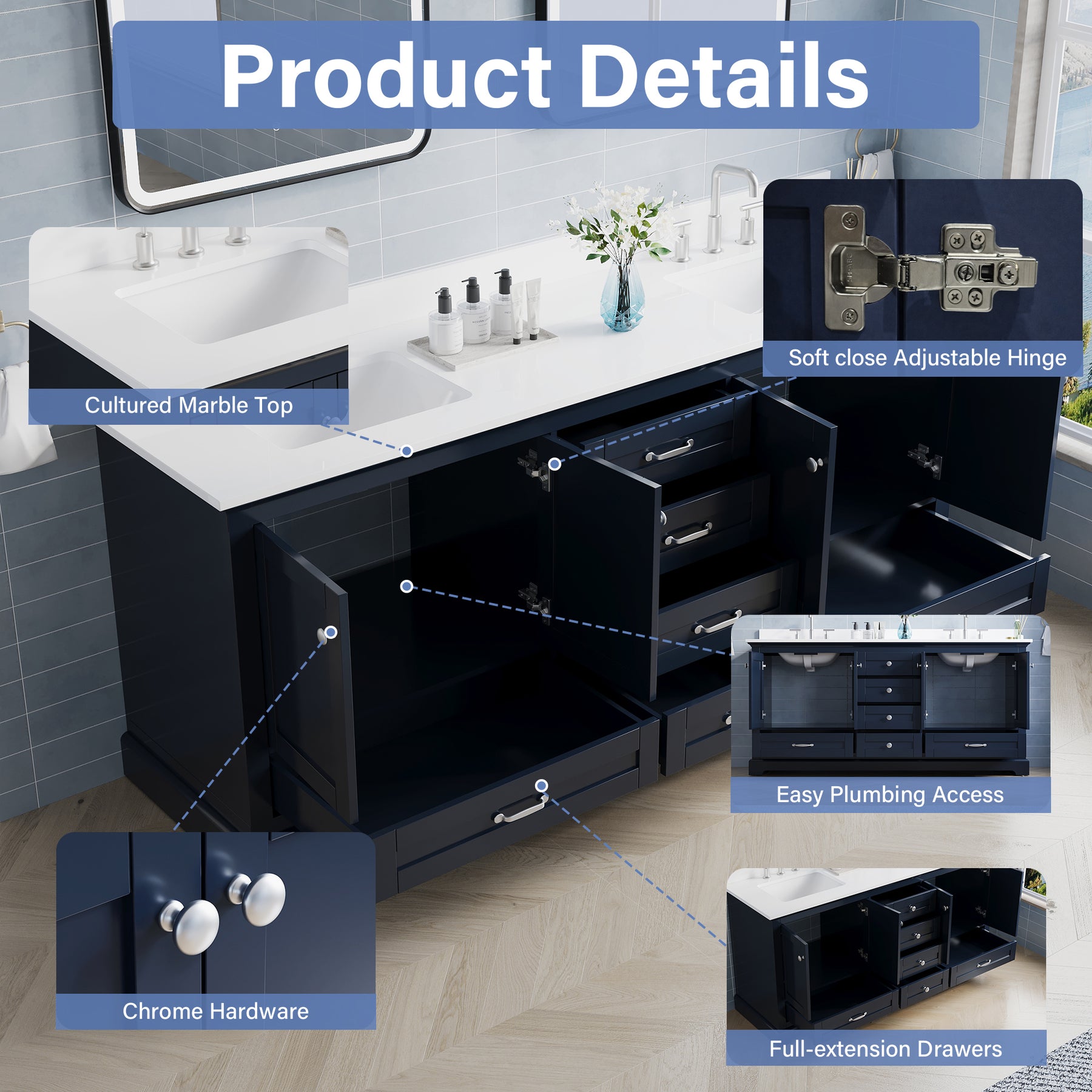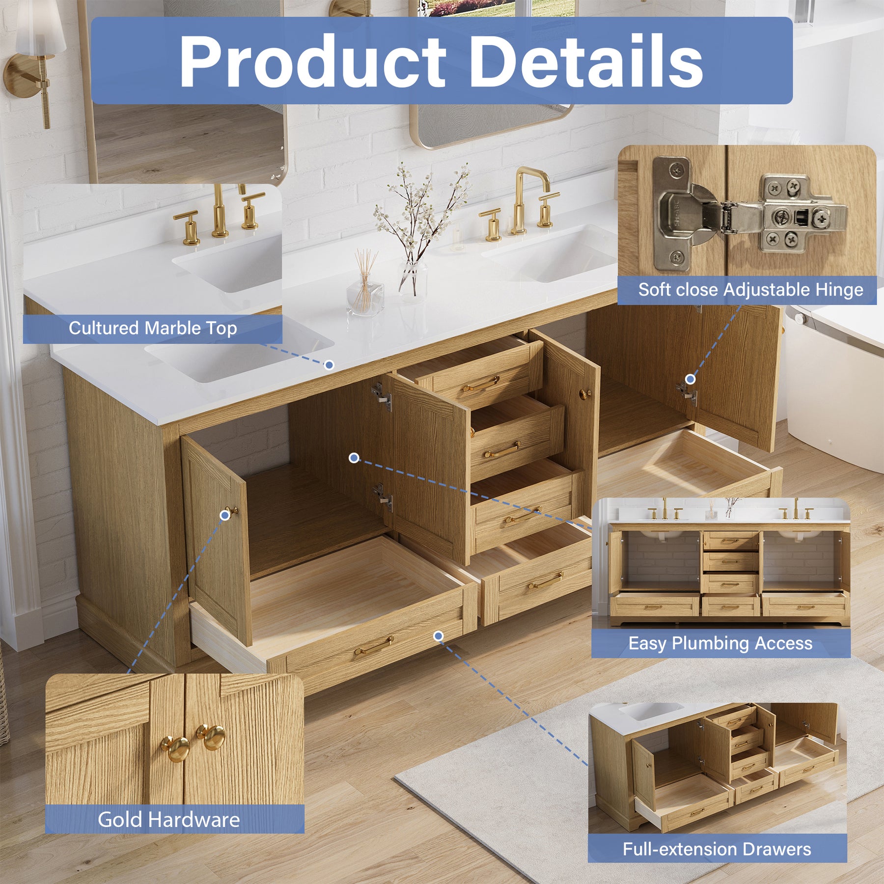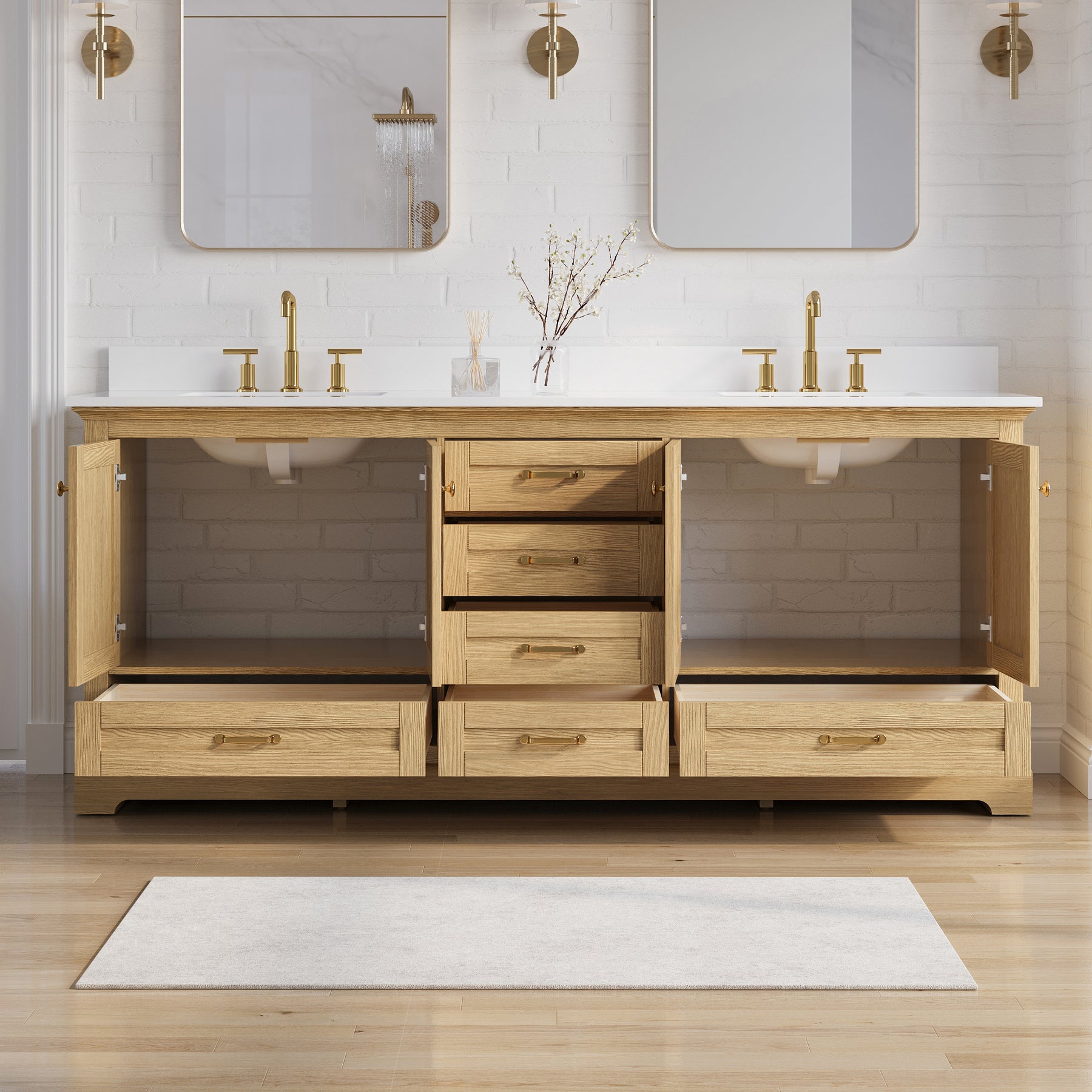 - Ample Organized Storage: Designed as a spacious double sink bathroom vanity, it features 4 cabinet doors and 6 soft-closing drawers, providing exceptional storage for towels, toiletries, and daily essentials.