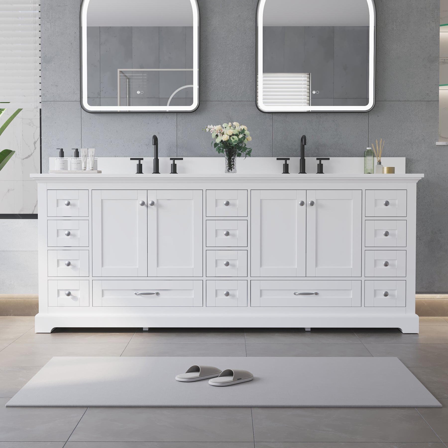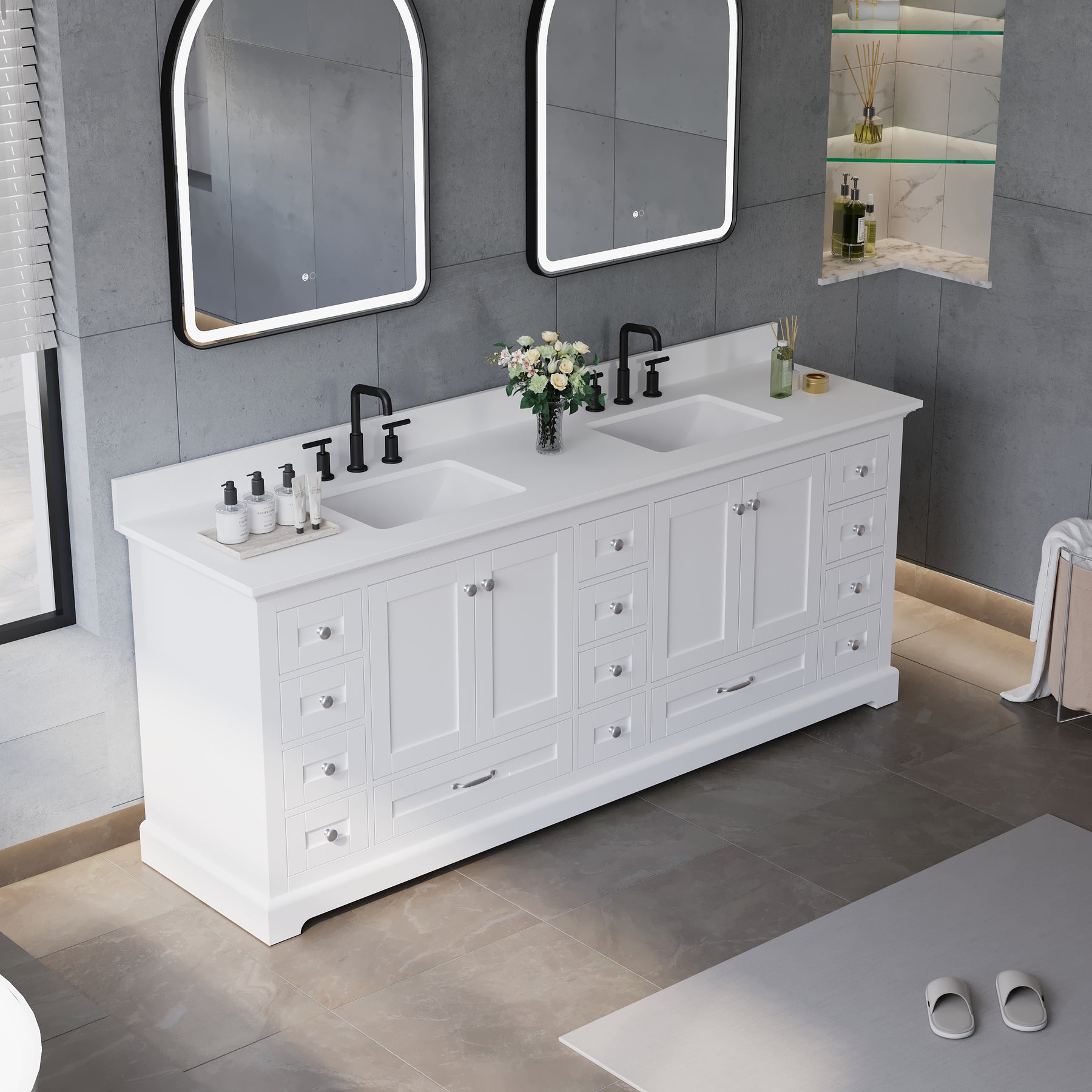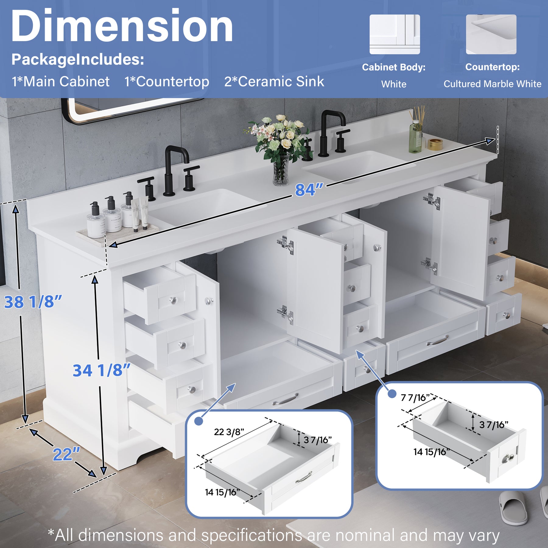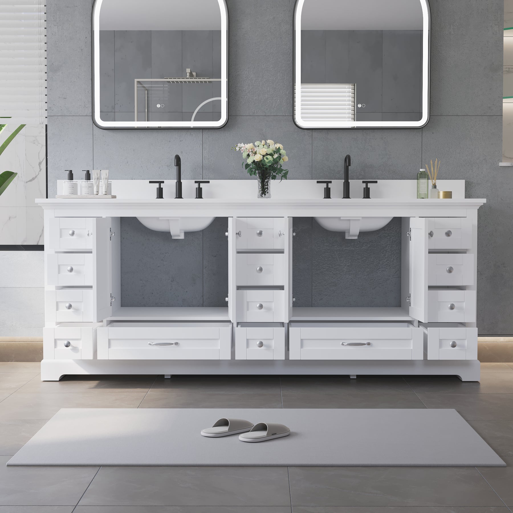 - Ample Organized Storage: Designed as a spacious double sink bathroom vanity, it features 4 cabinet doors and 14 soft-closing drawers, providing exceptional storage for towels, toiletries, and daily essentials.