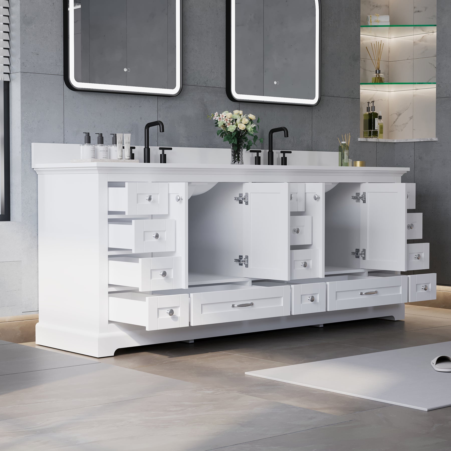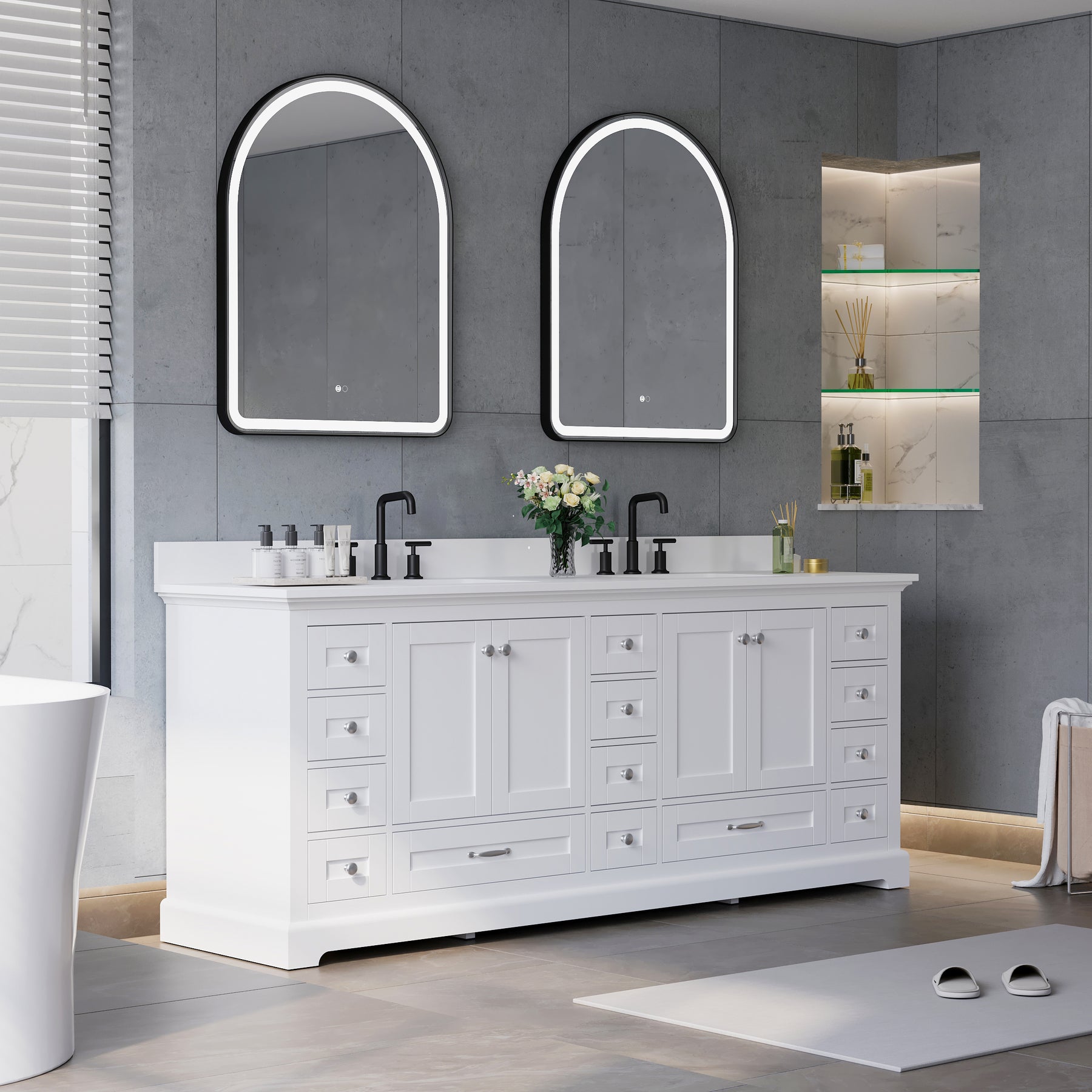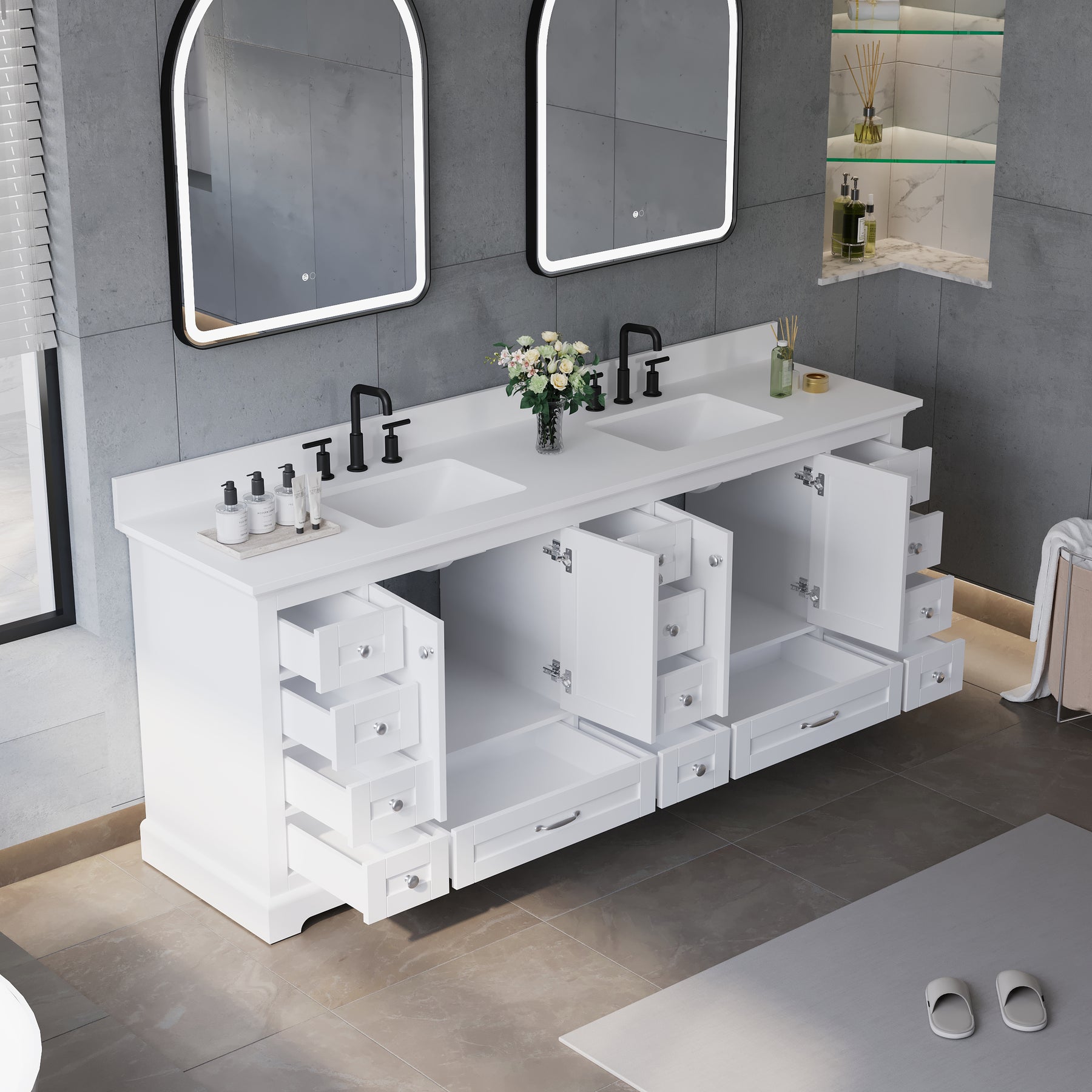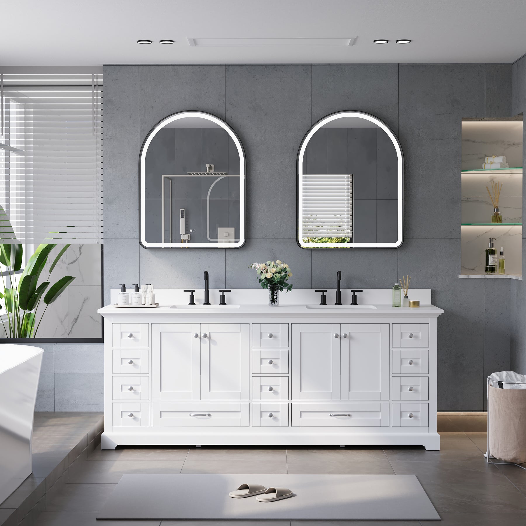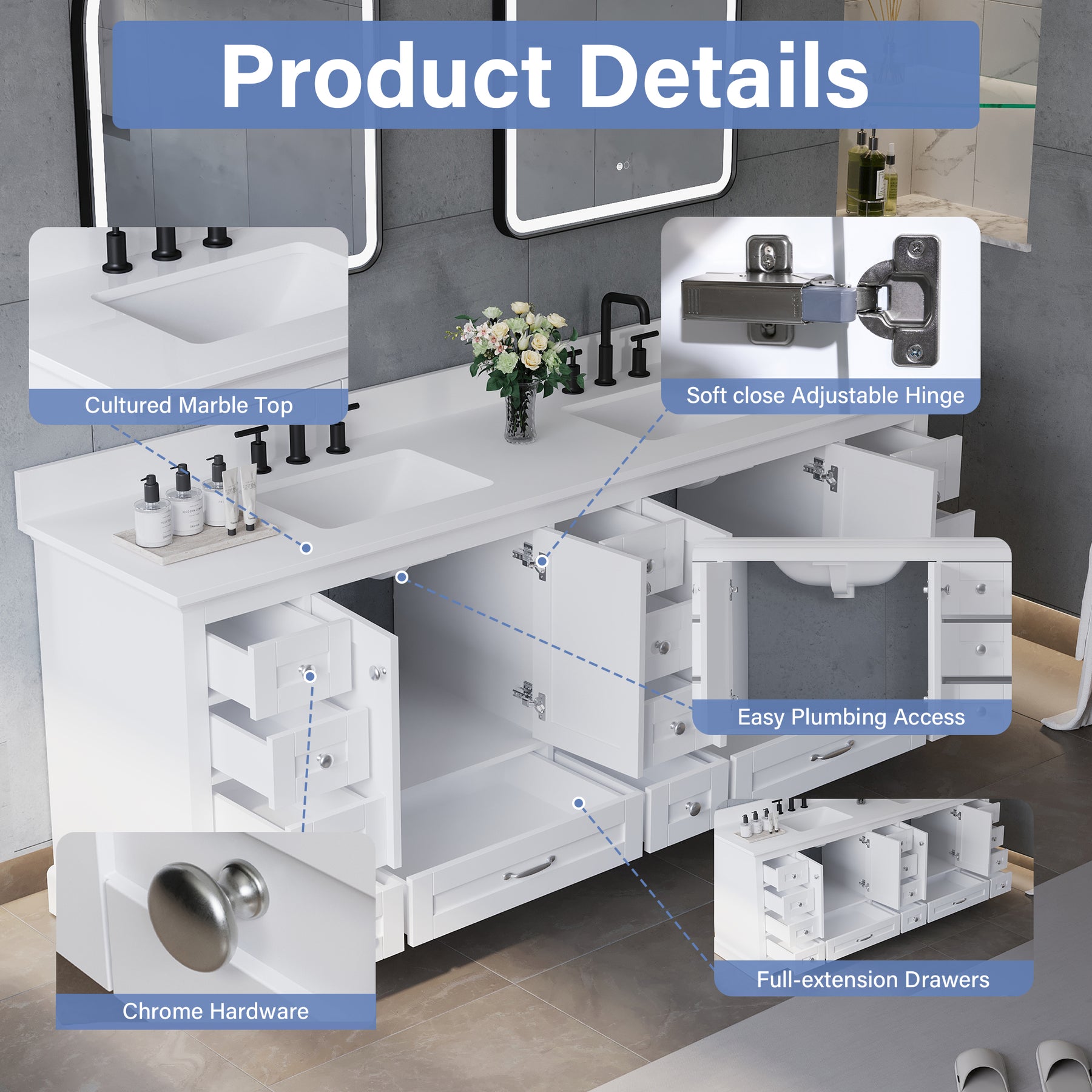 - Ample Organized Storage: Designed as a spacious double sink bathroom vanity, it features 4 cabinet doors and 14 soft-closing drawers, providing exceptional storage for towels, toiletries, and daily essentials.