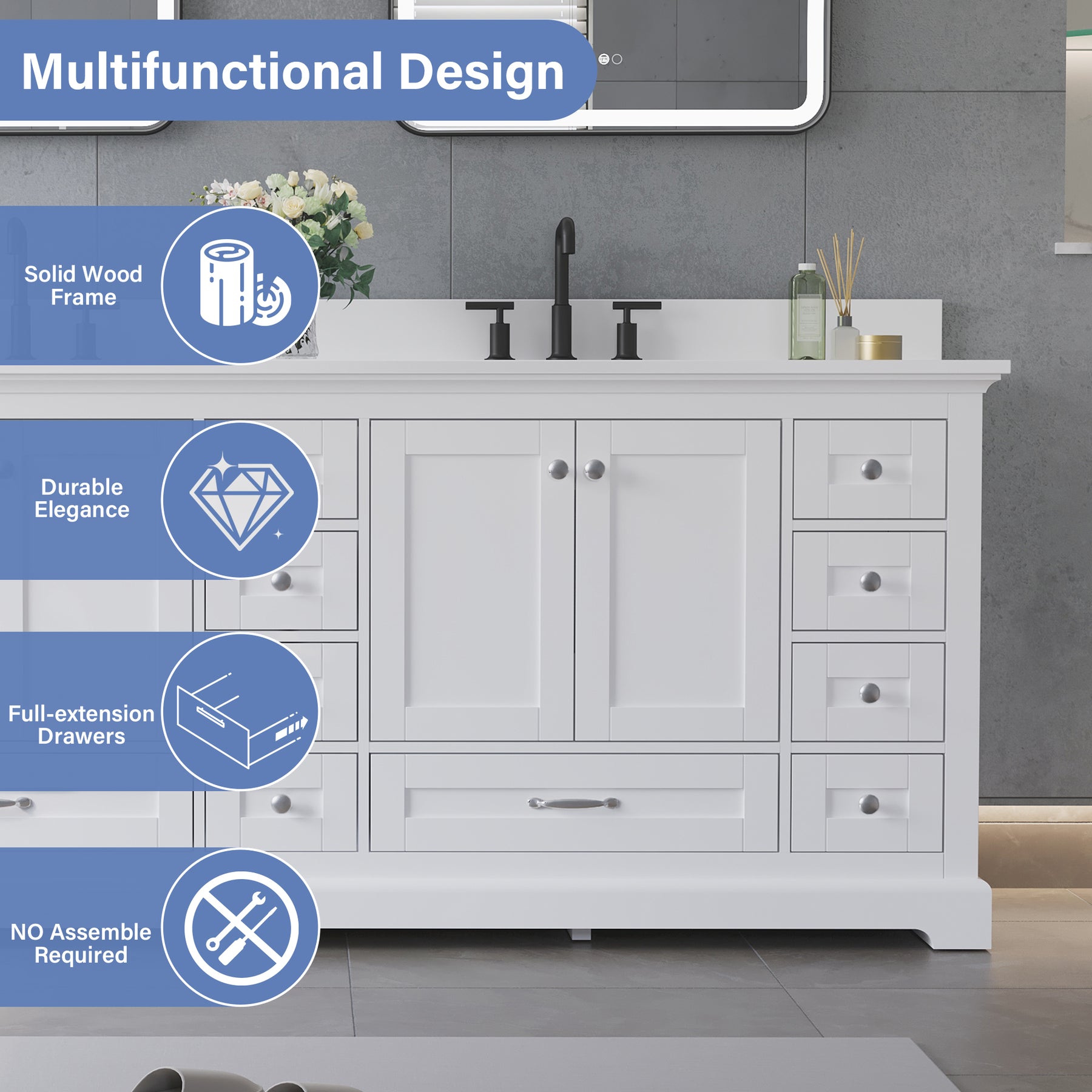 - High-Quality cUPC Certified Basin: Includes a seamlessly integrated cUPC certified basin, ensuring your bathroom vanity meets North American plumbing standards for safety and reliability.
