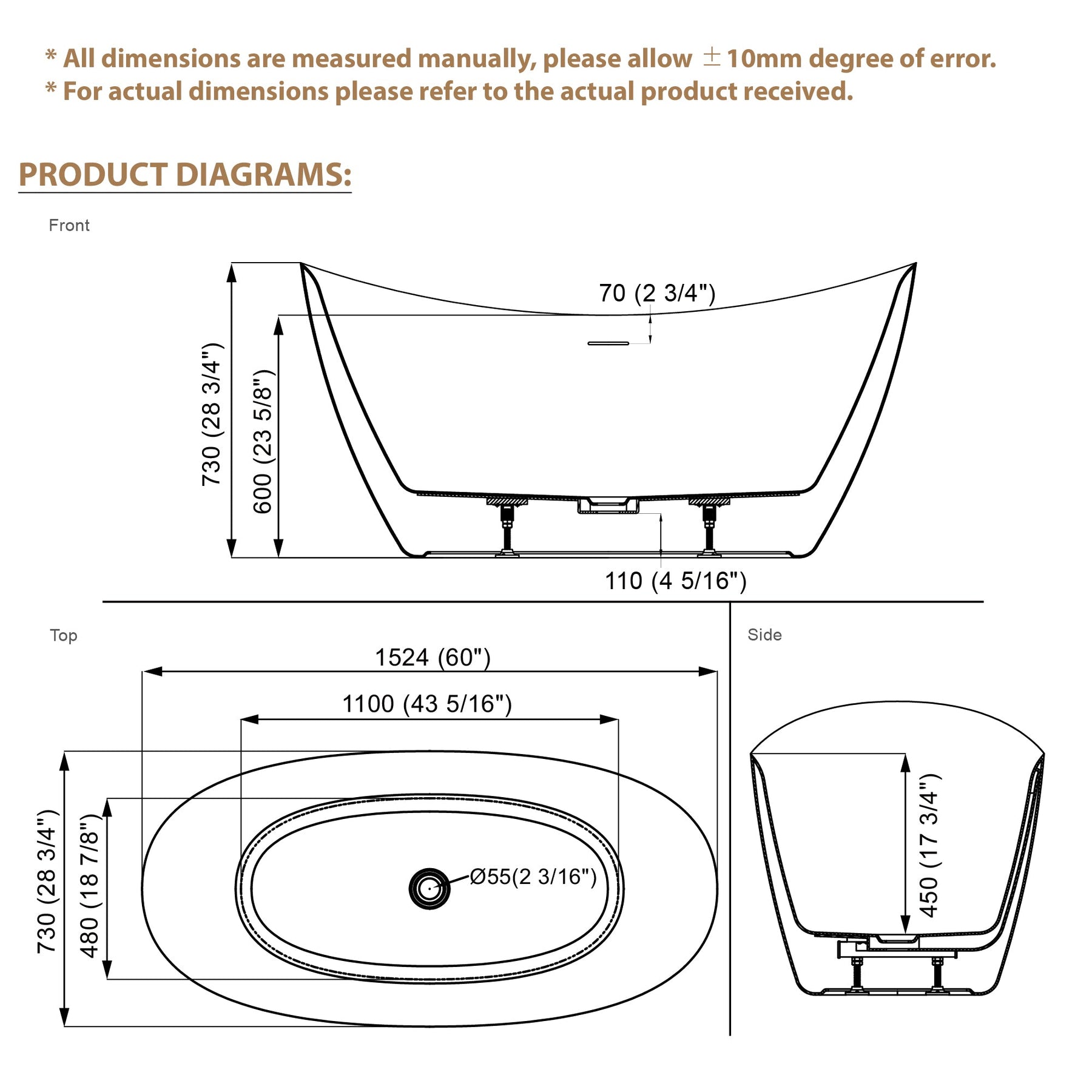 • Dimensions and Specifications: Exterior Dimension: 60" L x 28 3/4" W x 28 3/4" H – Effective Tub Capacity: 56 Gallons.