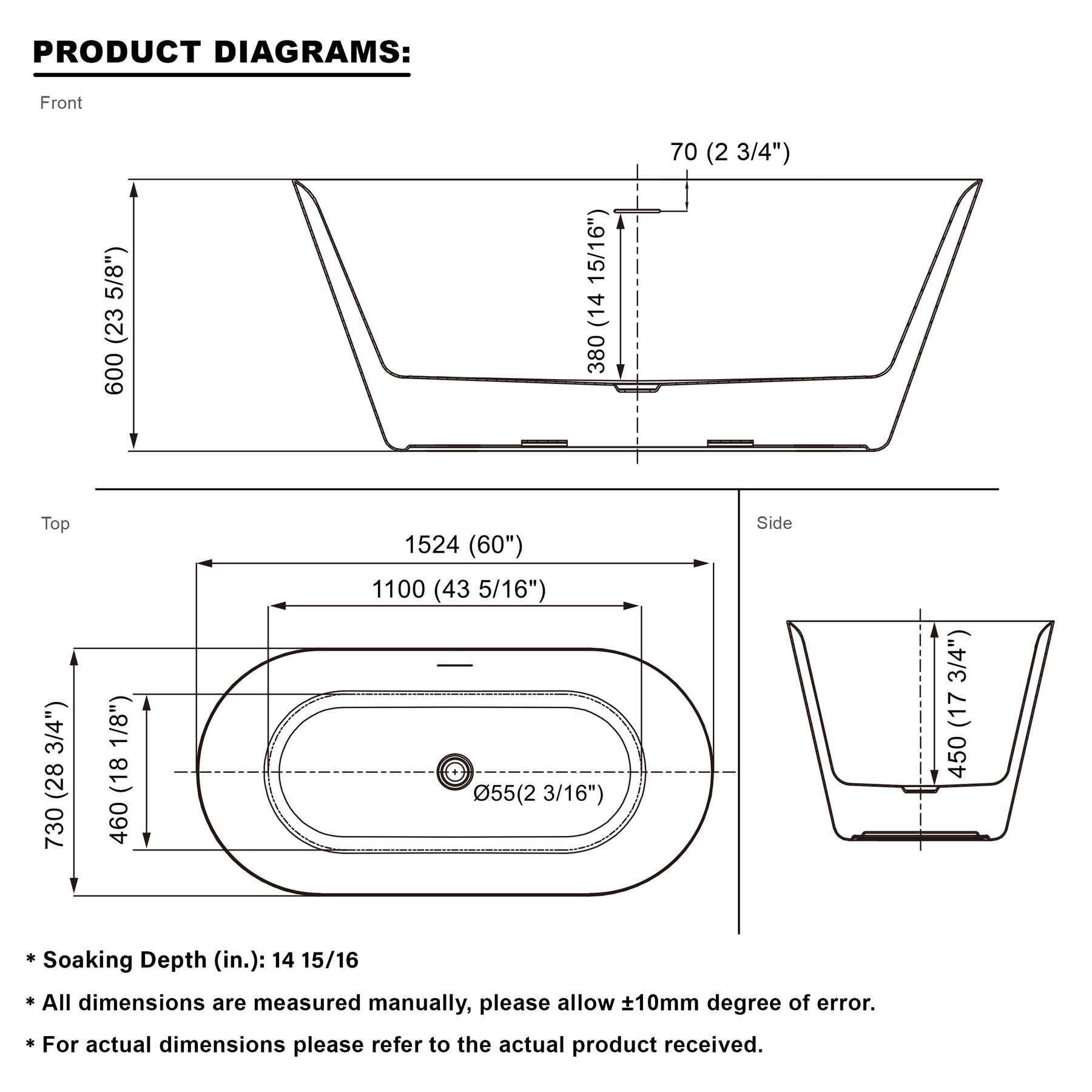 - Spacious Soaking Experience: With a nominal dimension of 60"*28 3/4"*23 5/8", this freestanding tub offers generous space for a relaxing and immersive bathing experience.
