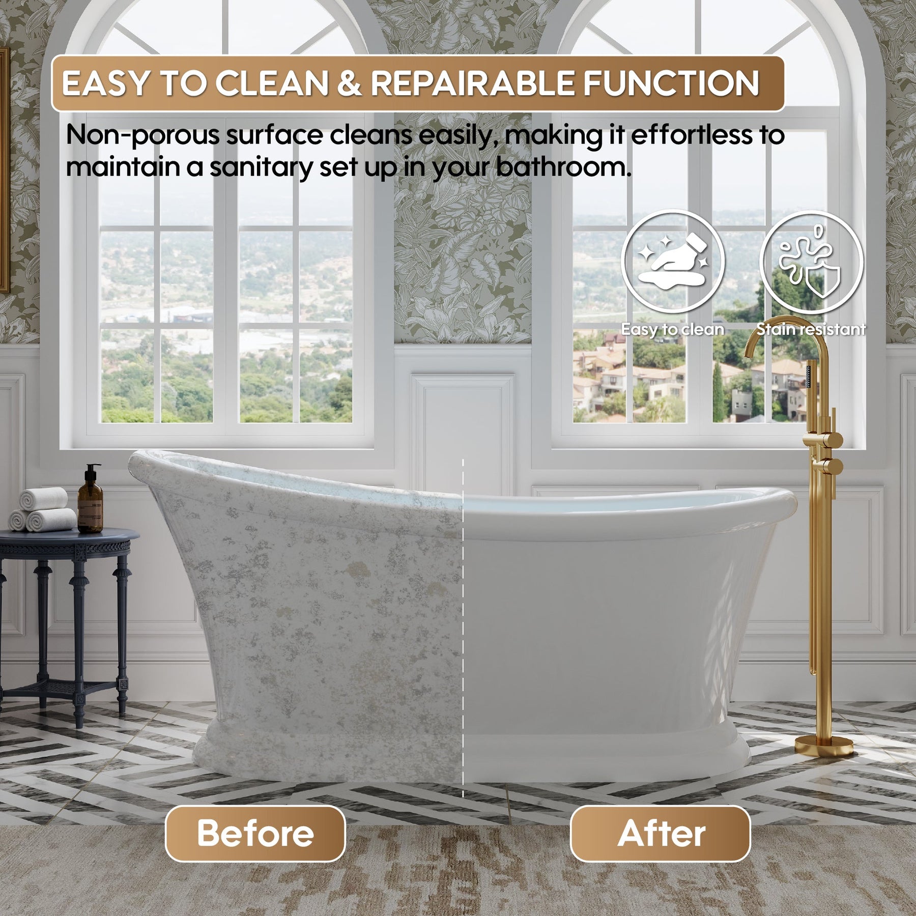 - Premium Material: Freestanding bathtub crafted from high-quality 100% pure virgin acrylic, ensuring superior strength, durability, and resistance to stains and yellowing compared to recycled materials.