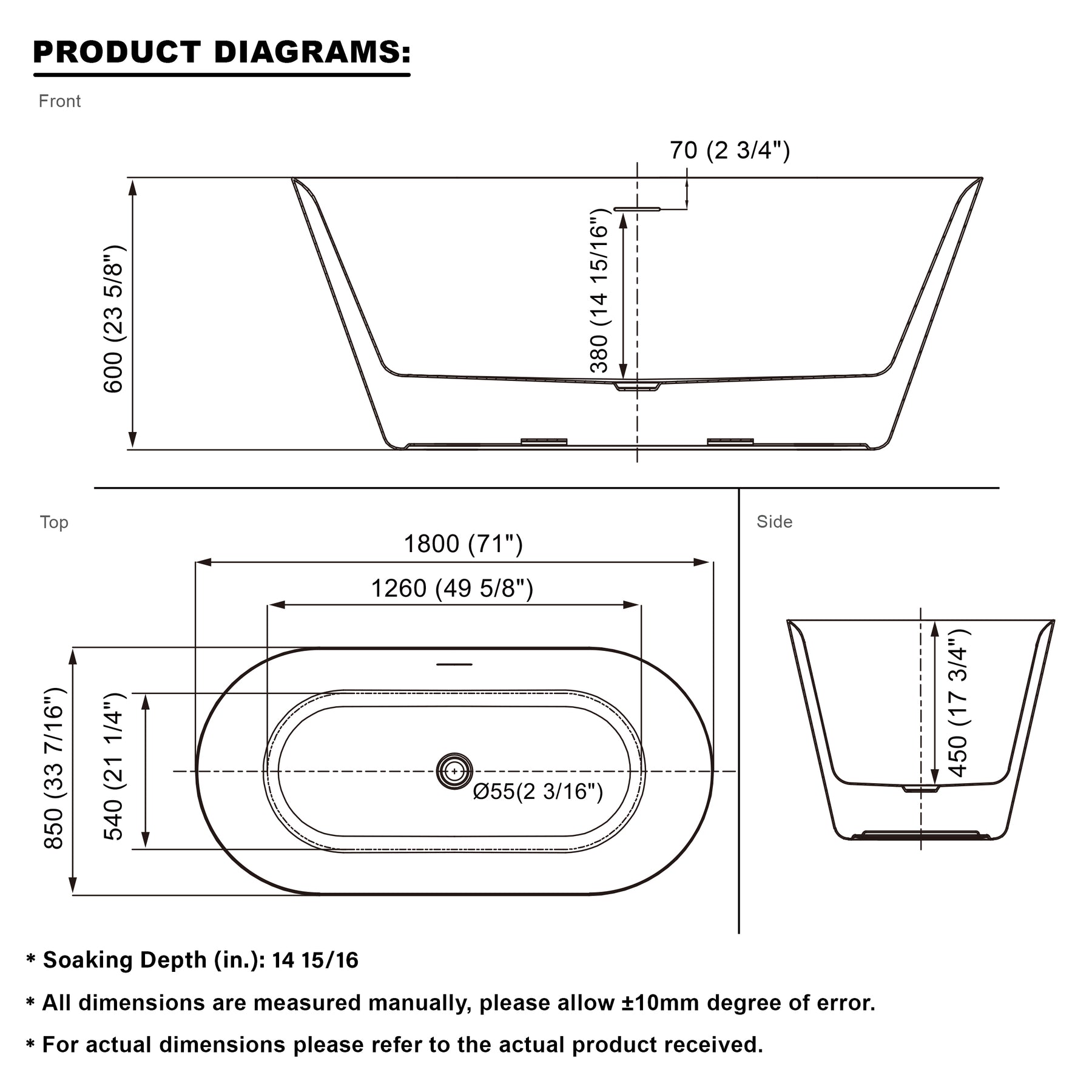 - Spacious Soaking Experience: With a nominal dimension of 71"*33 7/16"*23 5/8", this freestanding tub offers generous space for a relaxing and immersive bathing experience.