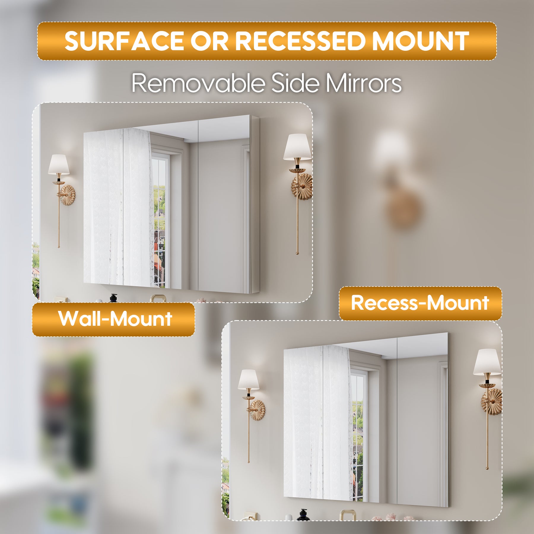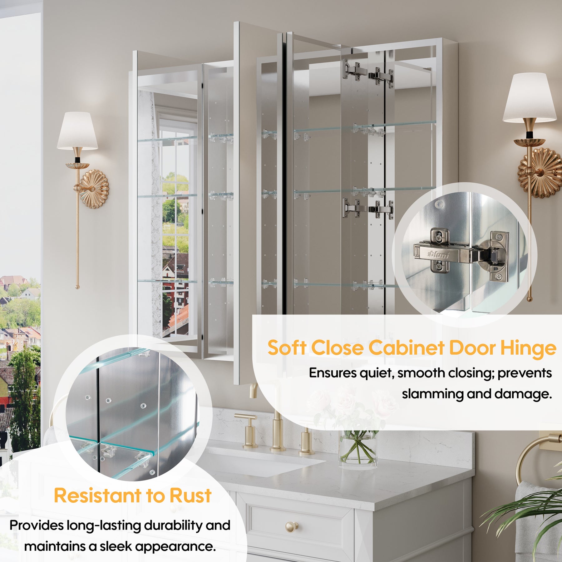 • Reversible Door Design: Copper-free tri-view mirror cabinet with 180° reversible installation, allowing the door to open from either the left or right side for flexible bathroom layouts.