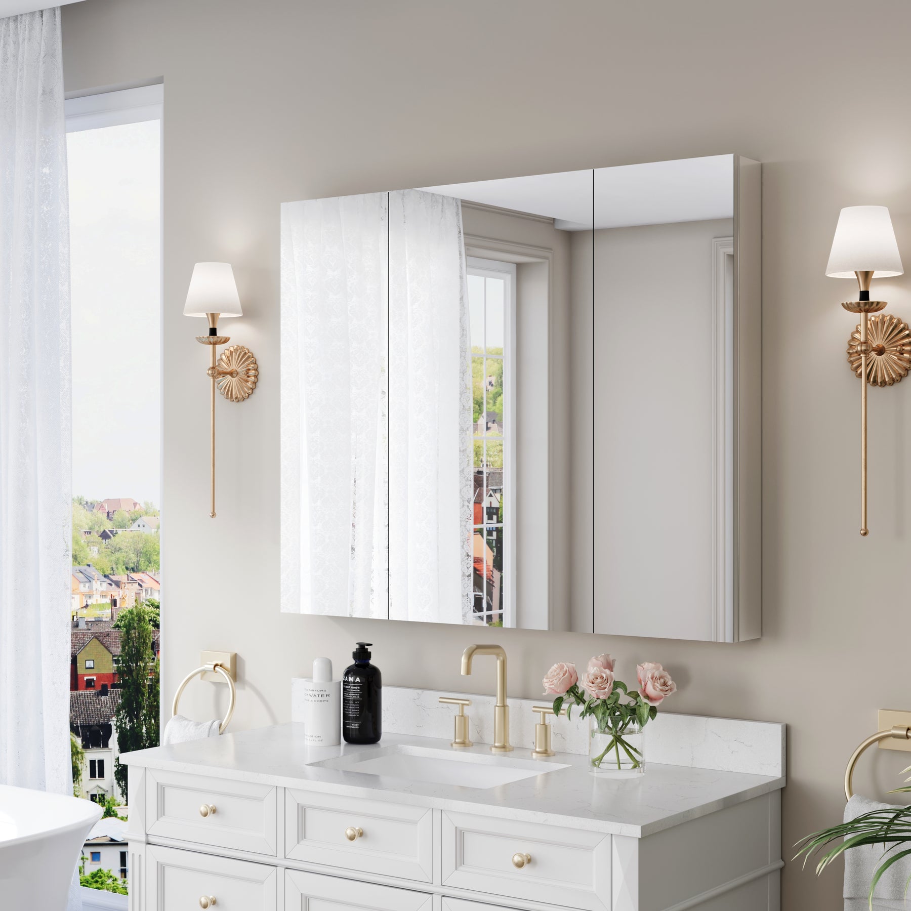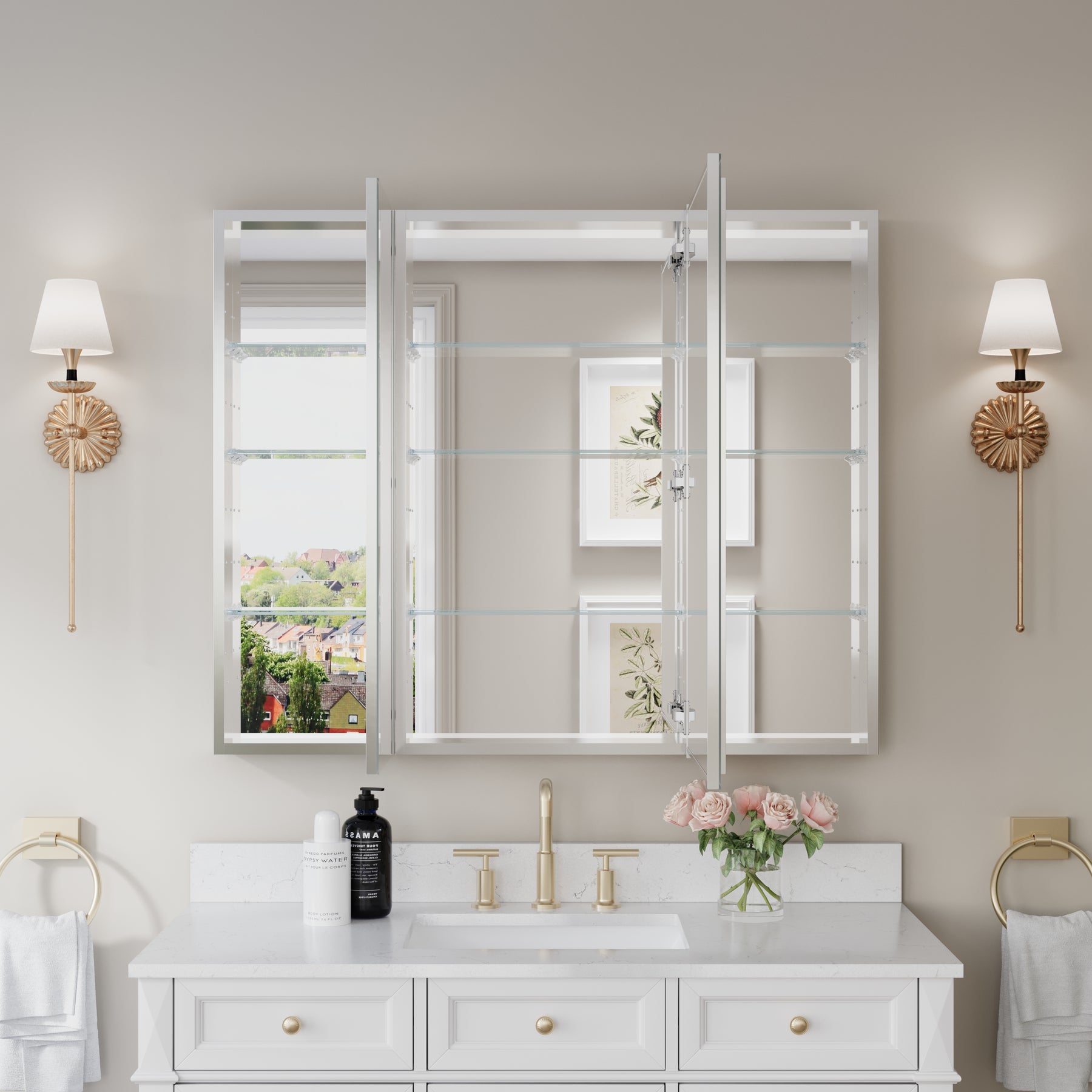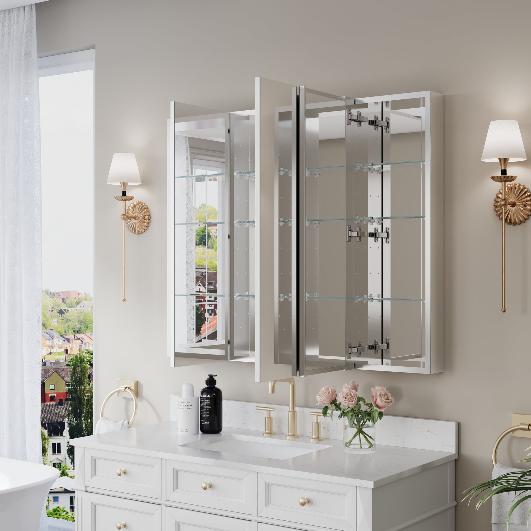 44 in. ×36 in. Copper-Free Tri-Views Mirror Medicine Cabinet with Adjustable Shelves and 3 Doors
