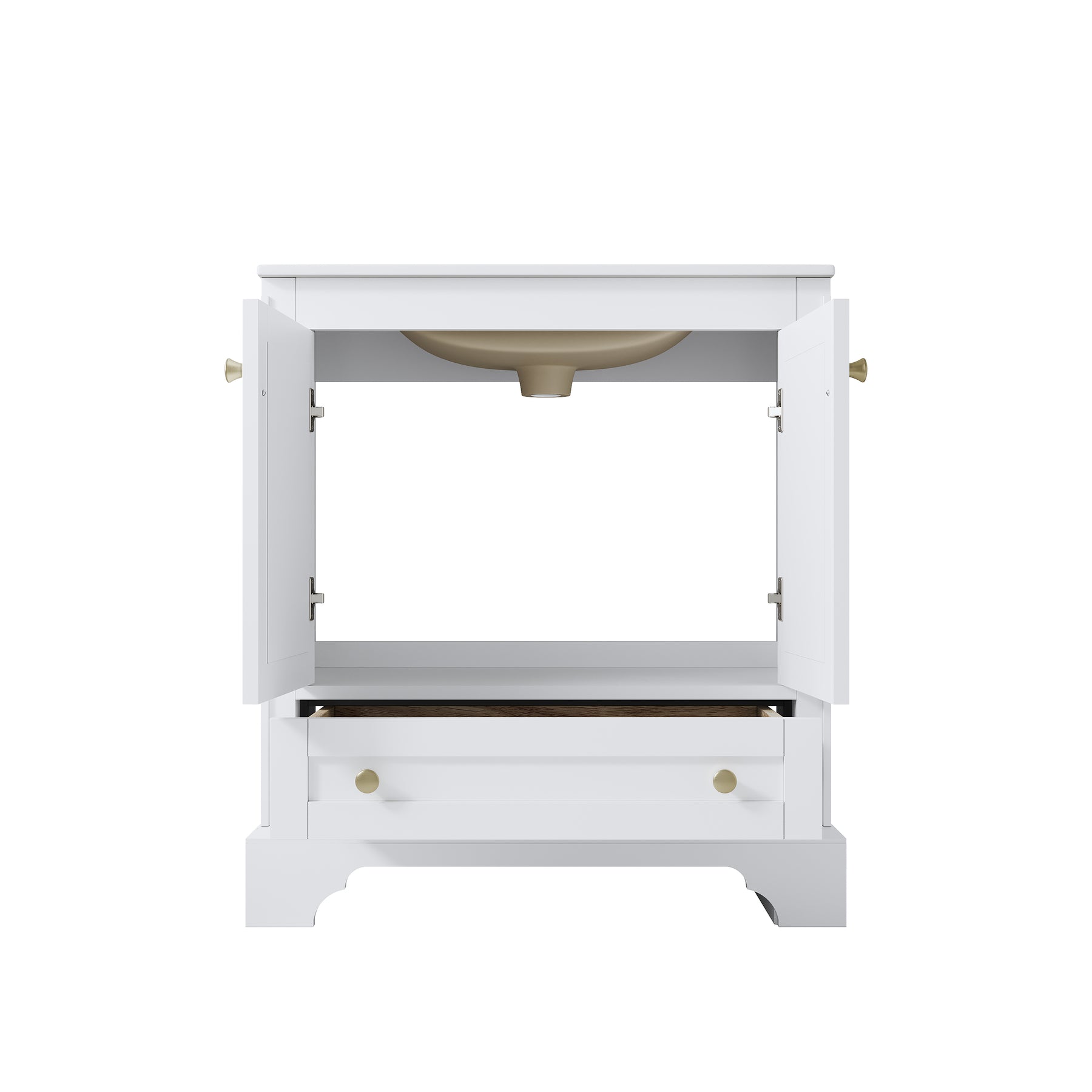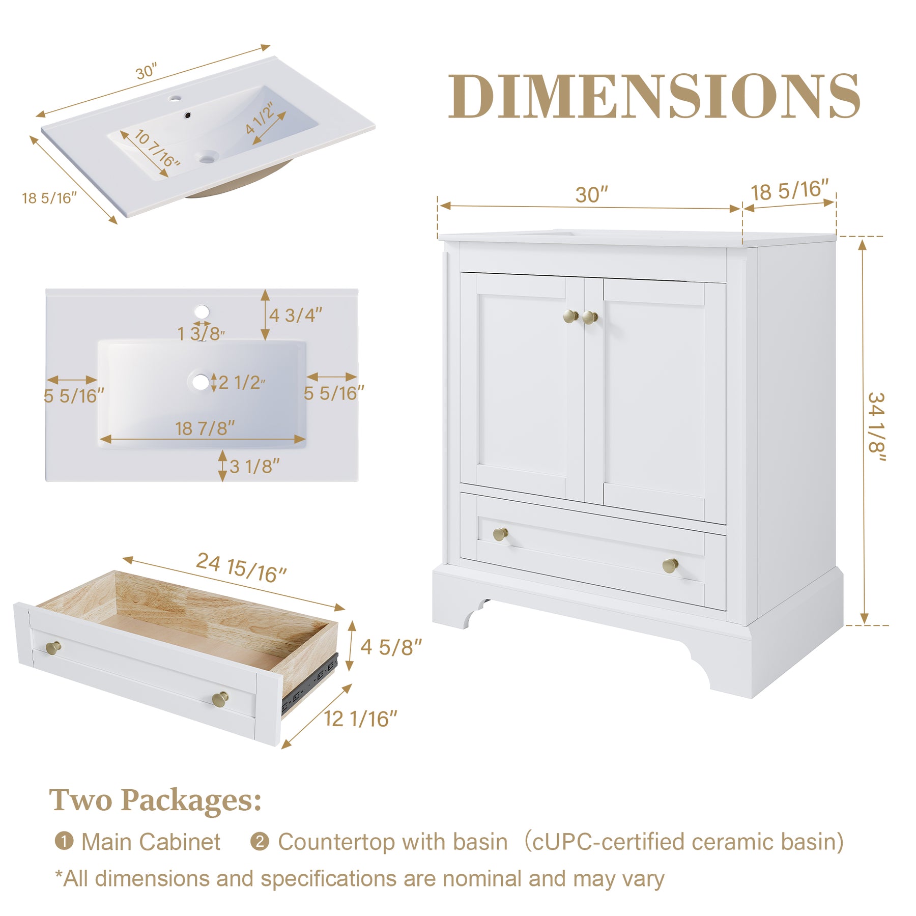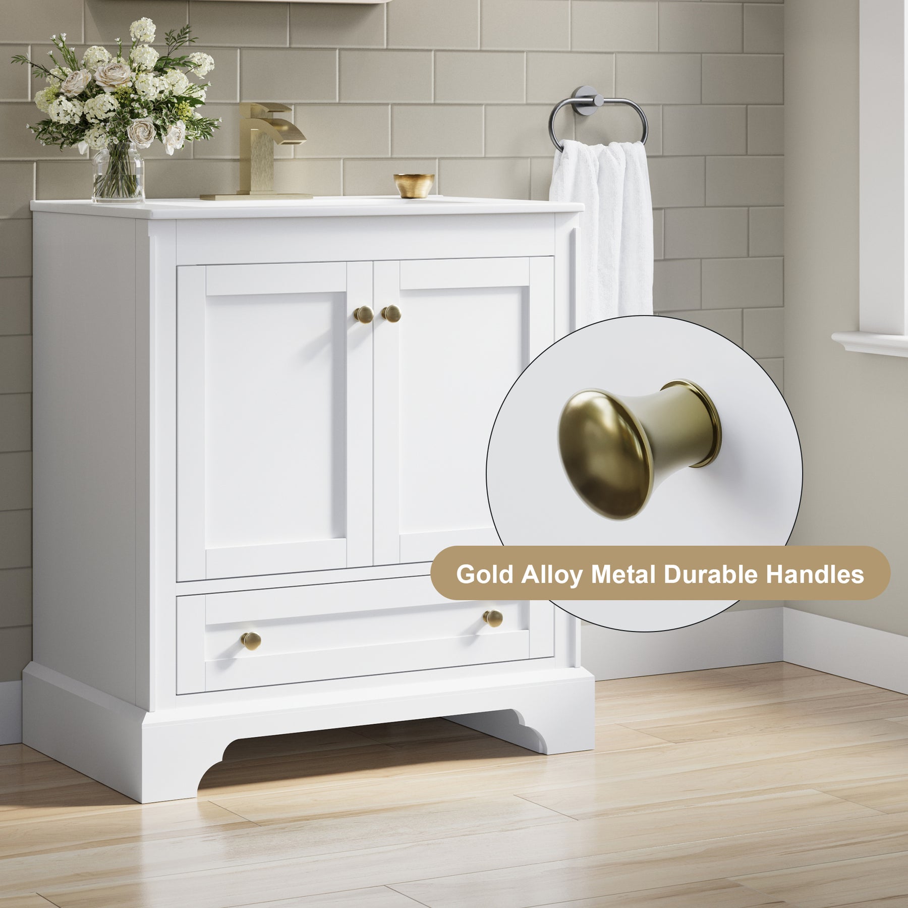 - Ample Storage Space: This single-basin bathroom cabinet comes with 2 soft-close doors and 1 drawer—ensuring no annoying noise during use, for a smooth, quiet experience. The drawer slides are DTC metal-made, paired with golden handles. This modern style cabinet delivers a superior feel that ordinary bathroom cabinets can hardly match.