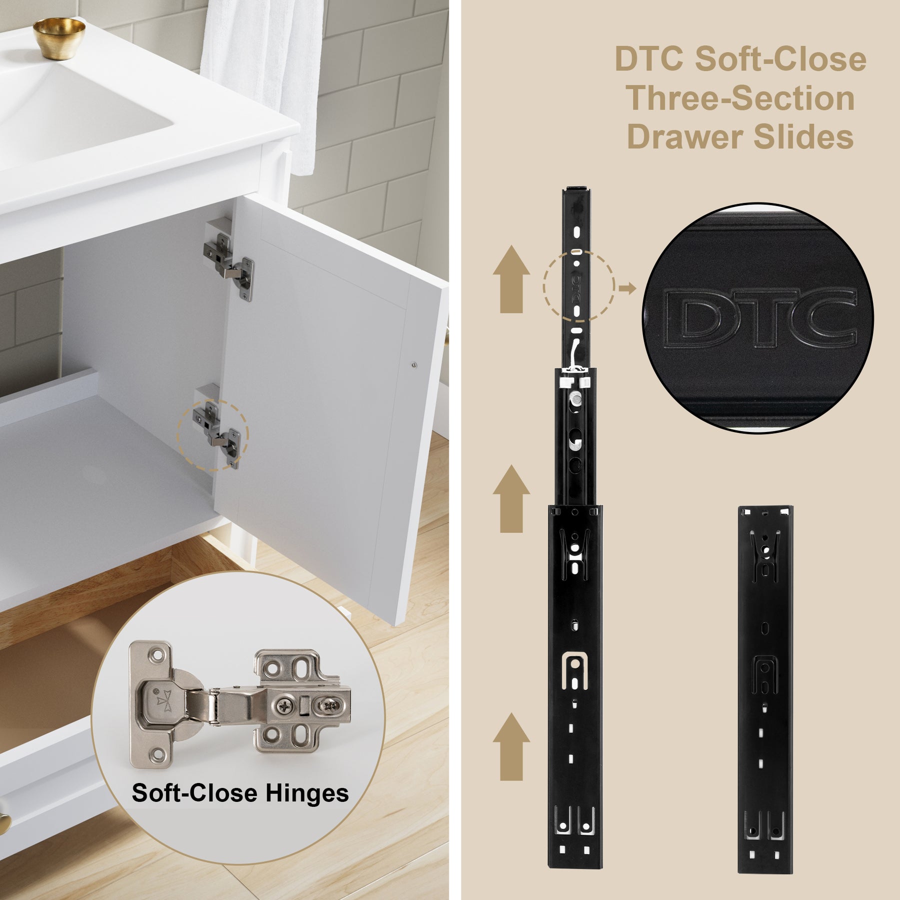 - Hardware Material: DTC soft-closing three-section drawer slides and soft-closing door hinges