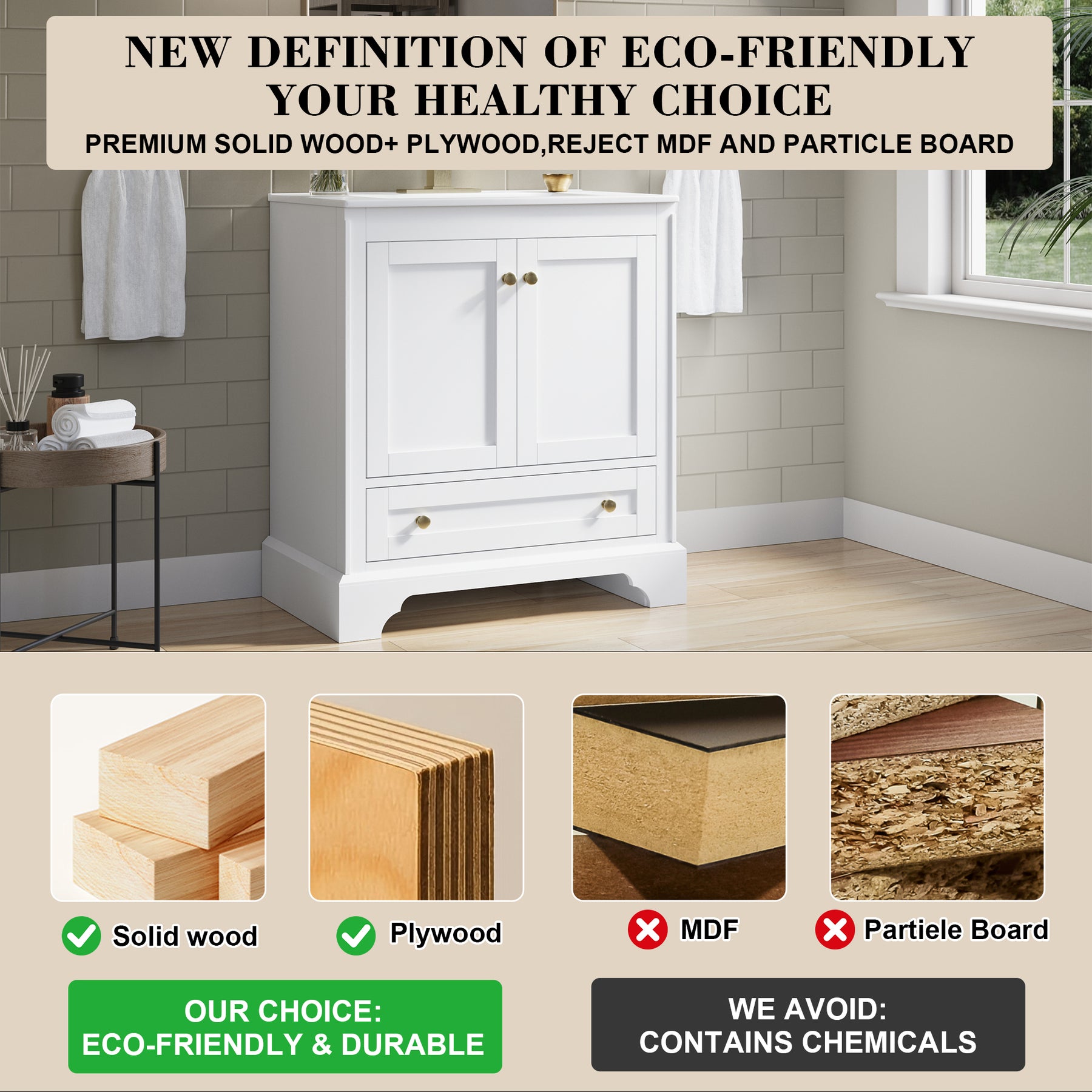 Premium Solid Wood Structure: Crafted from solid wood and plywood material for outstanding durability and moisture resistance, ensuring a long-lasting and stable vanity. 100% free of MDF and particle board for a healthier, stronger, and more eco-friendly bathroom solution.