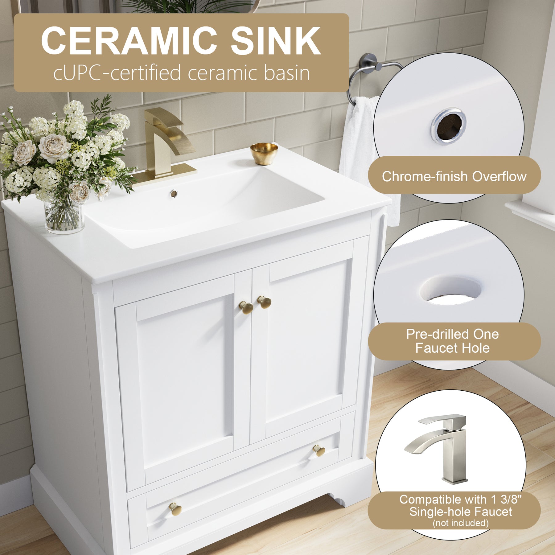 - Upgrade Ceramic Material Basin: Our bathroom vanity with sink include a premium cUPC-certified ceramic basin for easy maintenance and lasting shine. Features pre-drilled faucet hole and a drain hole, making it easy to install your faucet and drainage system.