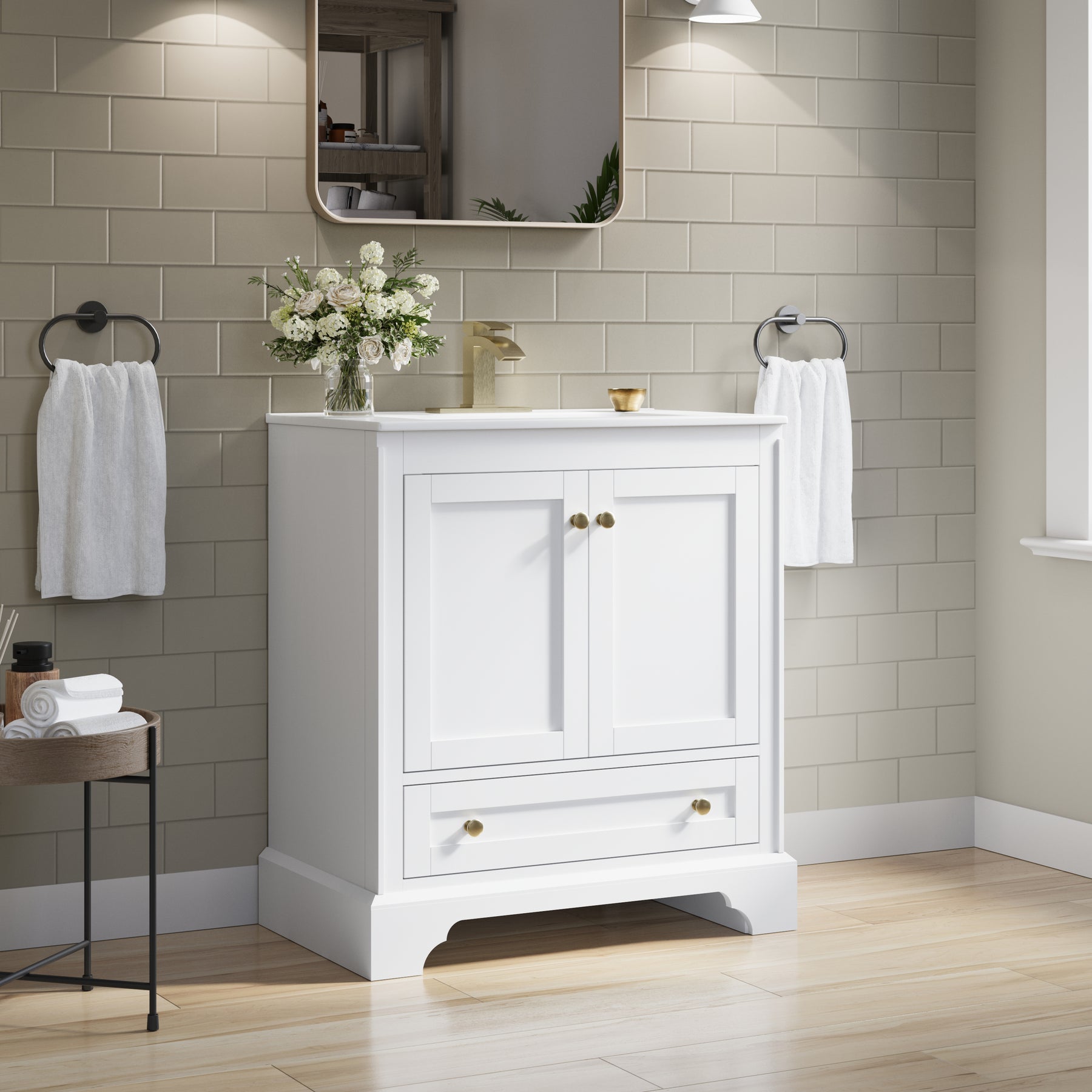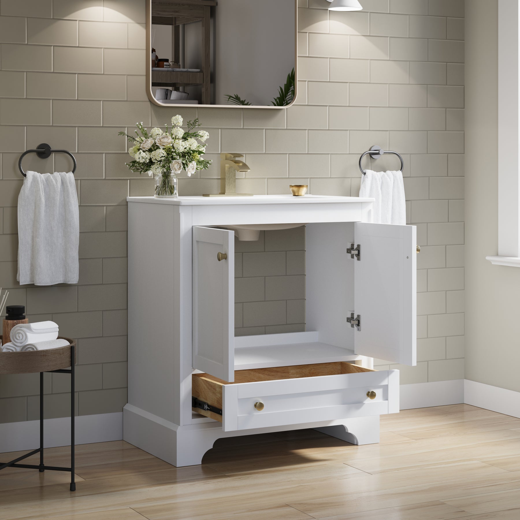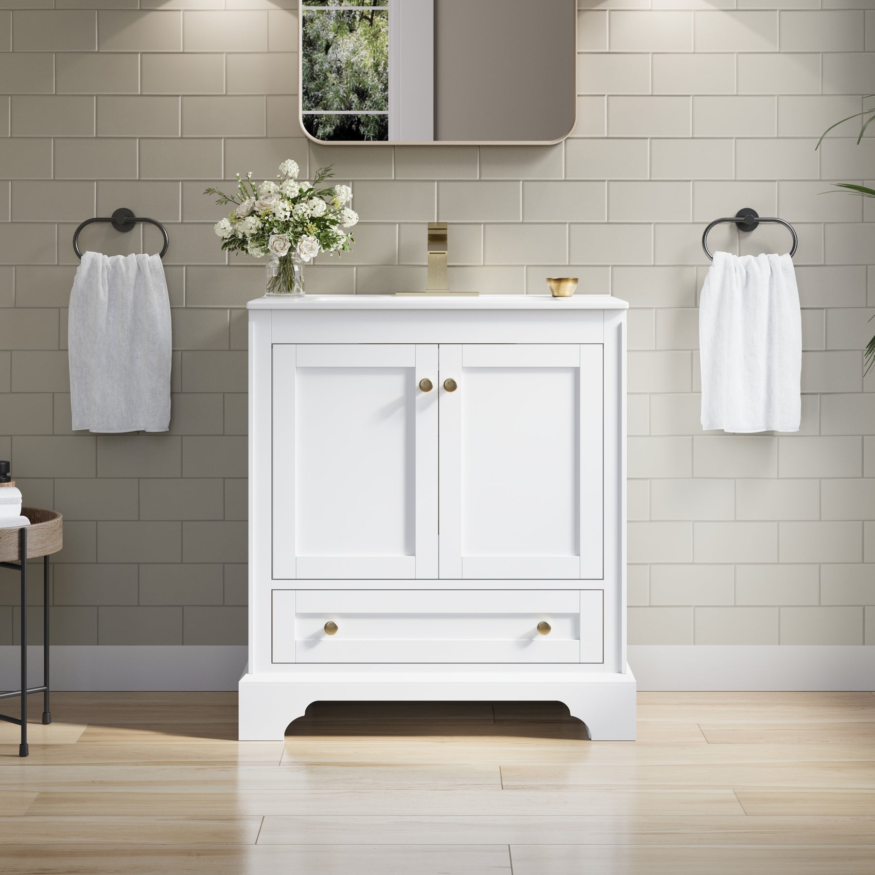 - Versatile and Functional: This 30-inch white bathroom vanity set fits beautifully in both small and large bathrooms. Its compact footprint and smart storage layout help you make the most of limited space, while the generous storage capacity and elegant design also make it a stylish choice for spacious bathrooms.