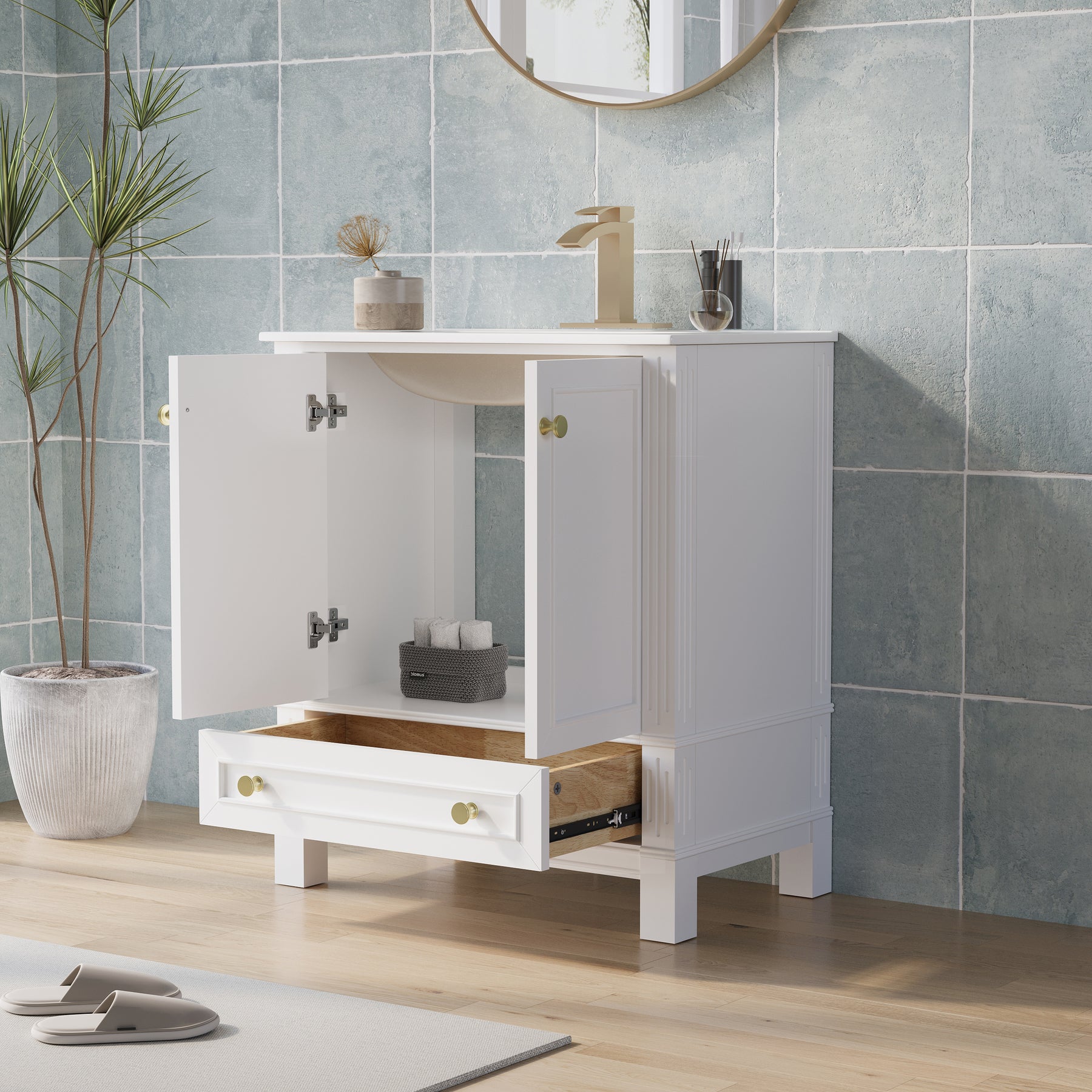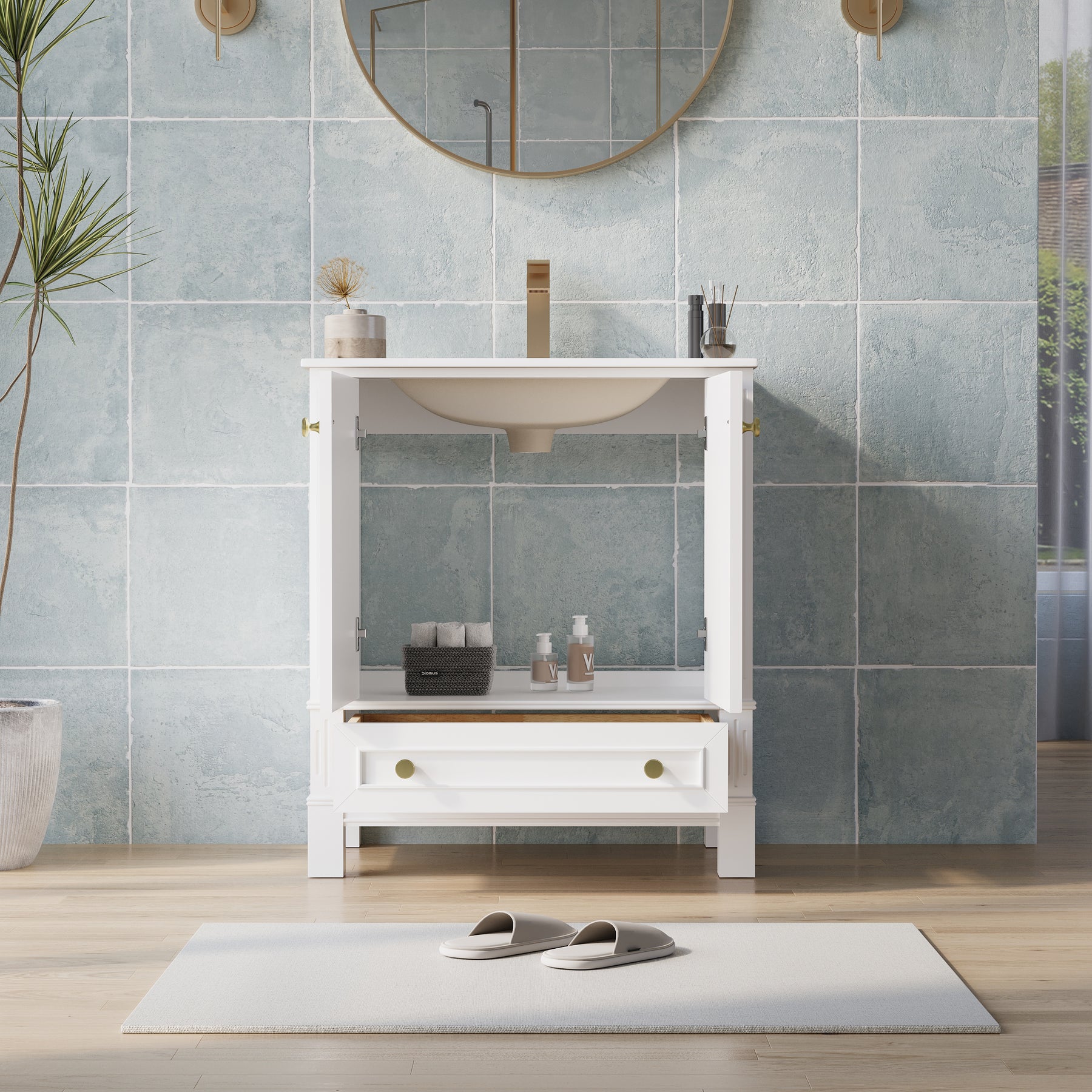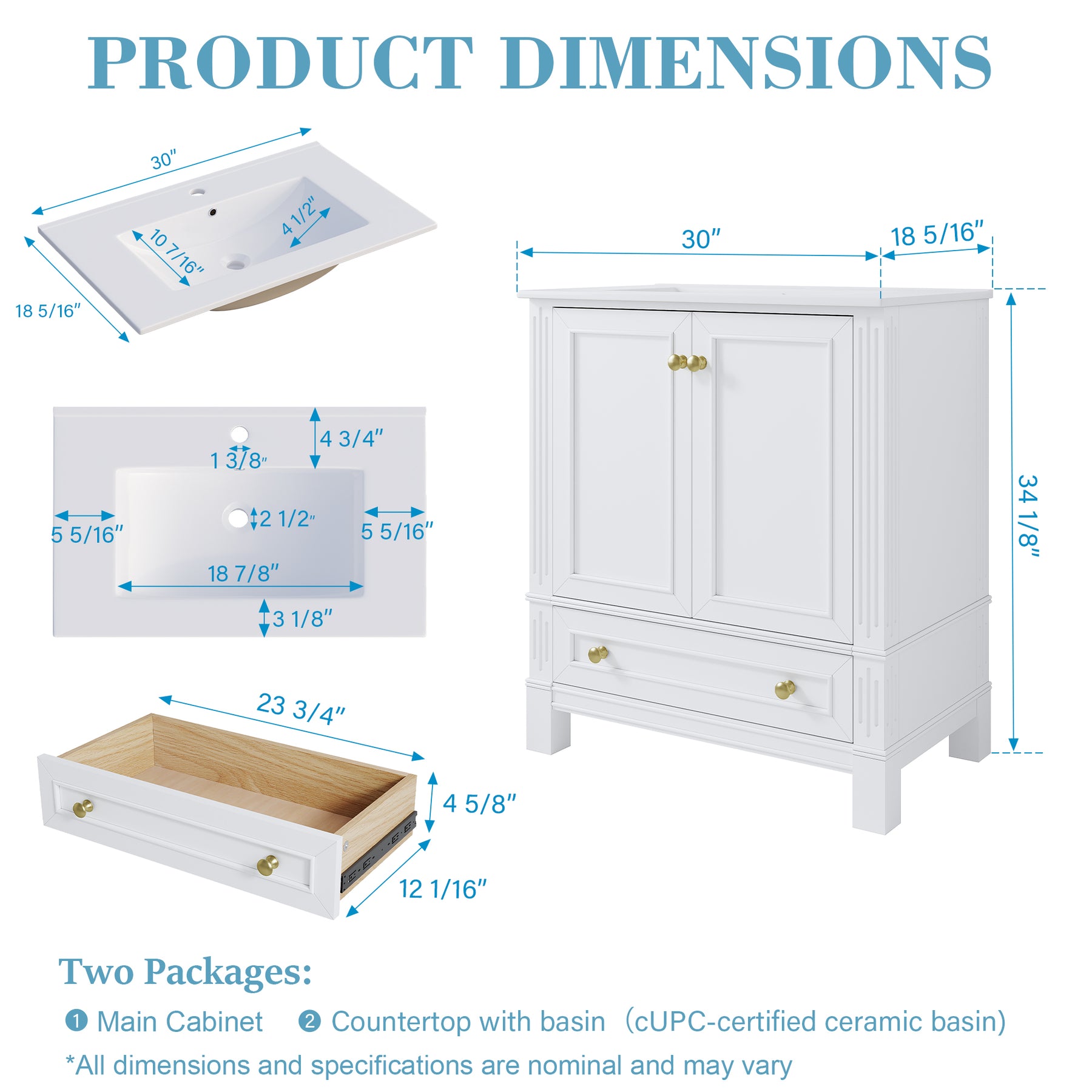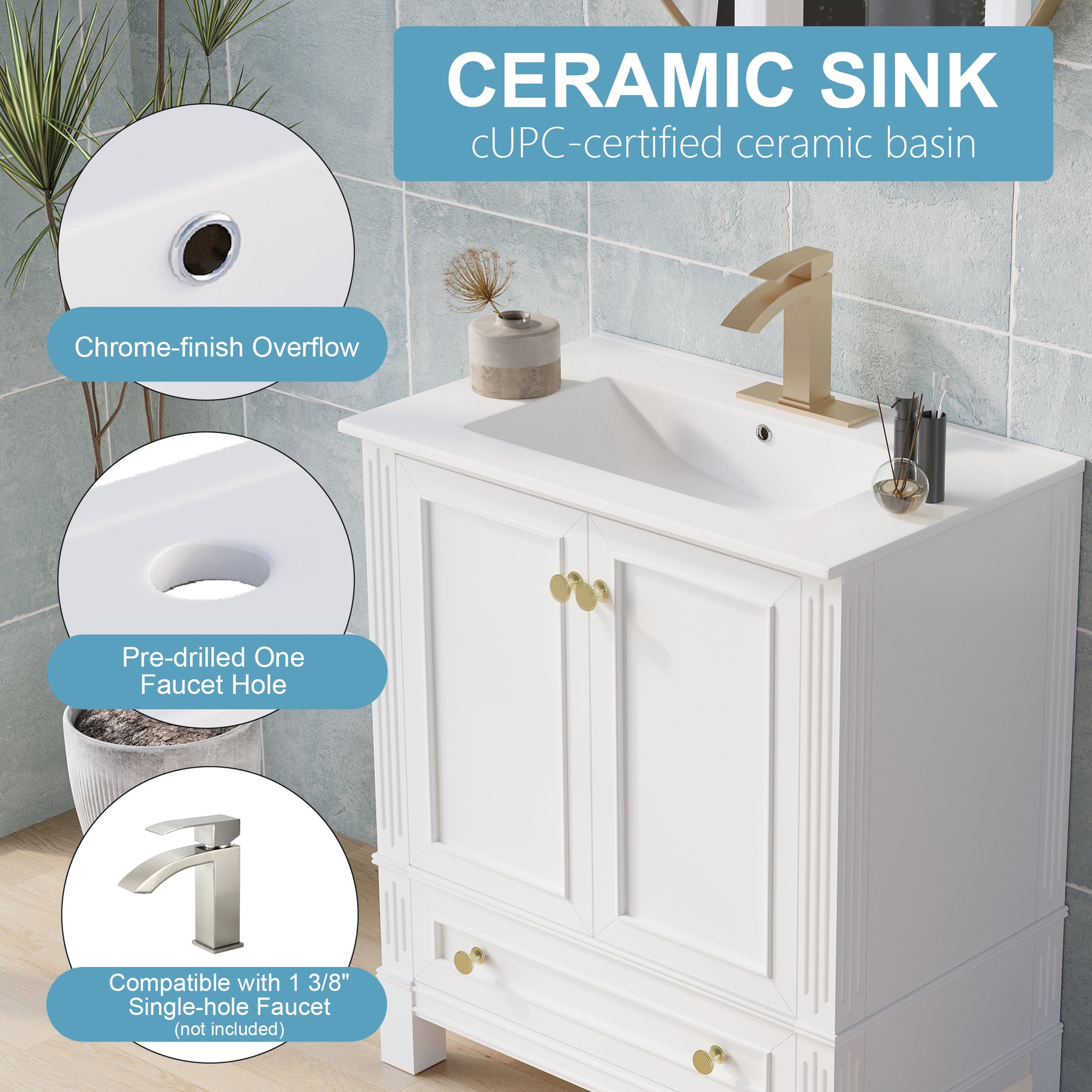 - Maximize Storage Space: The white bathroom vanity with ceramic basin features 1 drawer and 2 doors, providing convenient storage for daily essentials such as tissues, towels, and shower gel. Easy to access and well-organized, it offers ample storage even in compact spaces.