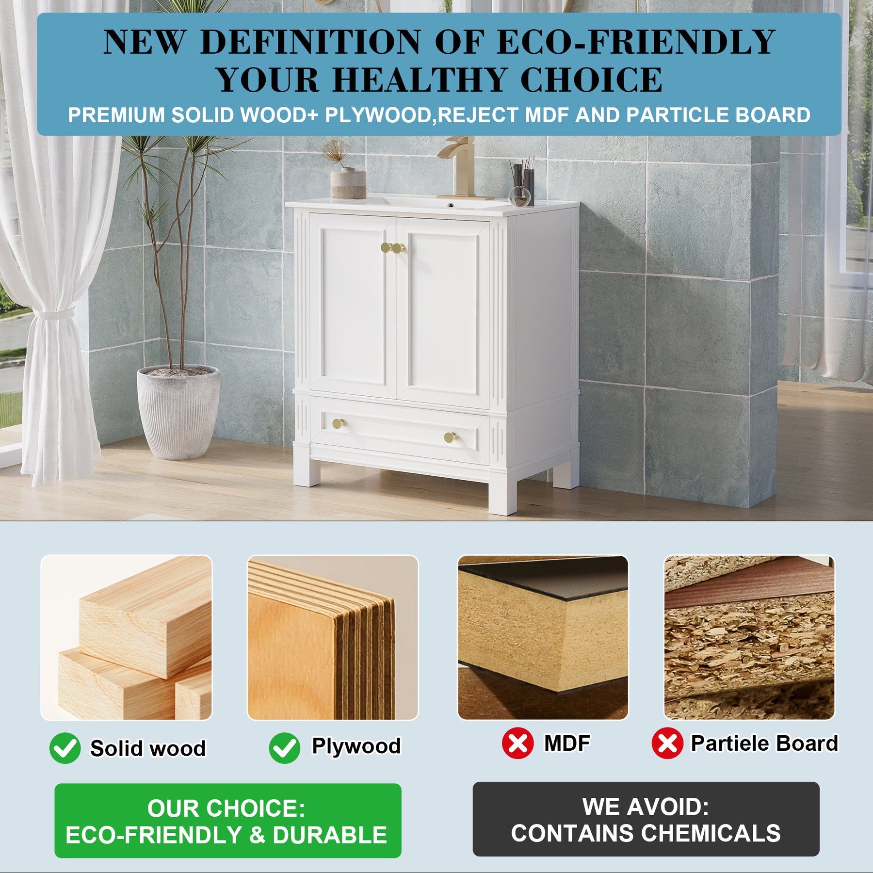 - Premium Solid Wood Construction: Built with a robust combination of solid wood and plywood, this bathroom vanity delivers exceptional durability, stability, and moisture resistance. Completely free of MDF and particle board, it offers a healthier, stronger, and more eco-friendly choice for your bathroom.