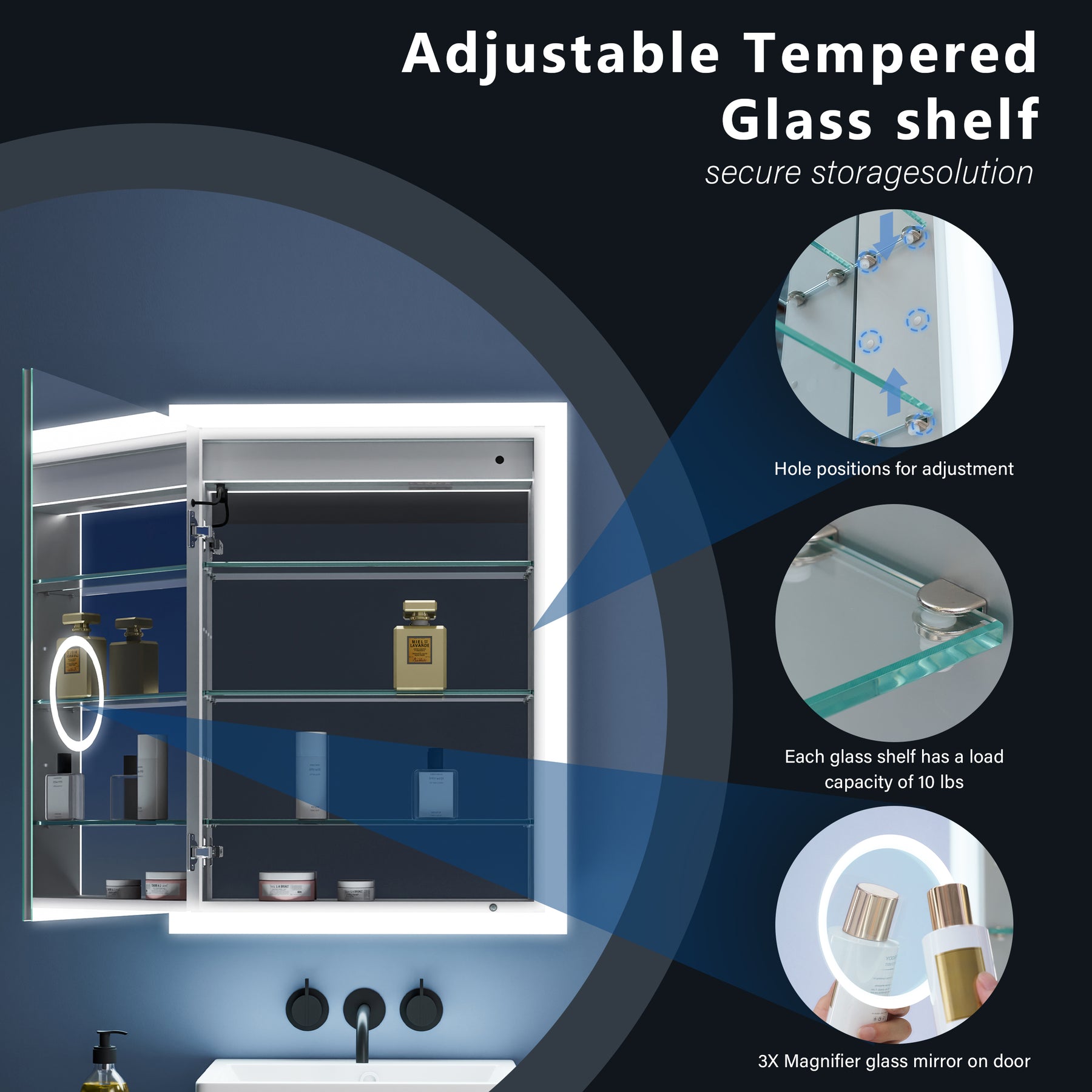 Illuminate & Organize: Adjustable brightness and color temperature, defogging, and night light keep your space clear. Crafted from durable glass with adjustable shelves for easy organization.