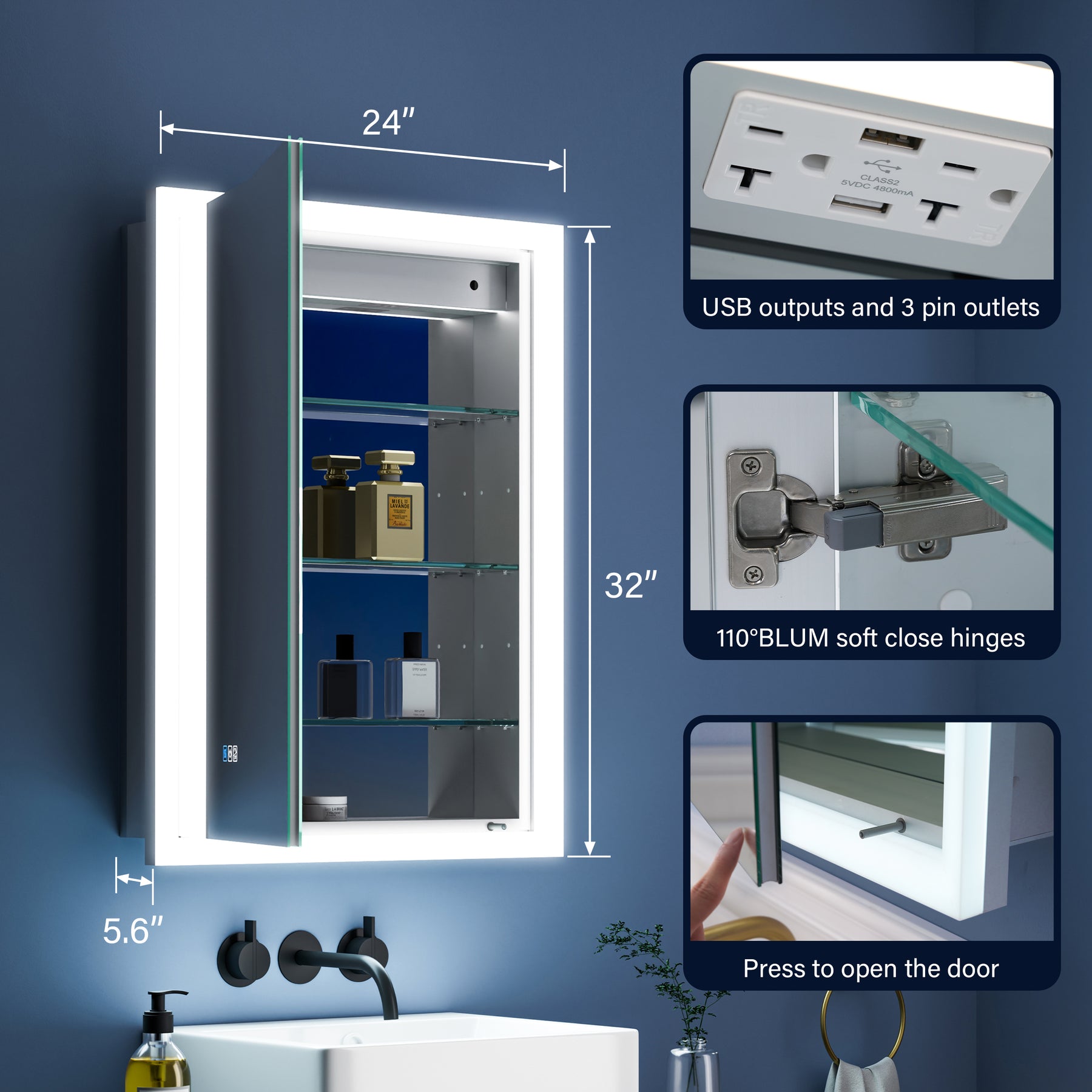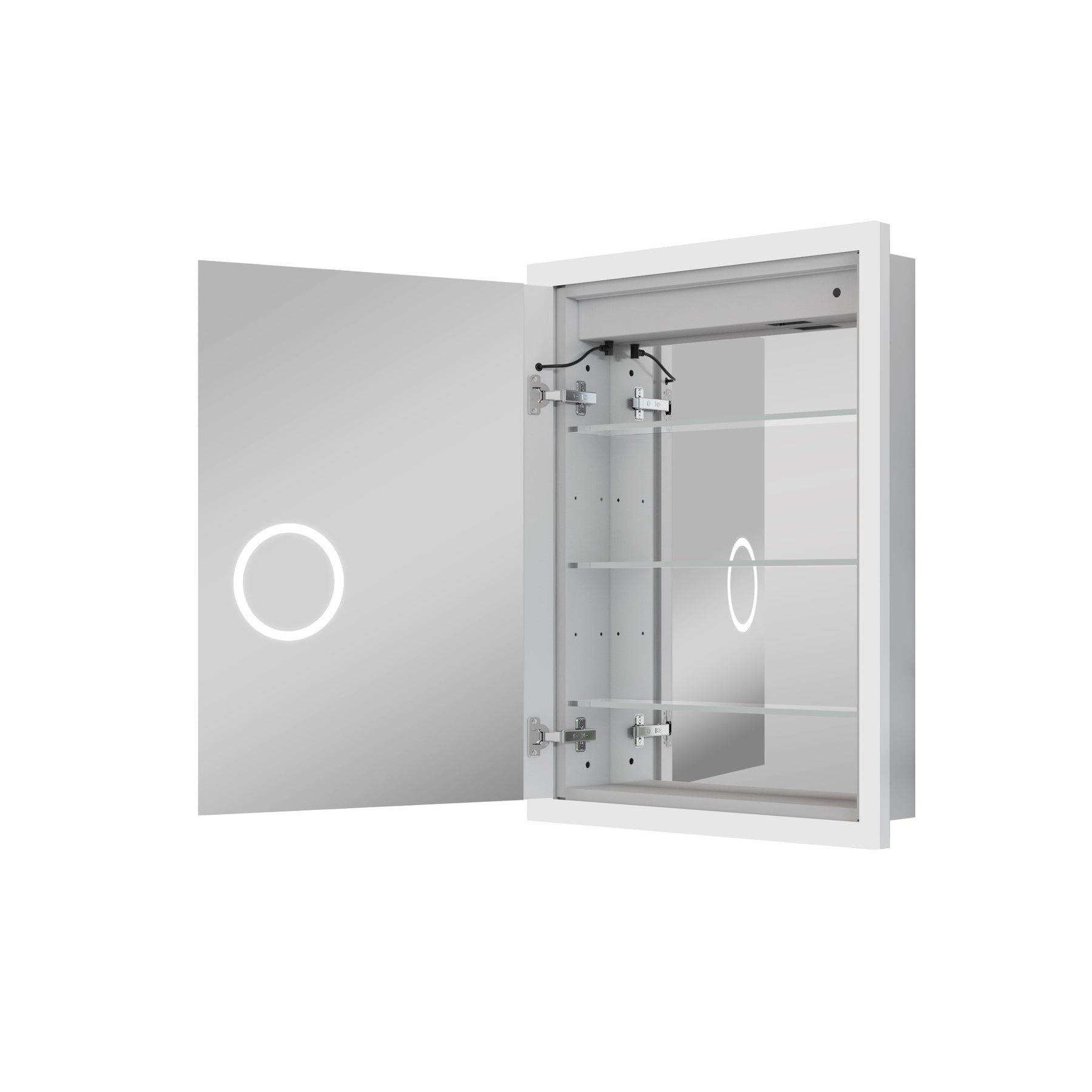 Introducing our sleek AURORA medicine cabinet with adjustable lighting (3000-6000K) and essential features like power outage memory and defogging. Equipped with USB and US plug options, it's crafted from durable 8mm tempered glass with adjustable shelves. Easy control via triple-touch interface, and flexible installation with hanging bars or mounting plates. Includes bright light strip and triple magnifying mirror. Built-in safety with soft-closing hinges and hardwired connection.