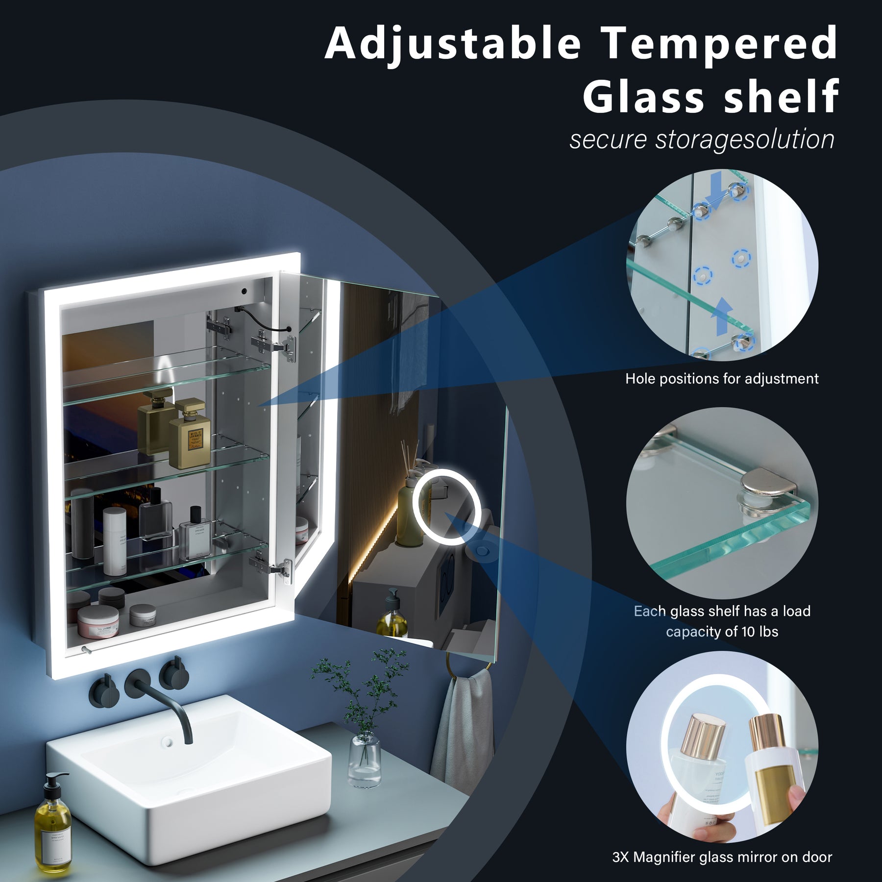 Introducing our sleek AURORA medicine cabinet with adjustable lighting (3000-6000K) and essential features like power outage memory and defogging. Equipped with USB and US plug options, it's crafted from durable 8mm tempered glass with adjustable shelves. Easy control via triple-touch interface, and flexible installation with hanging bars or mounting plates. Includes bright light strip and triple magnifying mirror. Built-in safety with soft-closing hinges and hardwired connection.