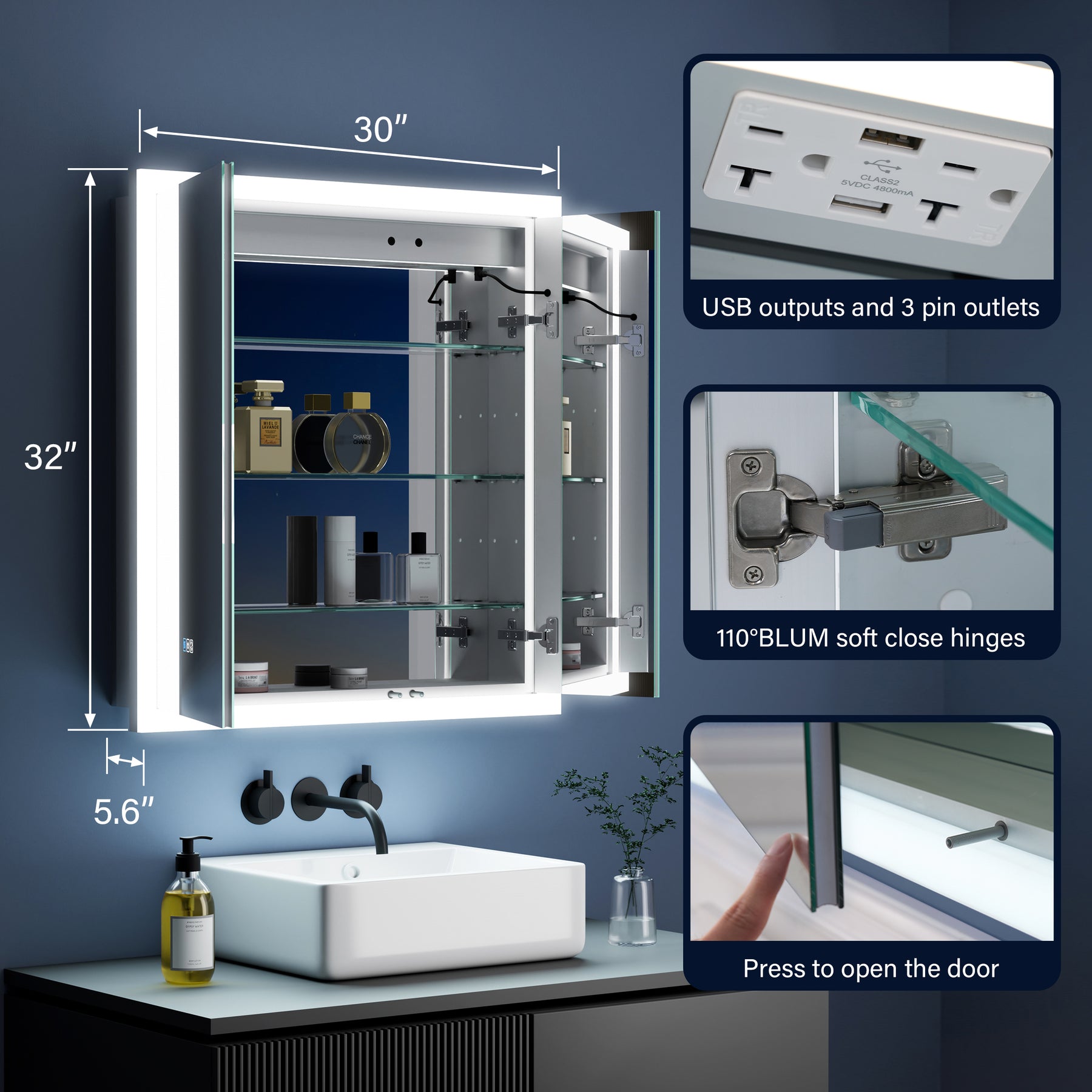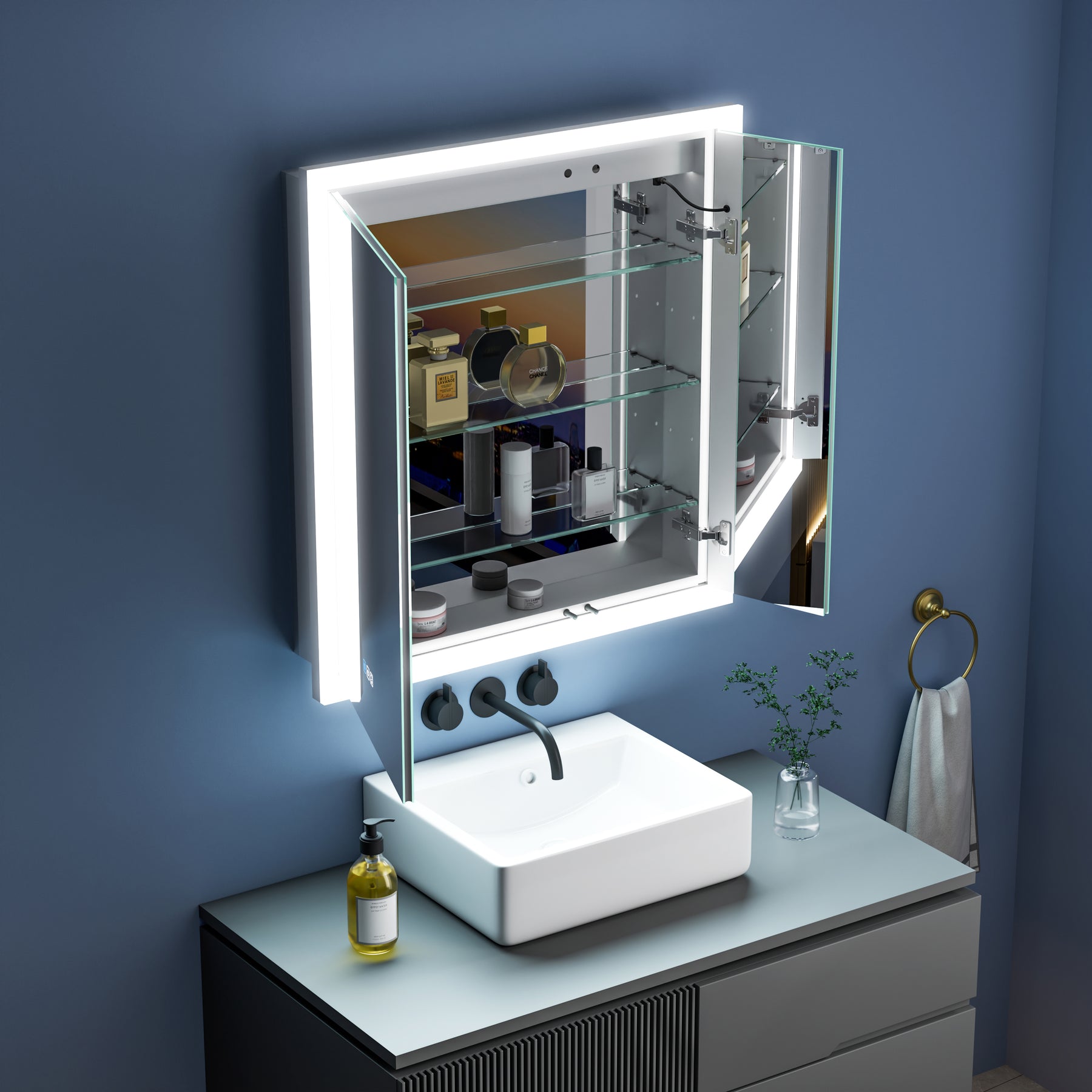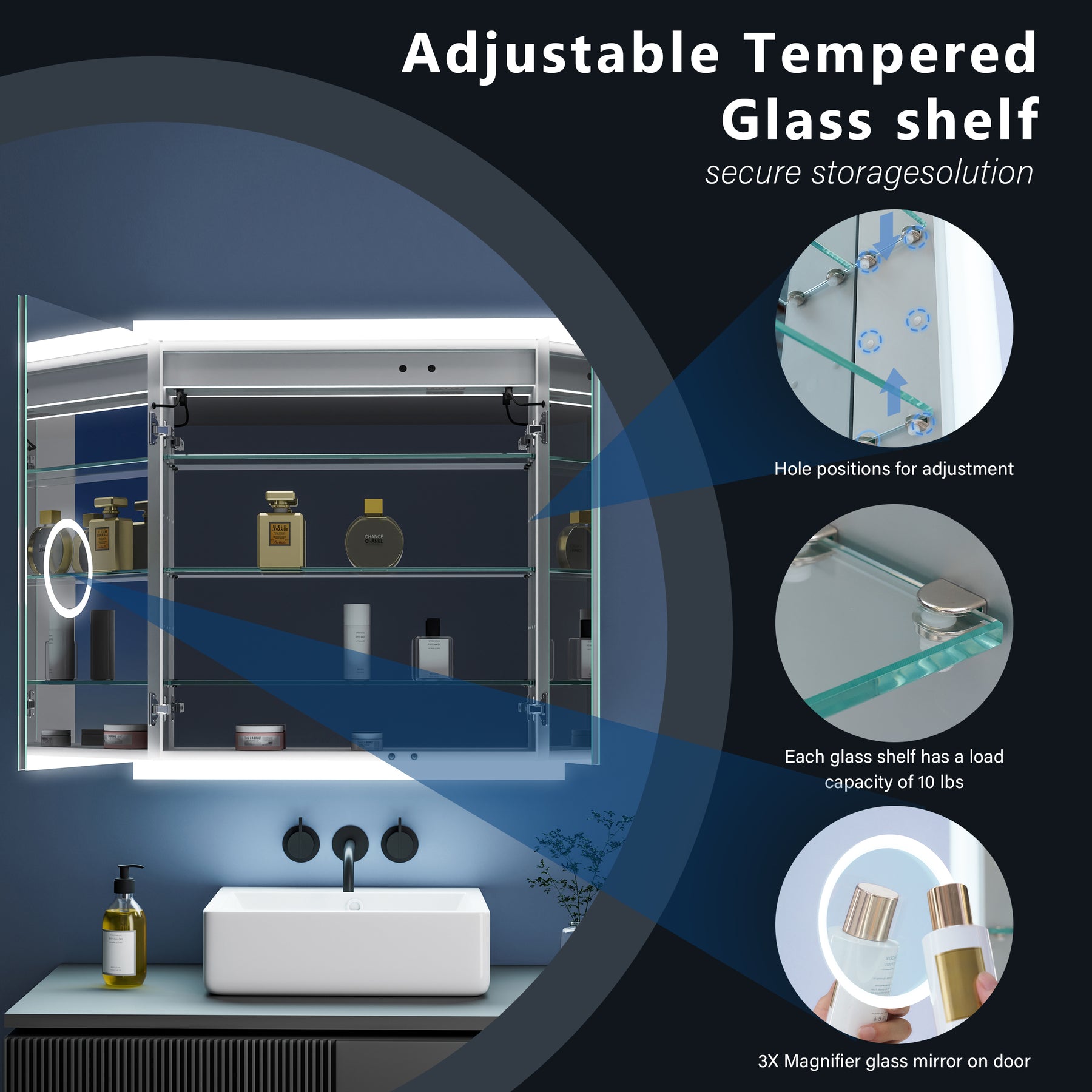 Introducing our sleek AURORA medicine cabinet with adjustable lighting (3000-6000K) and essential features like power outage memory and defogging. Equipped with USB and US plug options, it's crafted from durable 8mm tempered glass with adjustable shelves. Easy control via triple-touch interface, and flexible installation with hanging bars or mounting plates. Includes bright light strip and triple magnifying mirror. Built-in safety with soft-closing hinges and hardwired connection.